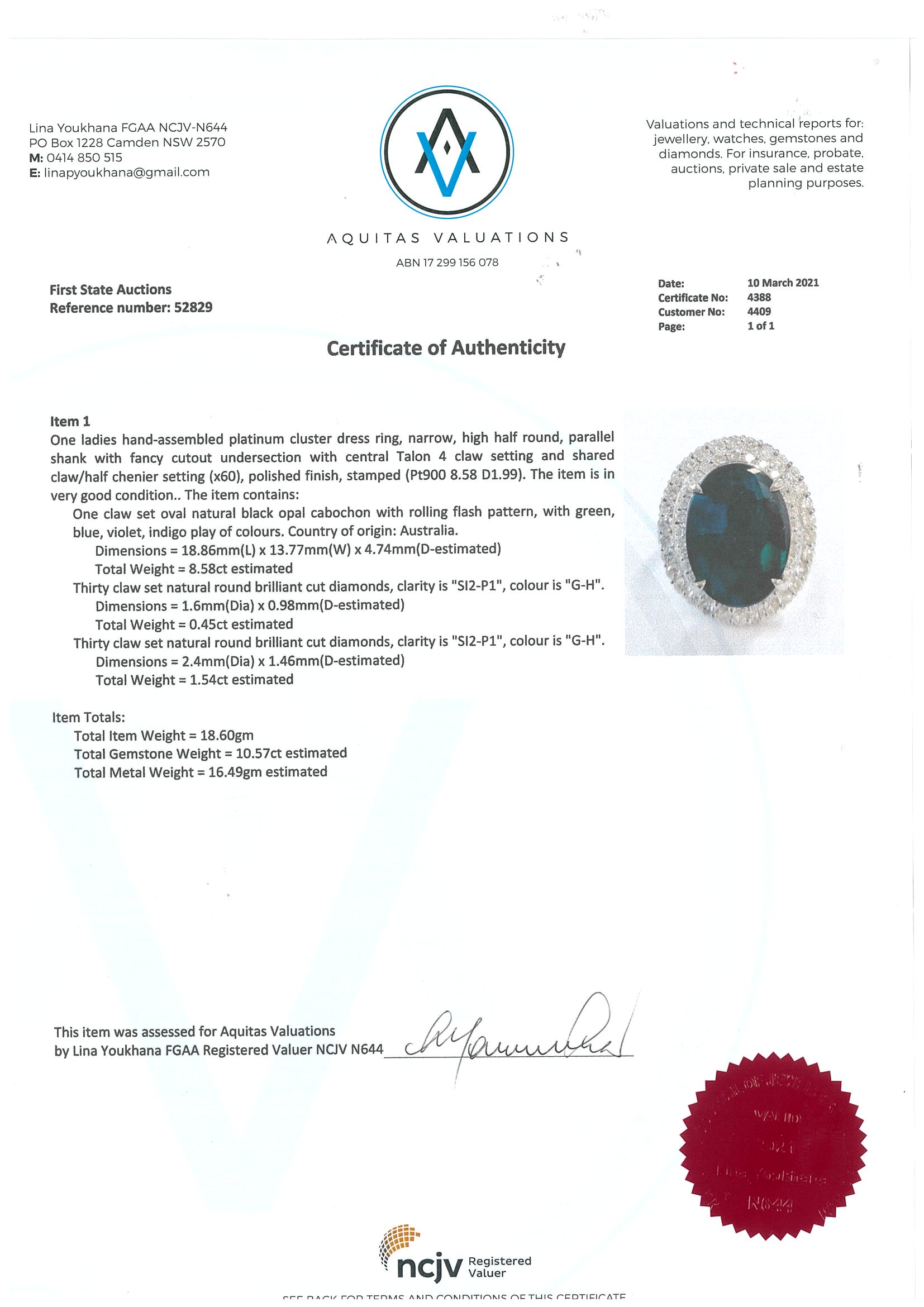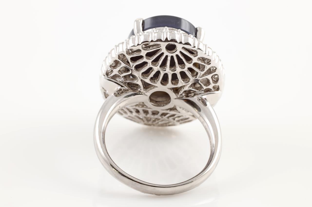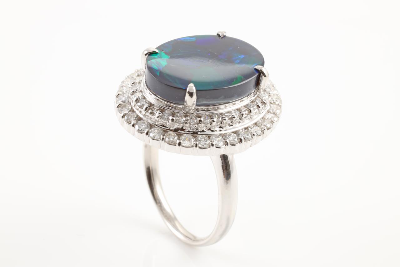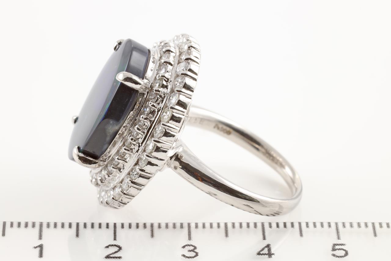 Opal and Diamond ring with oval Black Opal of 8.58ct and round Diamonds totalling 1.99cts (Estimated grading: G-H SI2-P1). Platinum. Ring size: R. Weight: 18.6g With Certificate #4388. (Pre-owned)