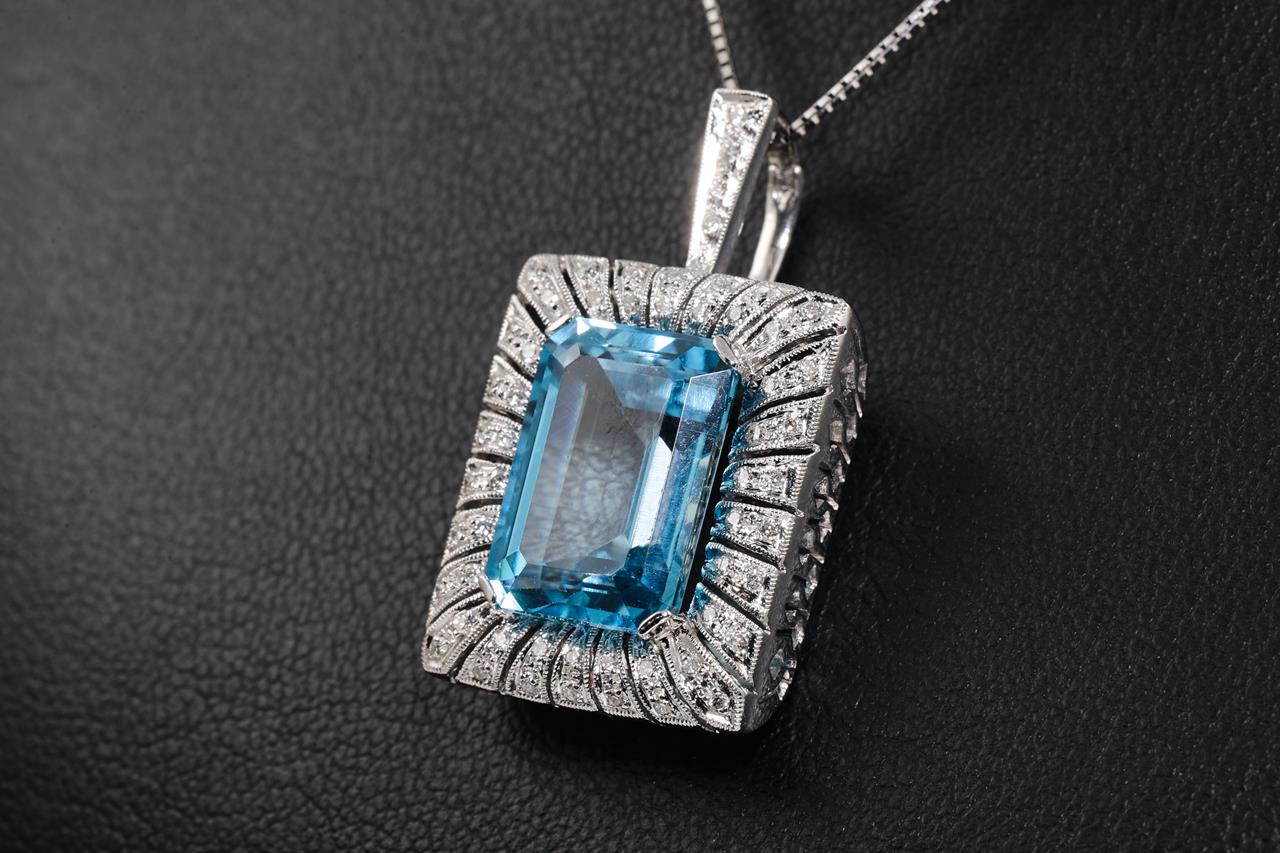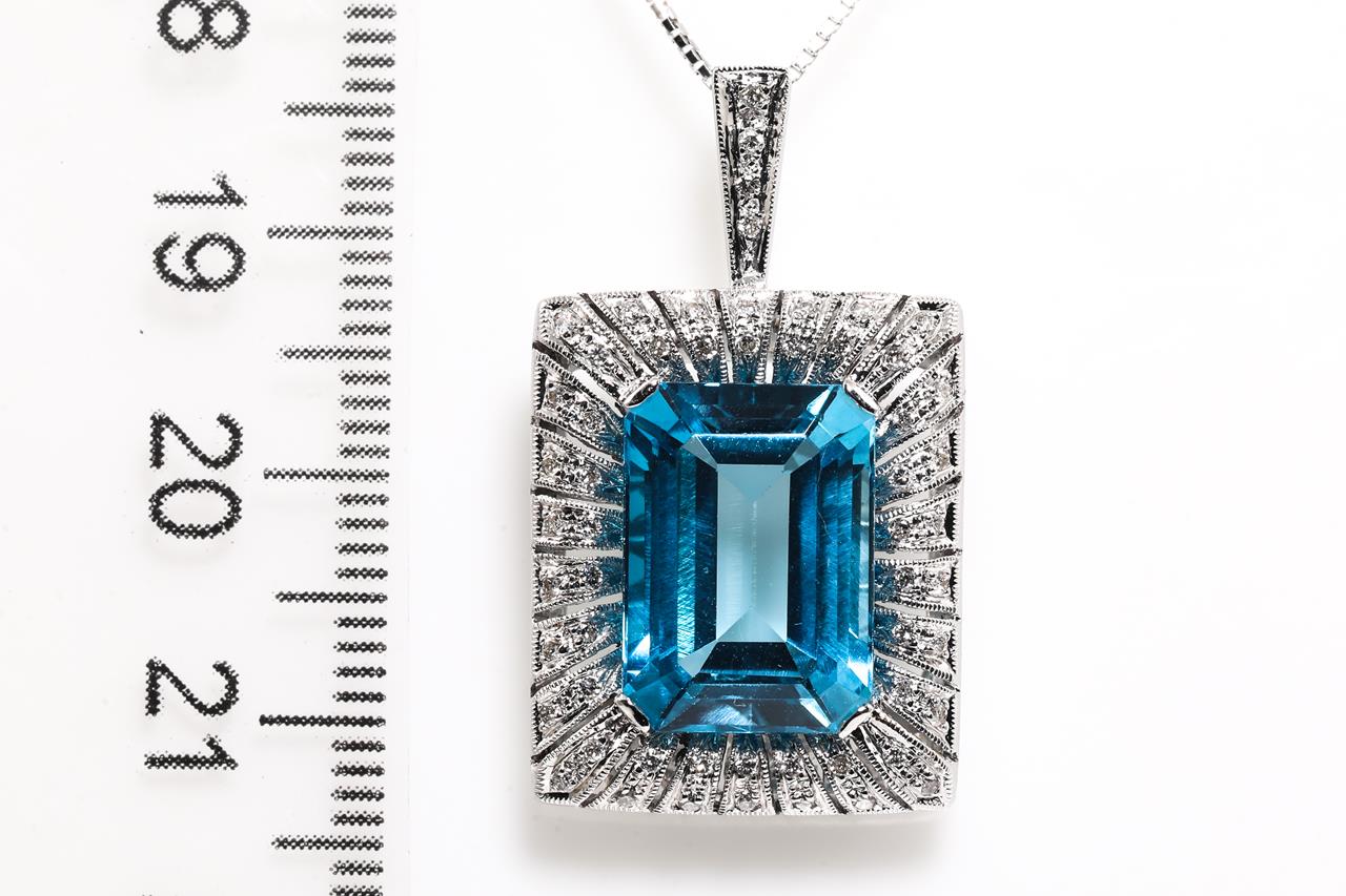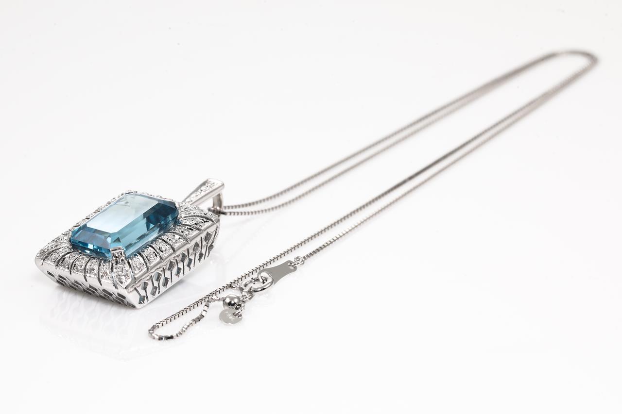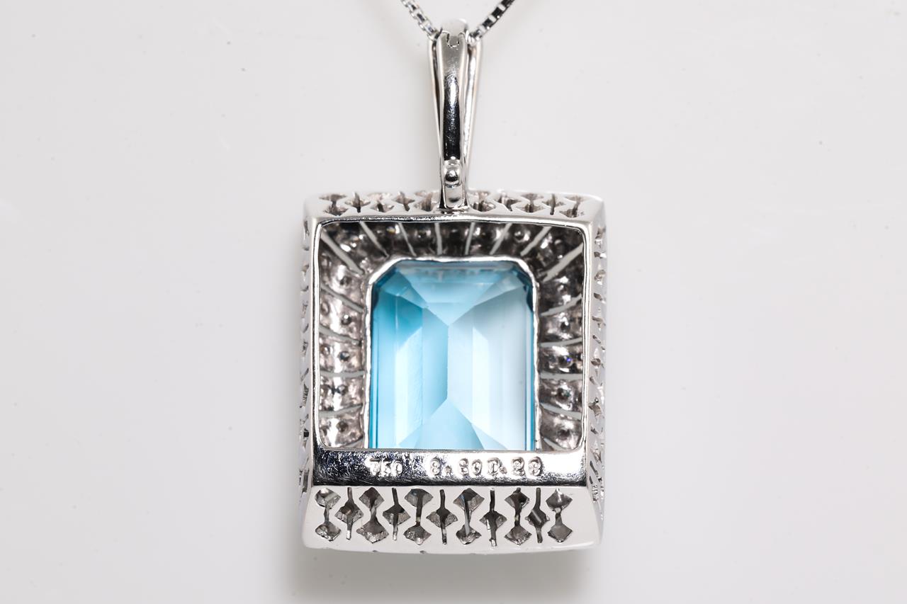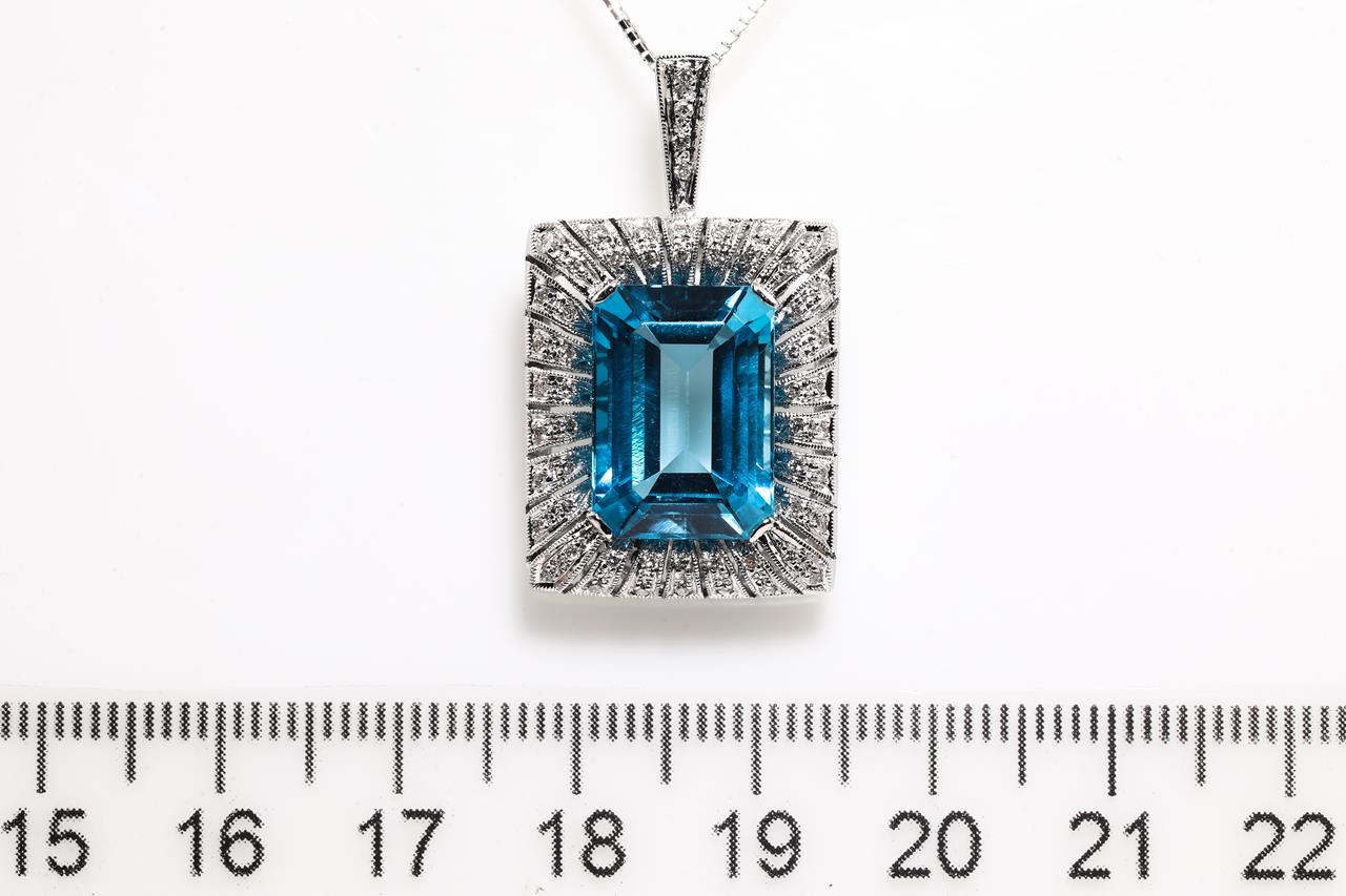 Topaz and Diamond pendant with emerald cut blue Topaz of 8.60ct and round Diamonds totalling 0.28cts. 18ct white gold with 44cm adjustable chain. Weight: 10.0g (Pre-owed)