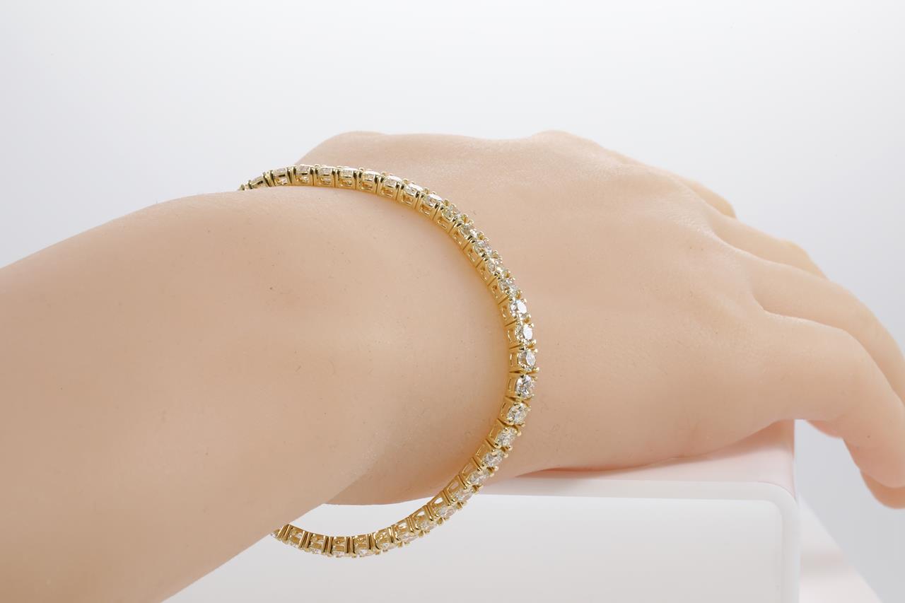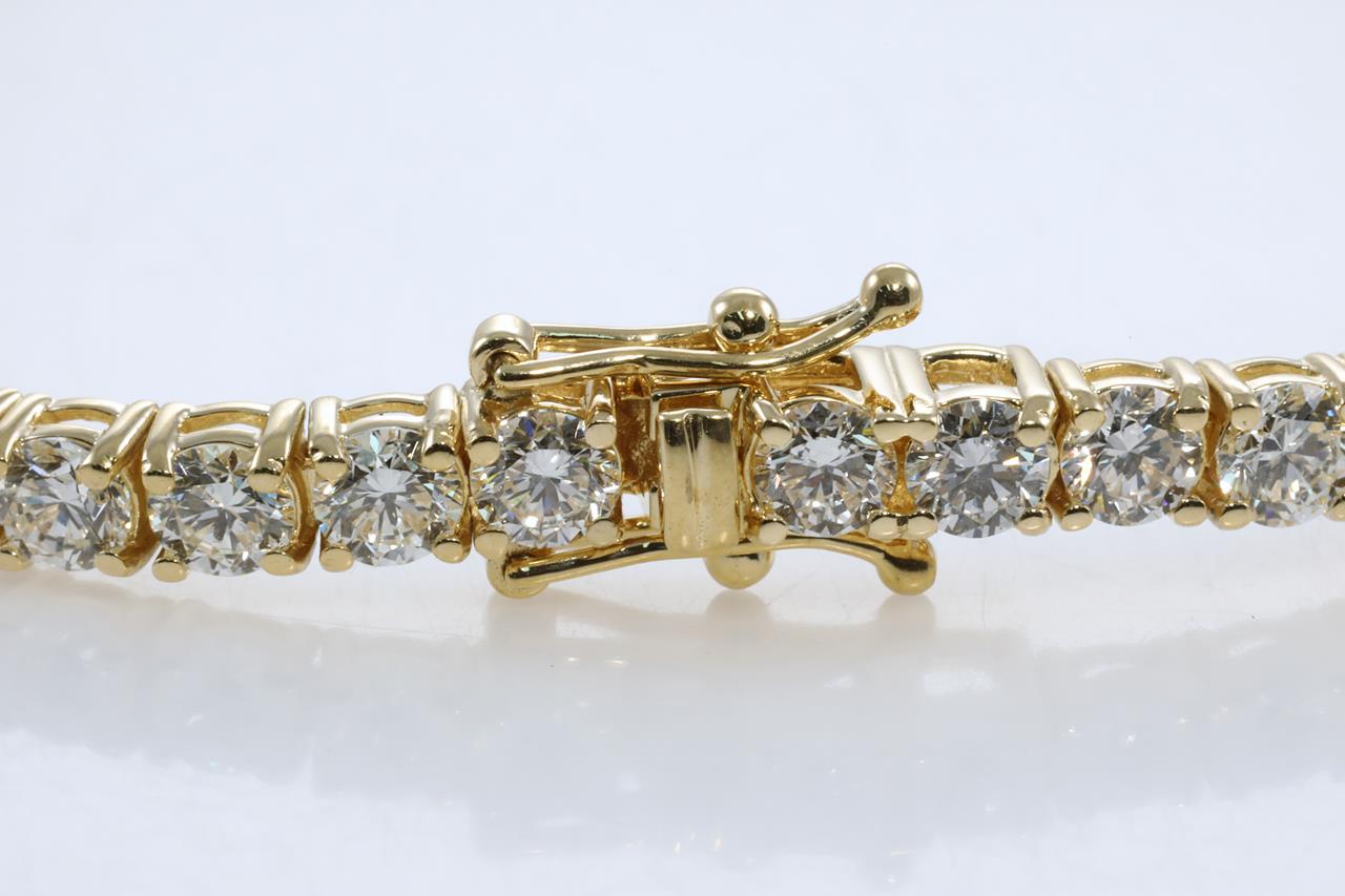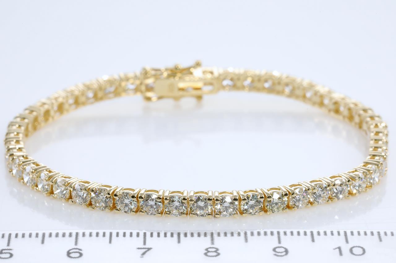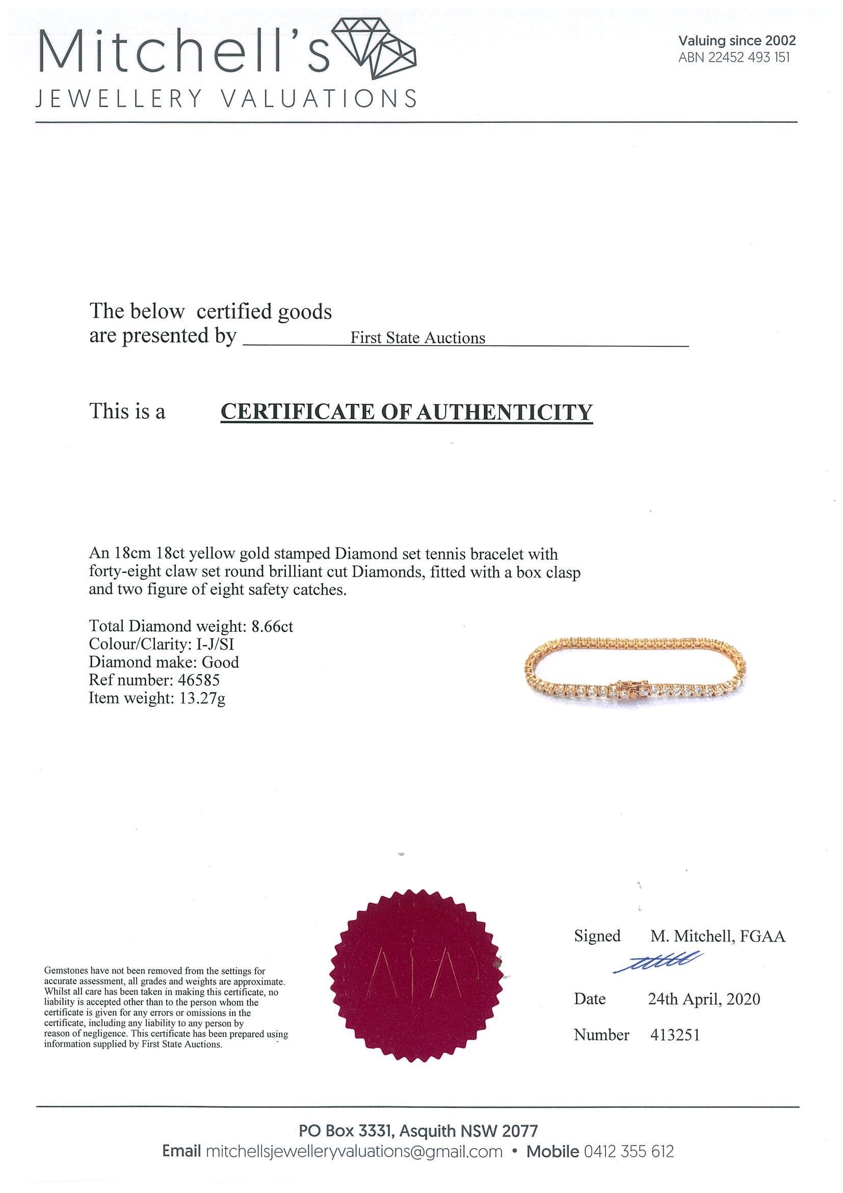 Diamond tennis bracelet with 48 round Diamonds totalling 8.66cts (Estimated grading: I-J SI). 18ct yellow gold, weight: 13.27 grams. Length: 18cm. With certificate #413251 (New)