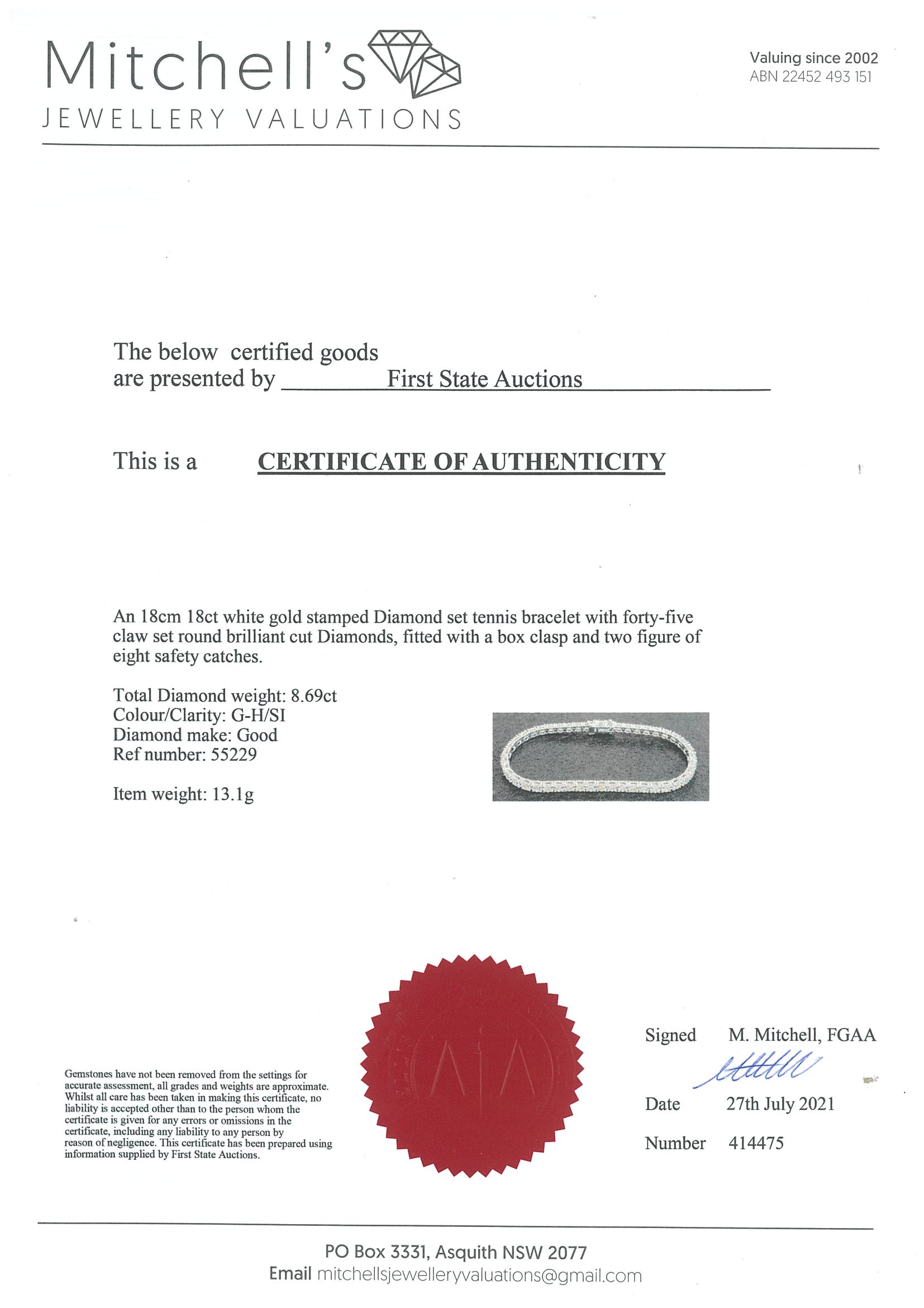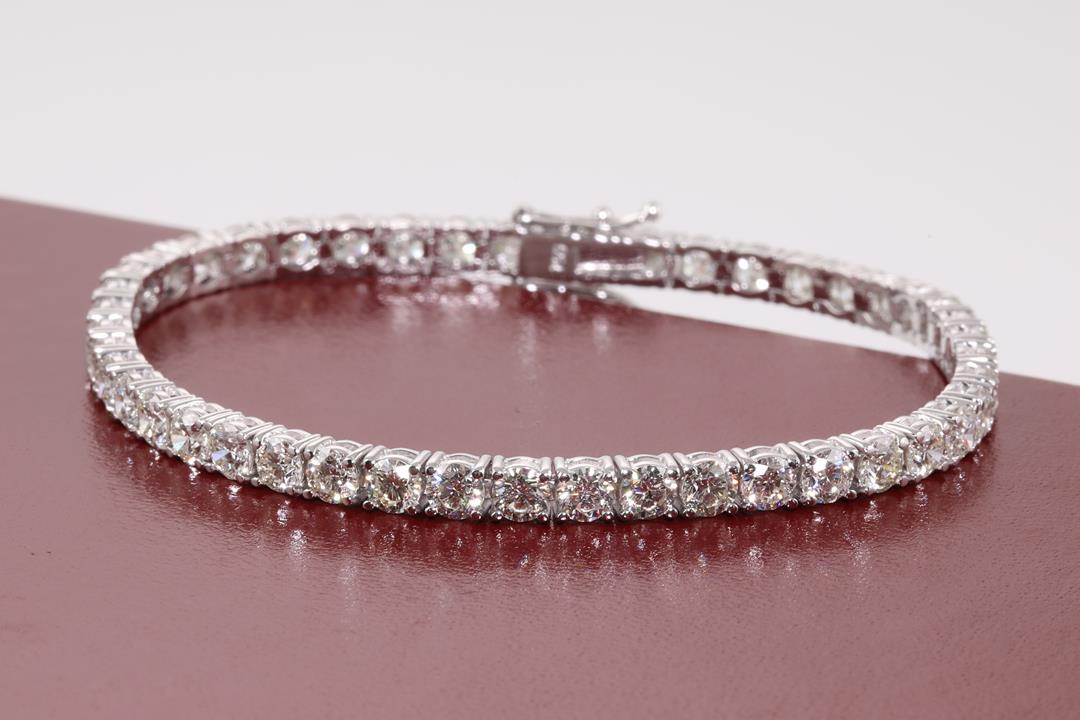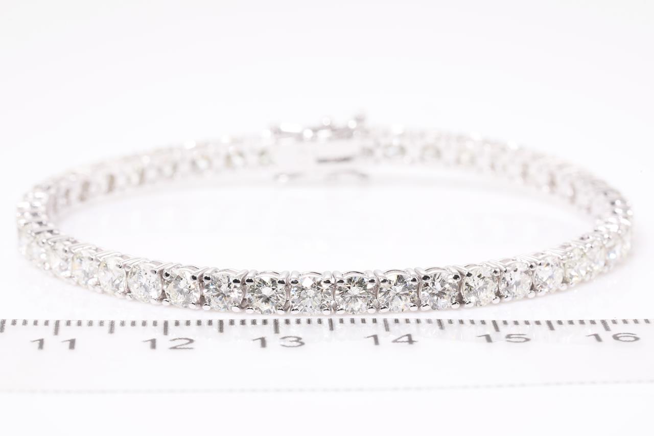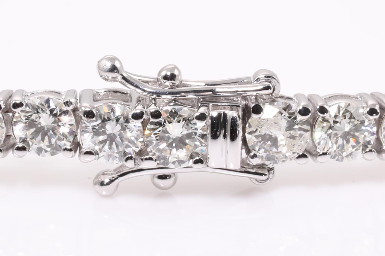 Diamond tennis bracelet with 45 round Diamonds totalling 8.69cts (Estimated grading: G-H SI). 18ct white gold. Length: 18cm. Weight: 13.1g. With certificate #414475. (New)