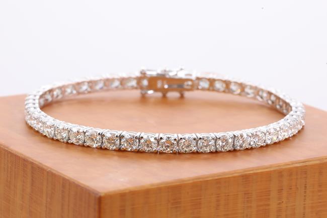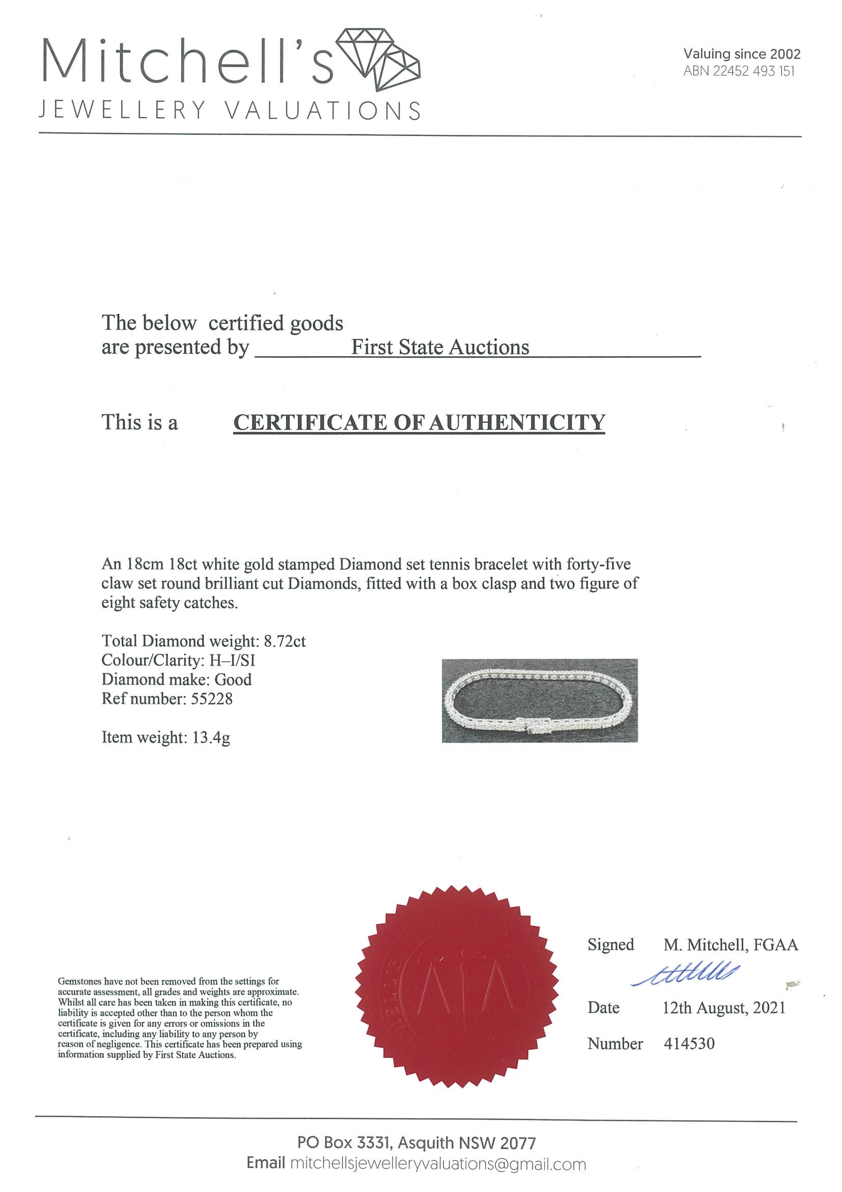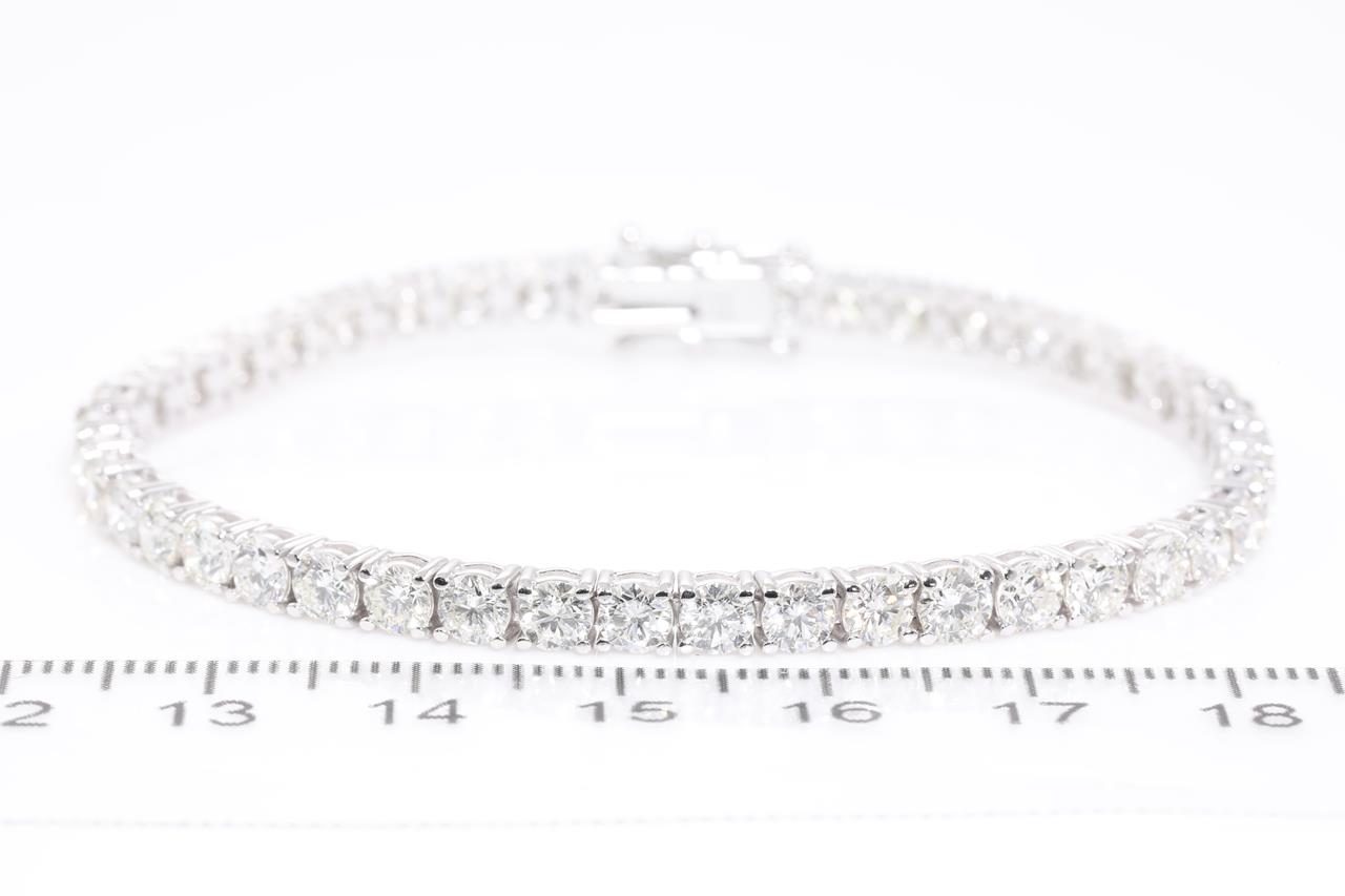 Diamond tennis bracelet with 45 round Diamonds totalling 8.72cts (Estimated grading: H-I SI). 18ct white gold. Length: 18cm. Weight: 13.4g. With certificate #414530. (New)