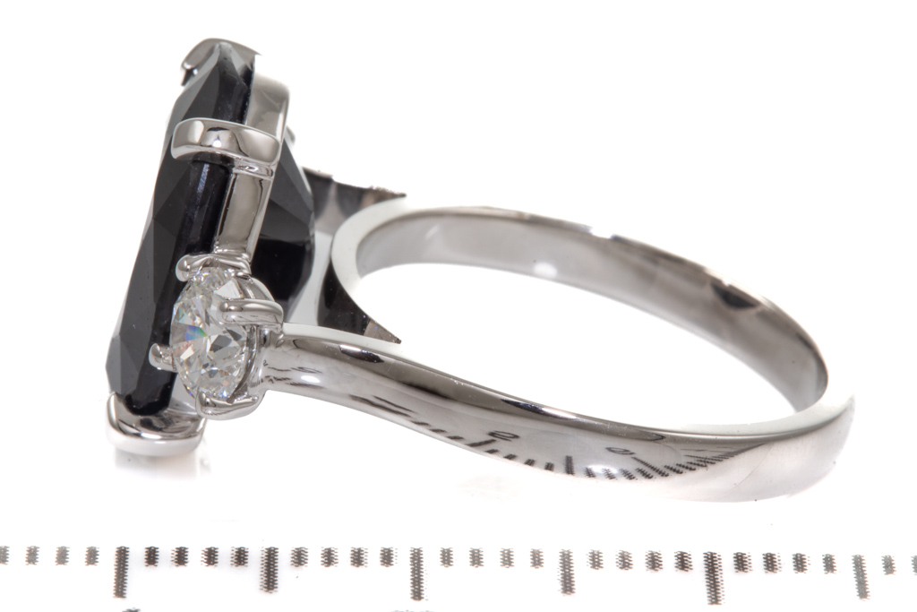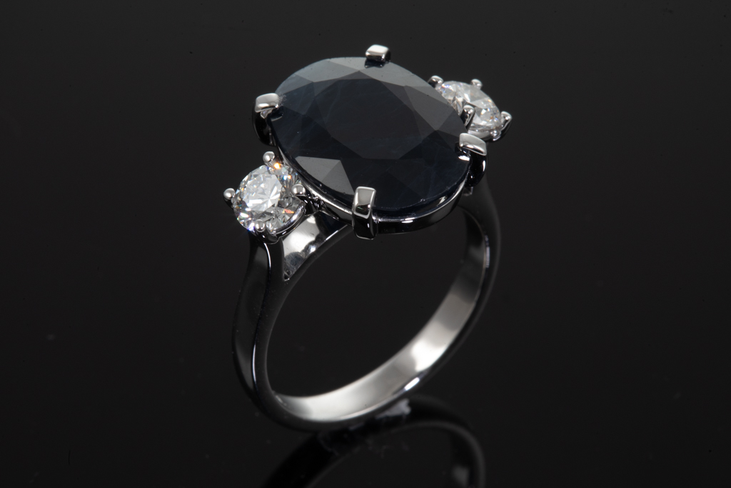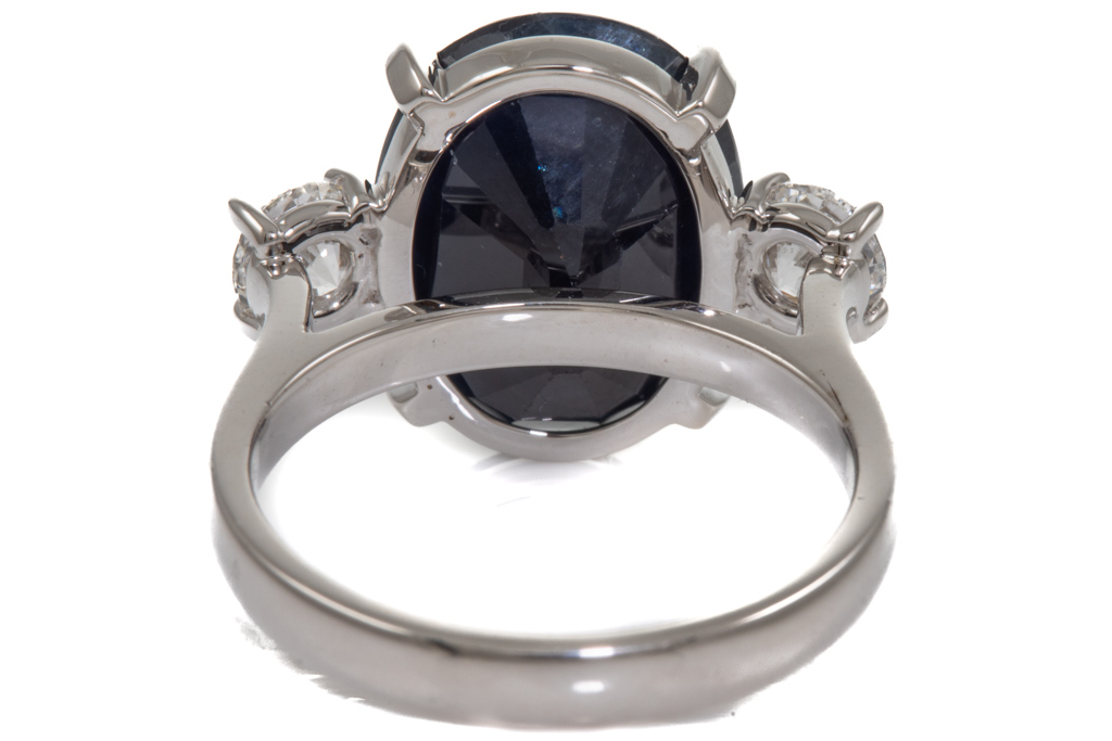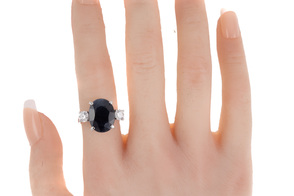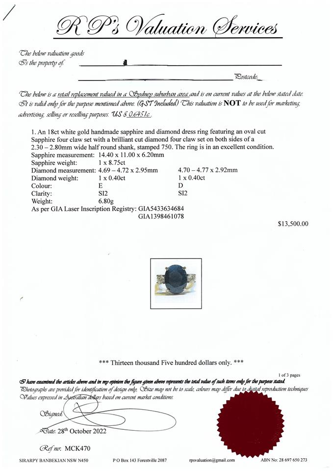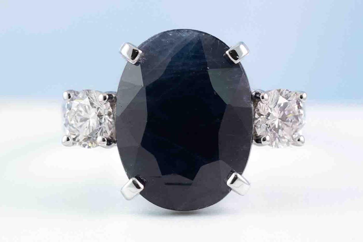 Sapphire and Diamond ring with oval shape dark blue Sapphire of 8.75ct and 2 shoulder round brilliant cut Diamonds totalling 0.80cts (both with GIA report graded as D SI2 & E SI2 #1398461078, 5433634684). Ring size M. Weight: 6.8g. With Valuation Certificated dated 28 October 2022. (Pre-owned)