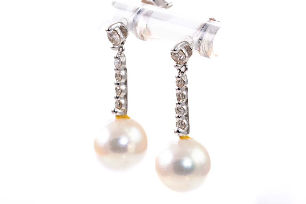 Pearl and Diamond earrings with Akoya Pearls of 8.8 -8.9mm and round Diamonds totalling 0.15cts. Platinum with 18ct white gold backs. Weight: 3.8g. (Pre-owned)