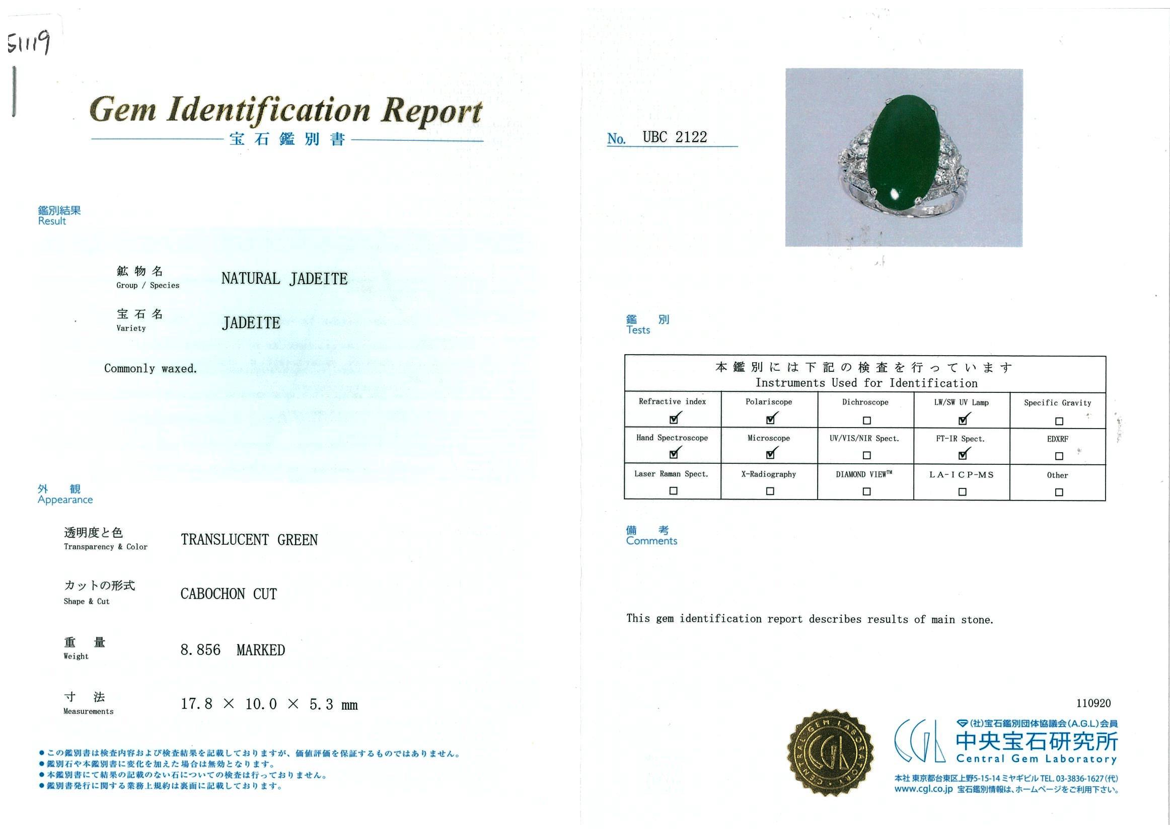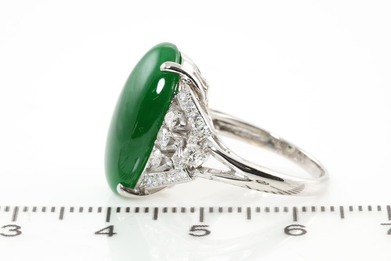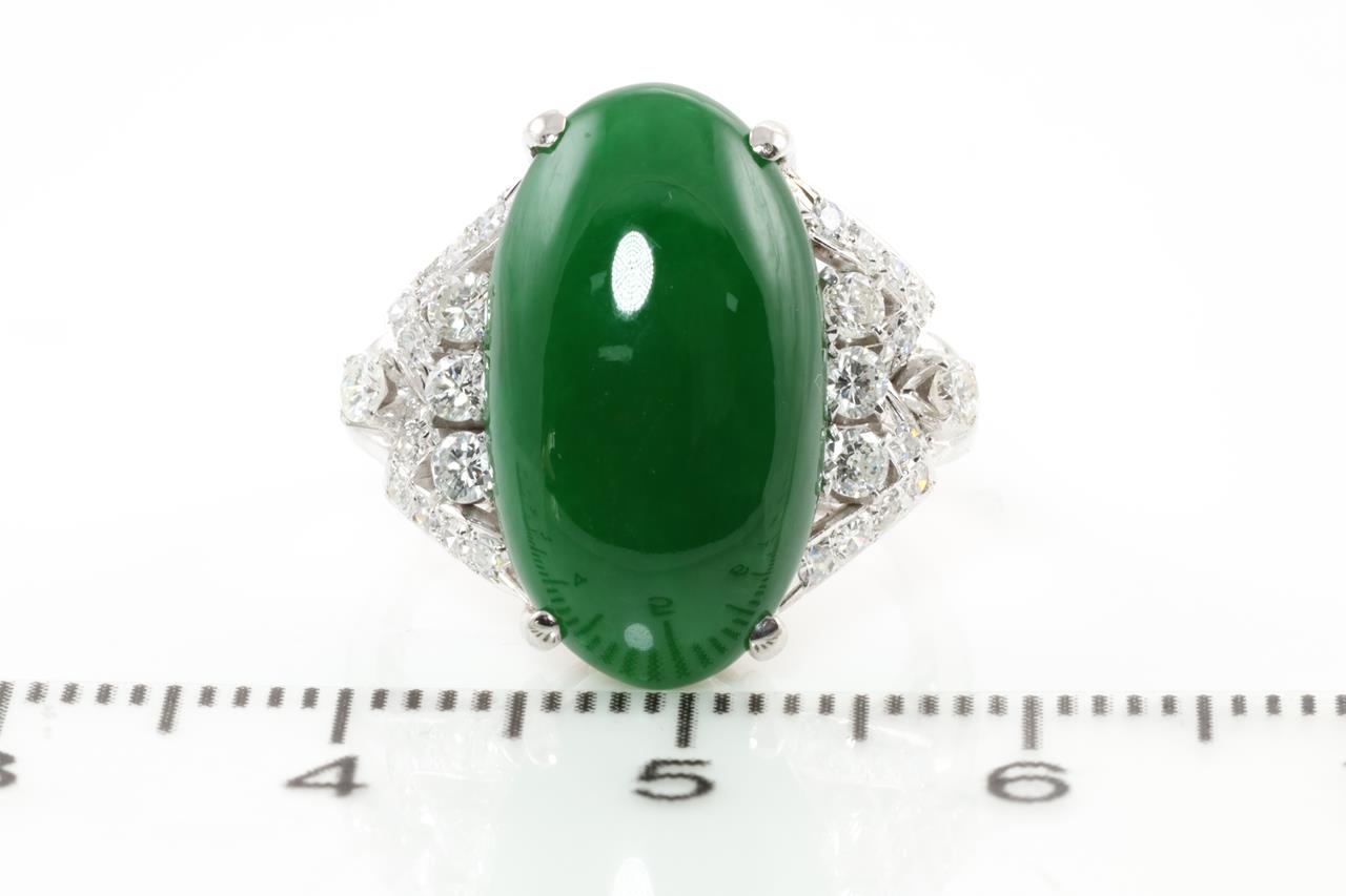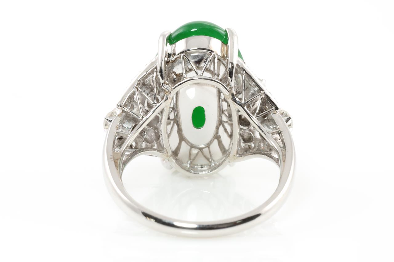 Jade and Diamond ring with oval cabochon cut translucent green natural Jadeite Jade of 8.85ct (with GEM identification report #UBC 2122) and Diamonds totalling approximately 0.35cts (Estimated grading: G-H VS). Platinum. Ring size: I1/2. Weight: 6.7g (Pre-owned)