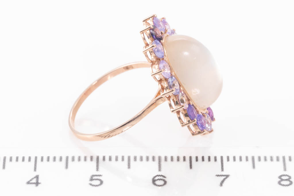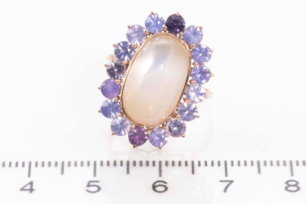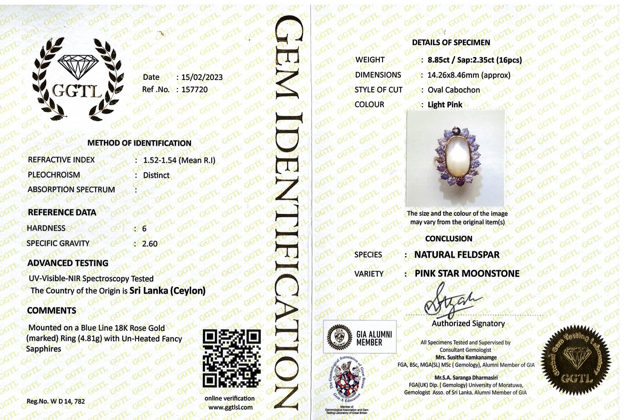 Moonstone and Sapphire ring with oval cabochon cut Moonstone of 8.85ct and round unheated multi-colour Sapphires totalling 2.35cts. 14ct rose gold. Rig size L1/2. With GGTL Certificate #157720. Weight: 4.8g (As New)