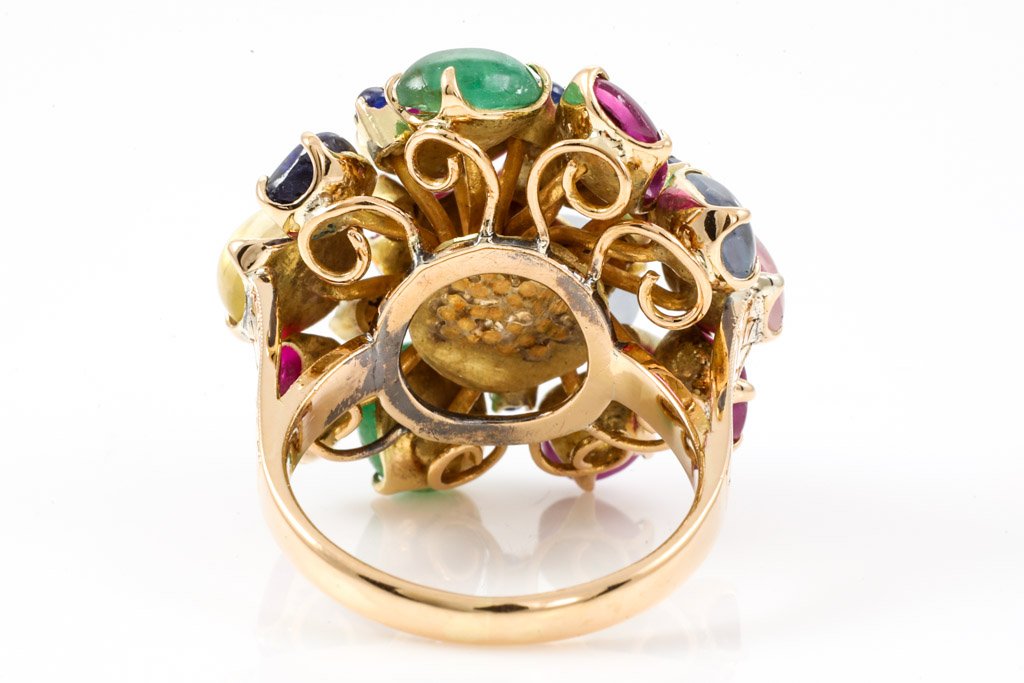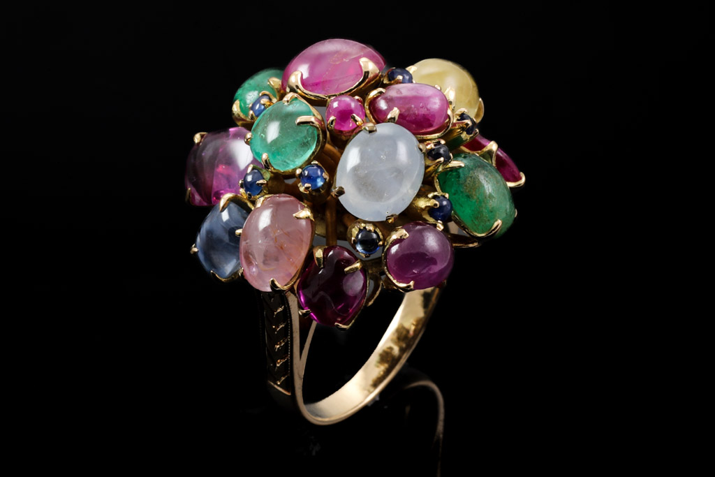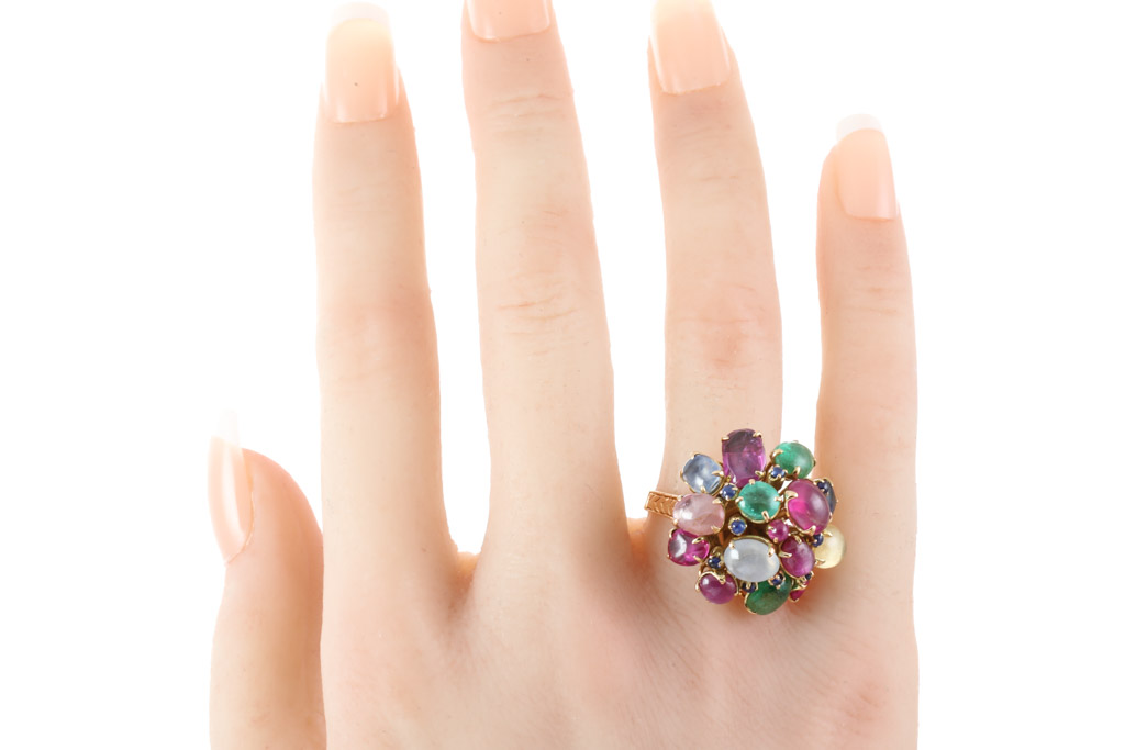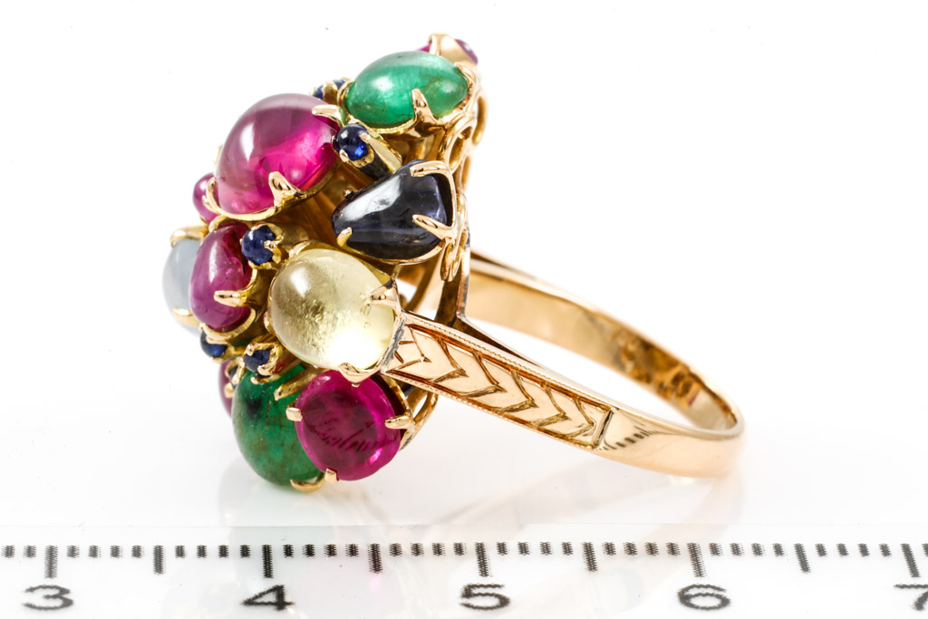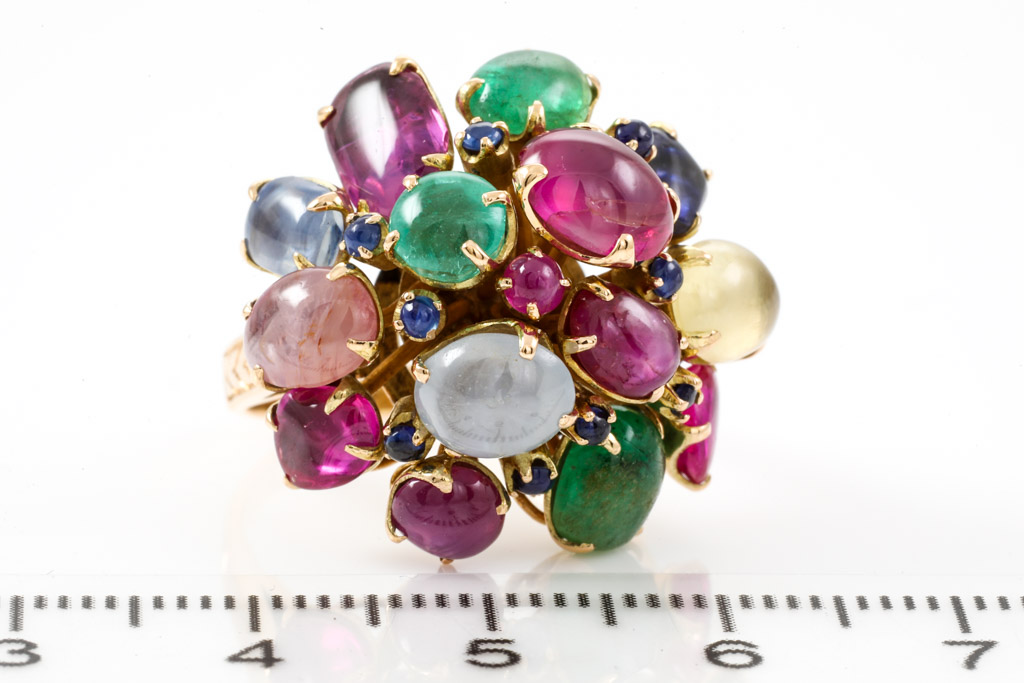 Sapphire and Emerald ring with multi-shape cabochon cut multi-coloured Sapphires totalling approximately 8.88cts and oval shape cabochon cut Emeralds totalling approximately 1.98cts (note, stones with surface reaching inclusions). 18ct yellow gold. Ring size K1/2. Weight: 11.0g. (Pre-owned)