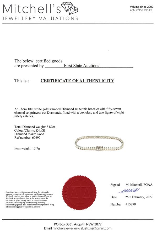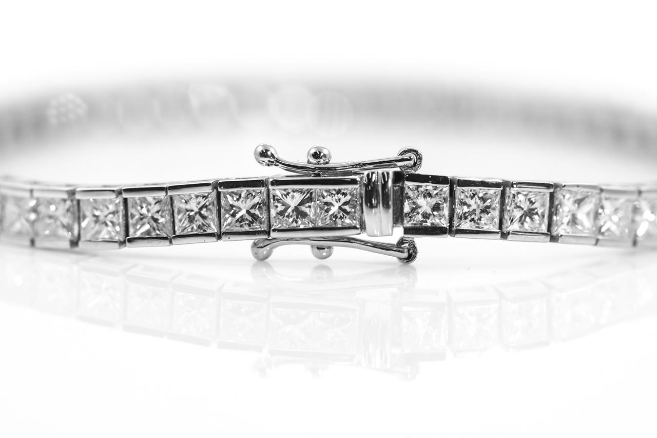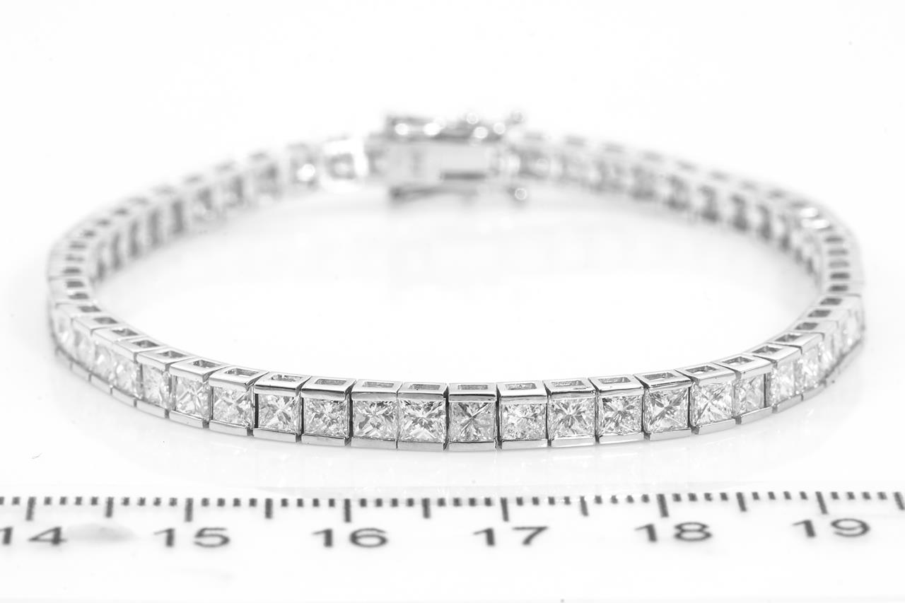 Diamond tennis bracelet with 57 princess cut Diamonds totalling 8.89cts (Estimated grading: K-L SI). 18ct white gold. Length: 18cm. Weight: 12.7g. With certificate #415290. (New)