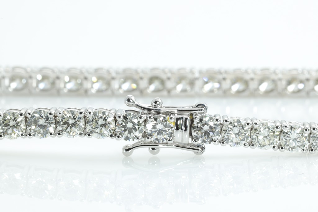Diamond tennis bracelet with 45 round Diamonds totalling 9.03cts (Estimated grading: H-J SI). 18ct white gold. Length: 18cm. Weight: 13.0g. With certificate #415213. (New)