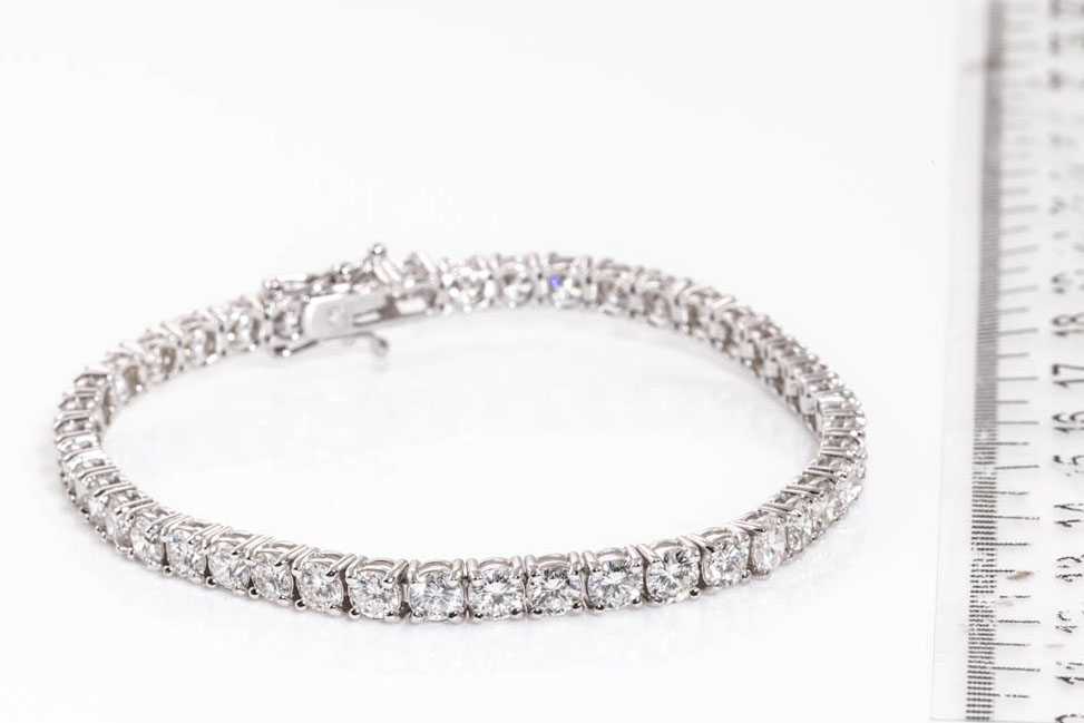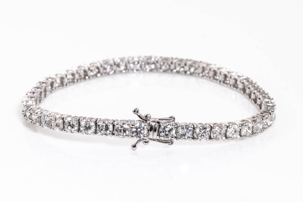 Diamond tennis bracelet with 44 round Diamonds totalling 9.04cts (Estimated grading: H-I SI). 18ct white gold. Length: 18.5cm. Weight: 13.9g. With certificate #416436. (Pre-owned)