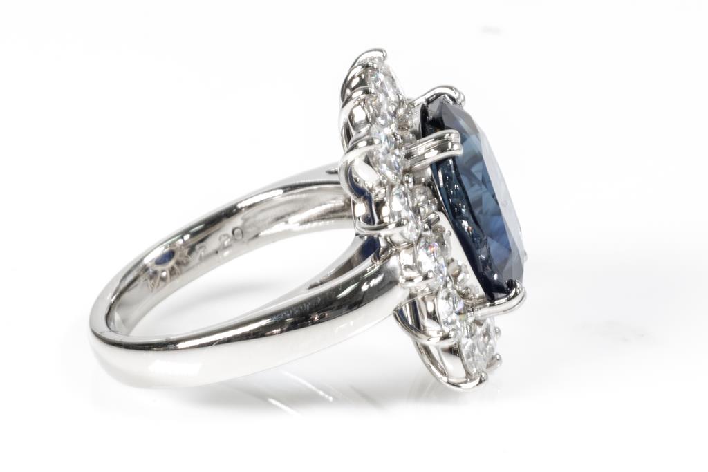Sapphire and Diamond ring with oval blue Sapphire of 9.05ct and round Diamonds totalling 2.20cts (Estimated grading: G-H VS2). Platinum. Ring size M. Weight: 13.8g. With Certificate #416041. (Pre-owned)