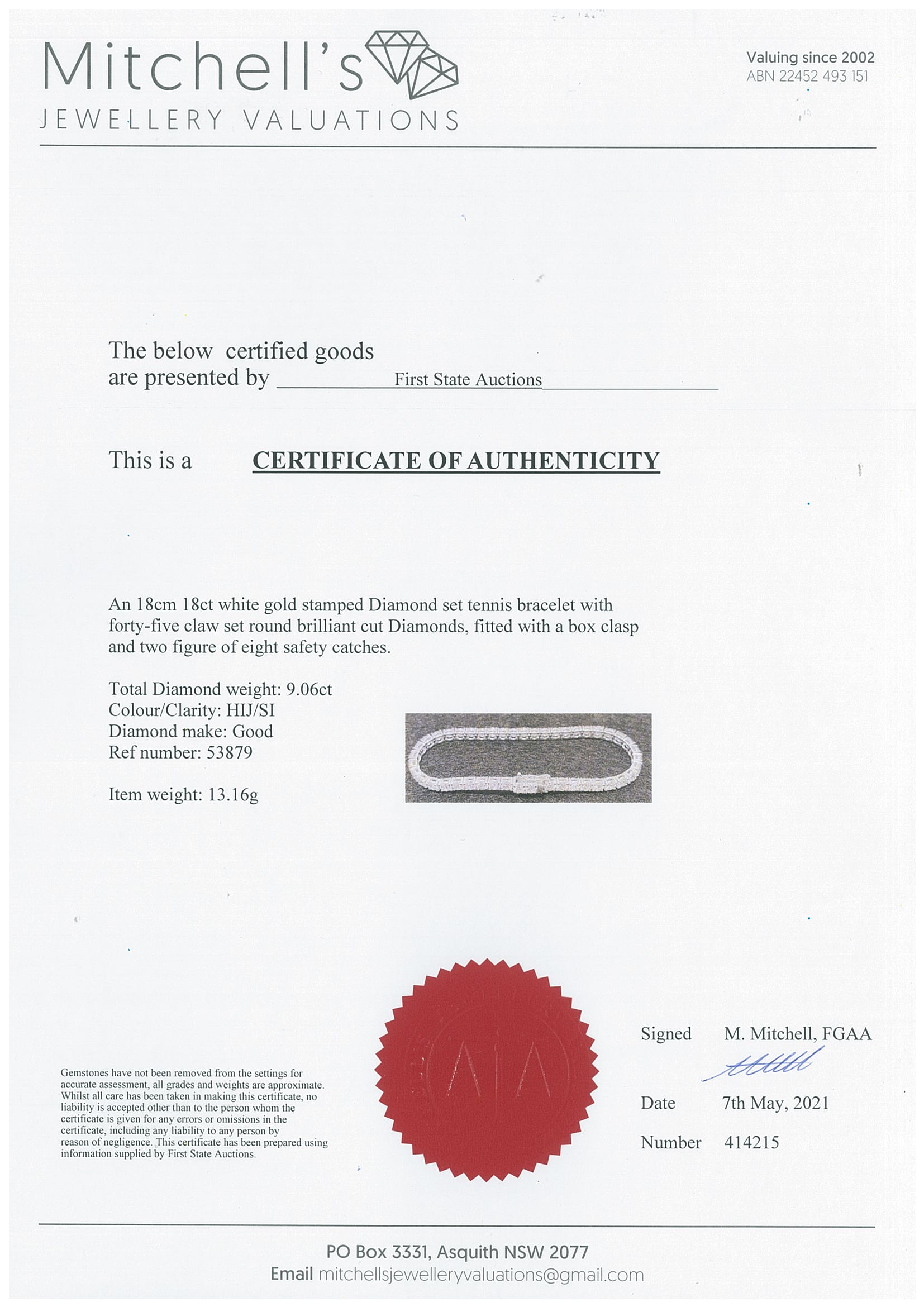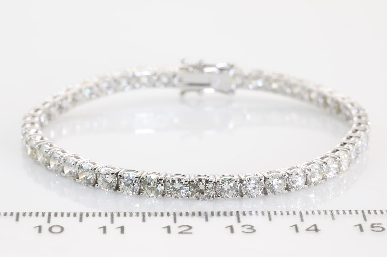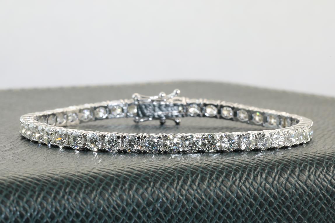 Diamond tennis bracelet with 45 round Diamonds totalling 9.06cts (Estimated grading: HIJ SI). 18ct white gold. Length: 18cm. Weight: 13.1g. With certificate #414215. (New)