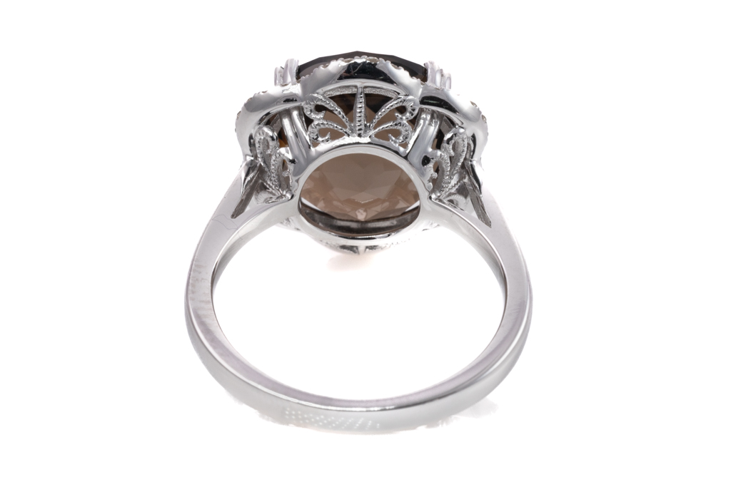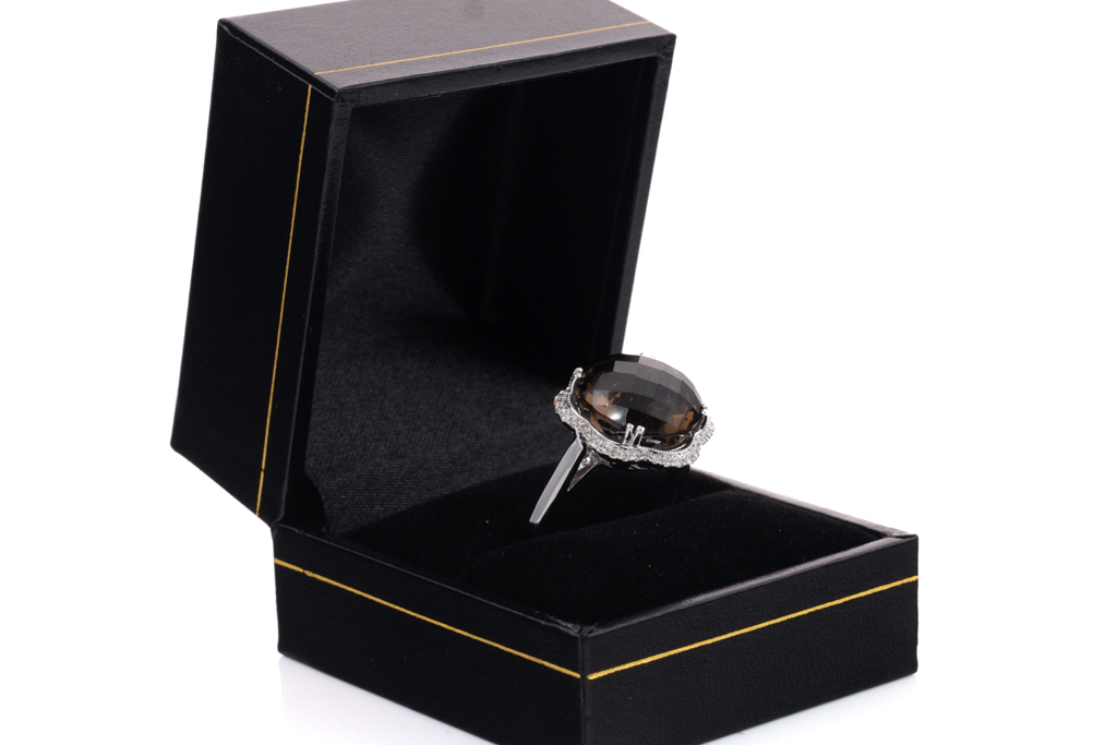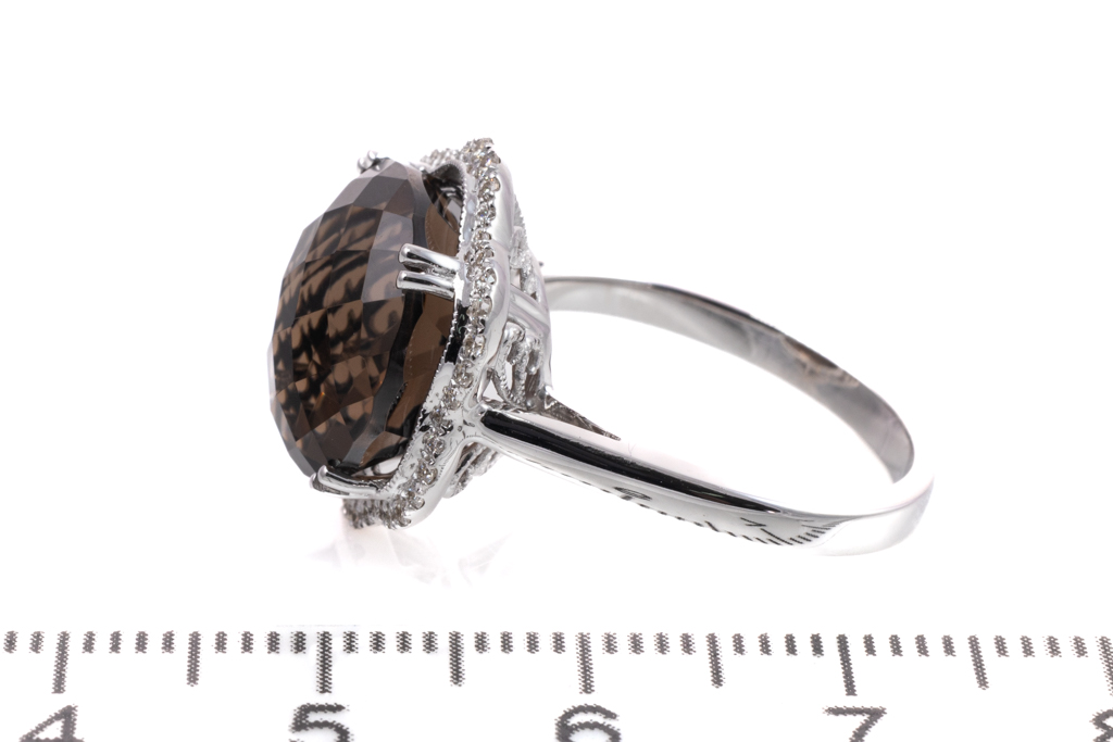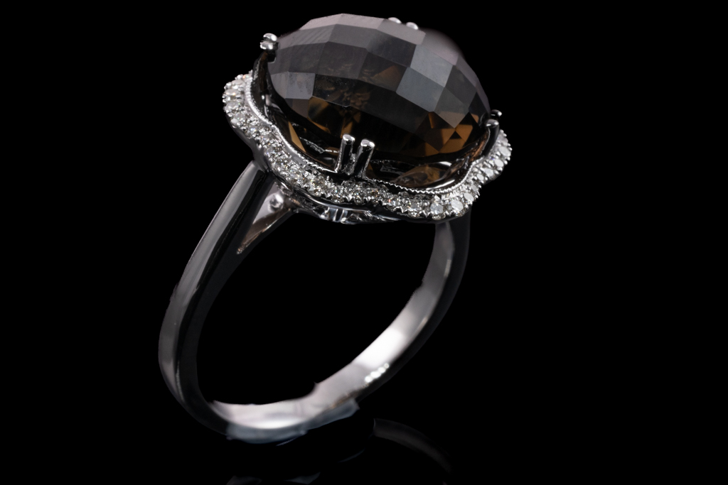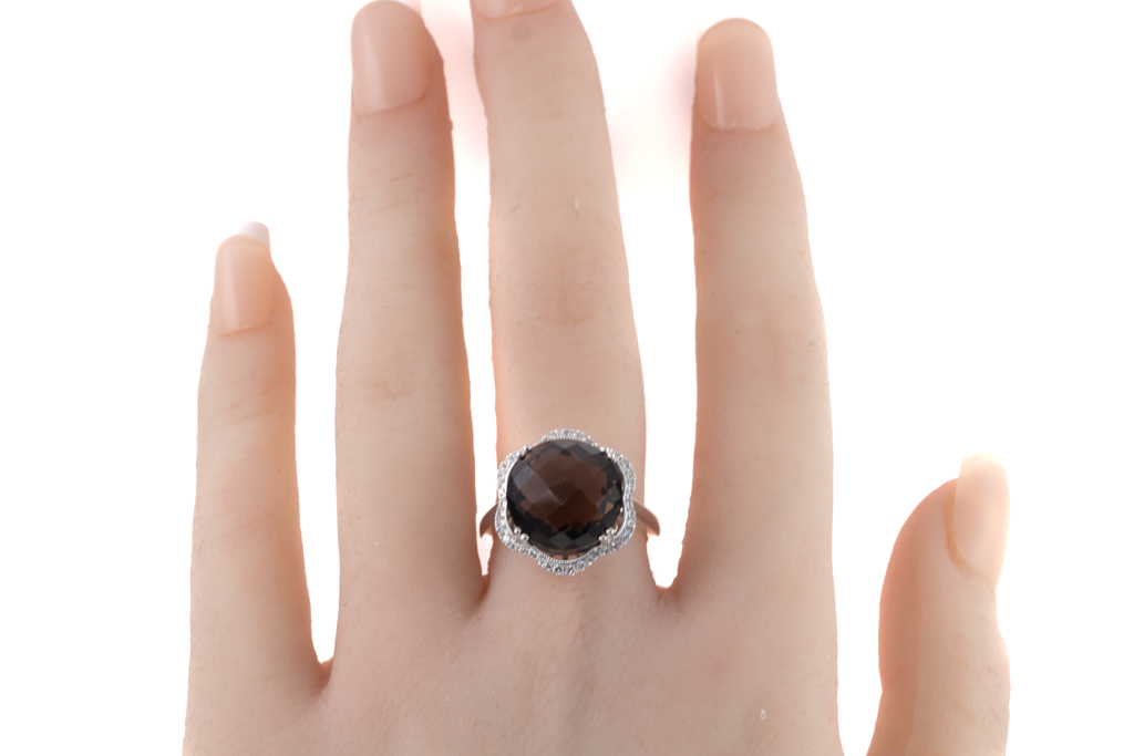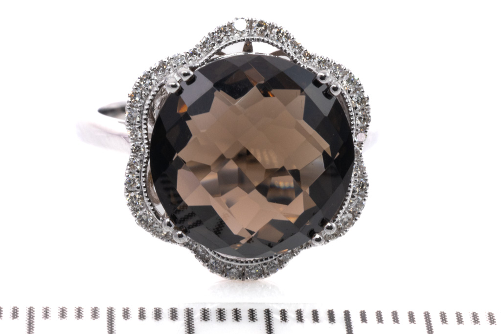 Quartz and Diamond ring with round checkerboard cut smoky Quartz totalling 9.06cts and round Diamonds totalling 0.22cts. 14ct white gold. Ring size N. Weight: 5.8g. (New)