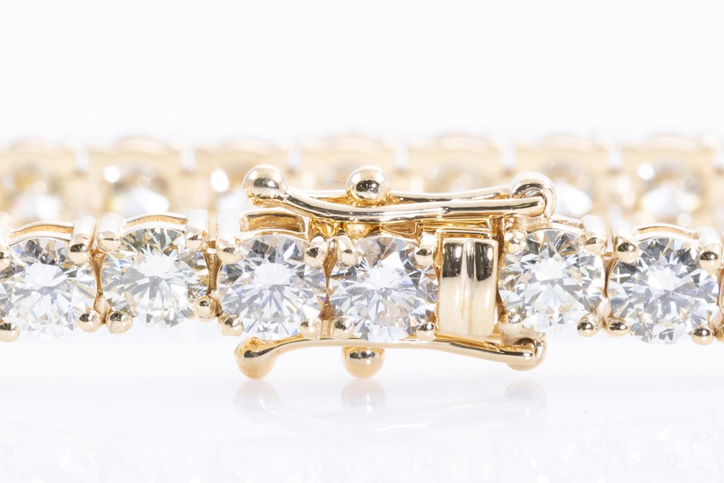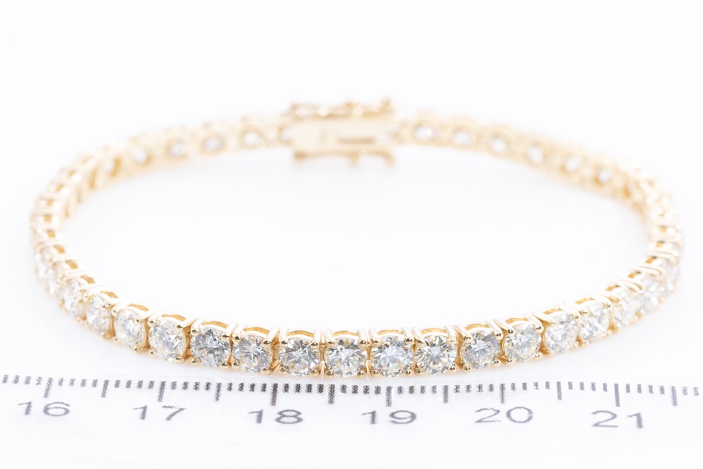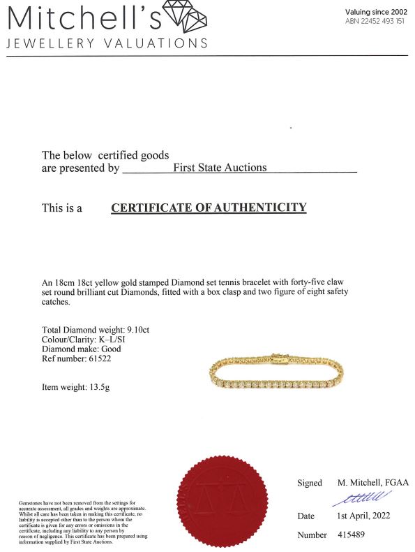 Diamond tennis bracelet with 45 round Diamonds totalling 9.10cts (Estimated grading: K-L SI). 18ct yellow gold. Length: 18cm. Weight: 13.5g. With certificate #415489. (New)
