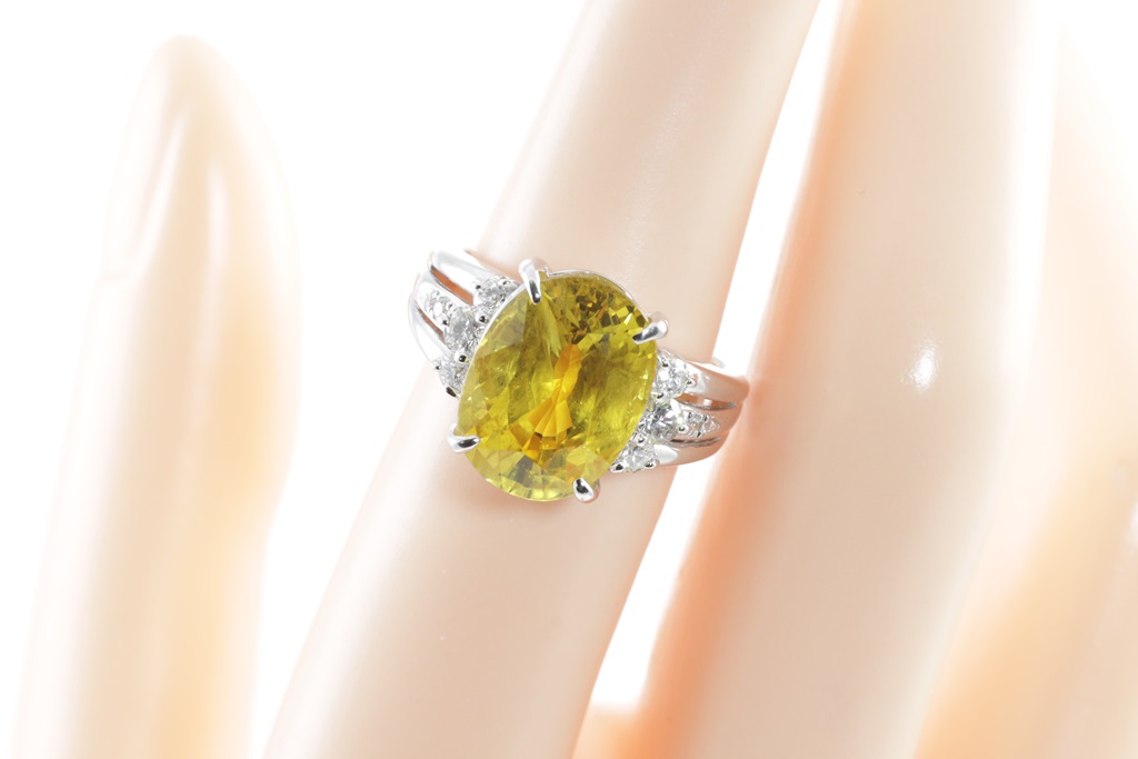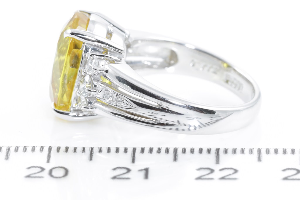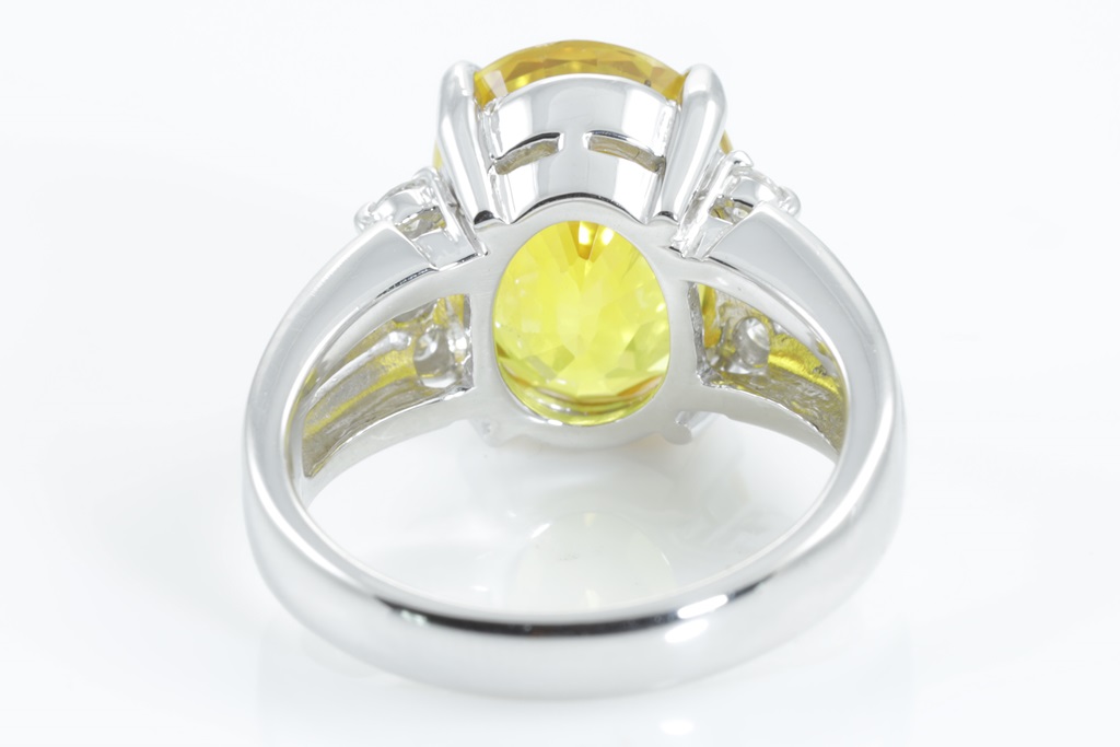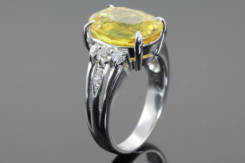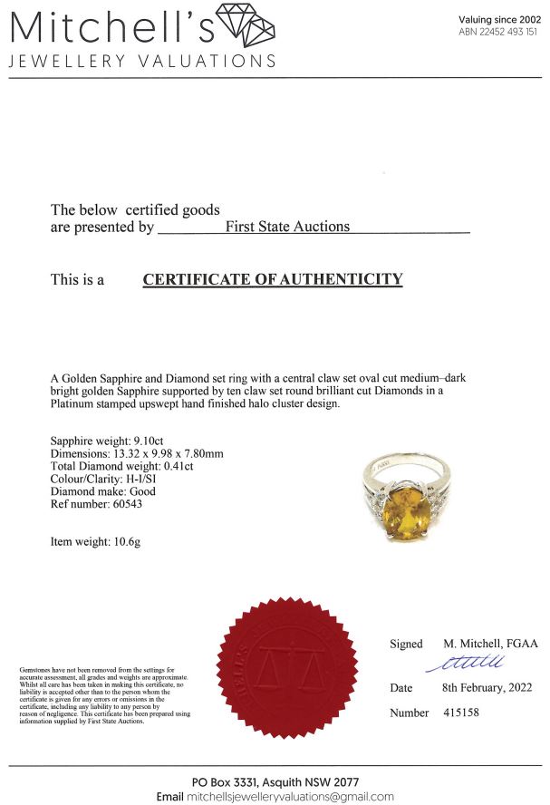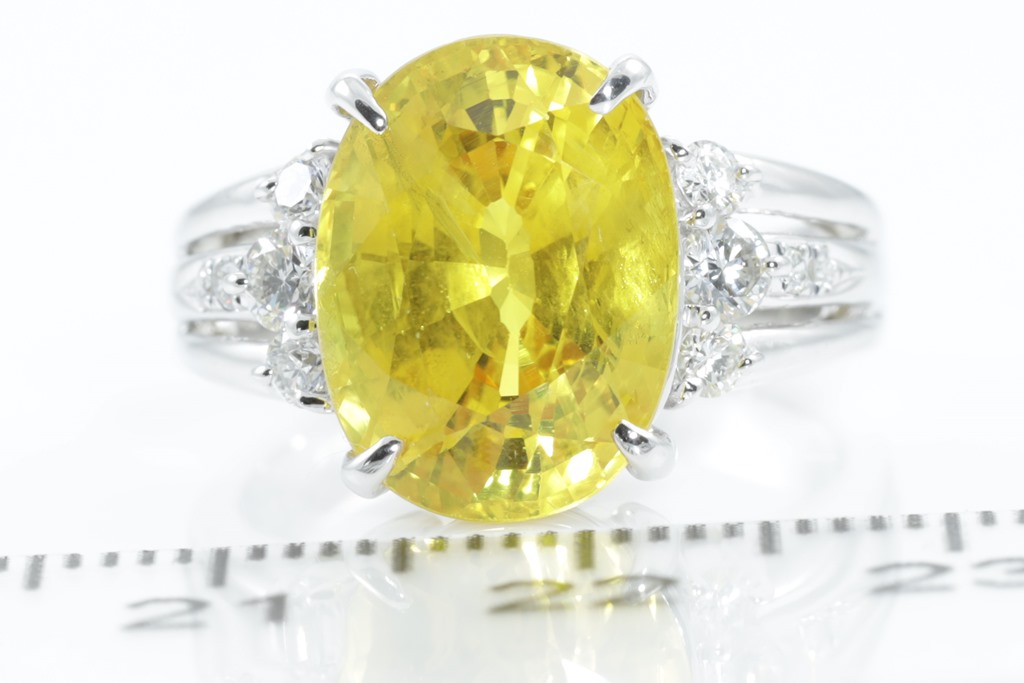 Sapphire and Diamond ring with a yellow oval cut Sapphire of 9.10ct and surrounding Diamonds totalling 0.41cts (Estimated grading: H-I SI). Platinum. Ring size: L1/2. Weight: 10.6g. With Certificate #415158 (Pre-owned)