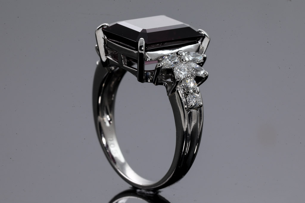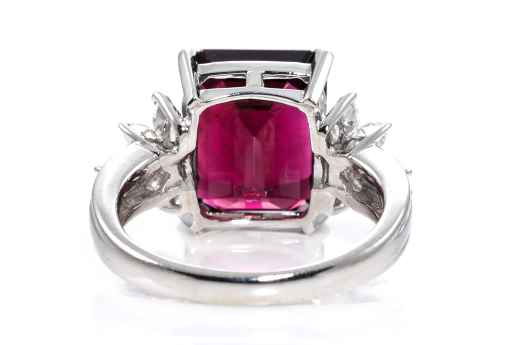 Garnet and Diamond ring with emerald cut reddish brown Garnet of 9.11ct and marquise cut & round Diamonds totalling 0.57cts (Estimated grading: G SI). Platinum. Ring size P - ring resizing down by clip. Weight: 10.3g. (Pre-owned)