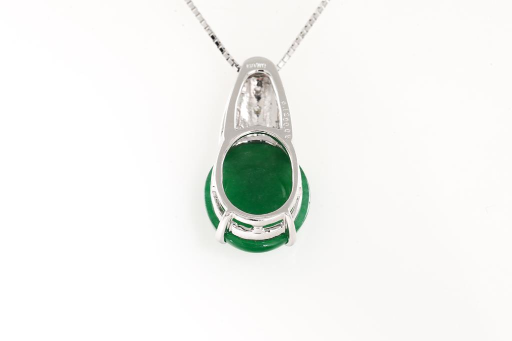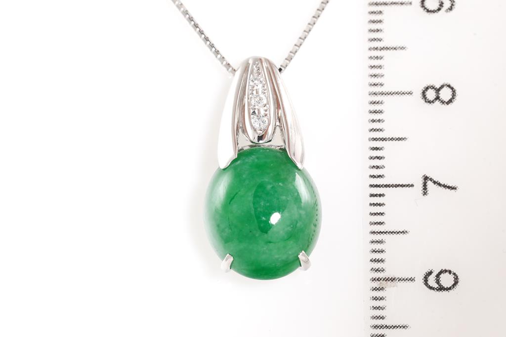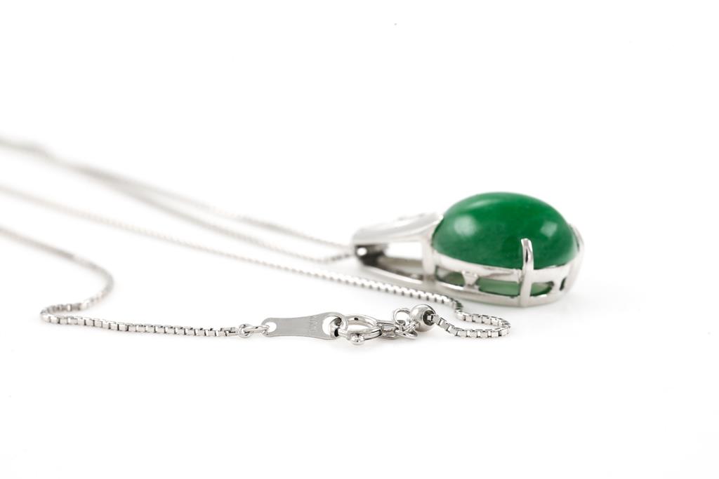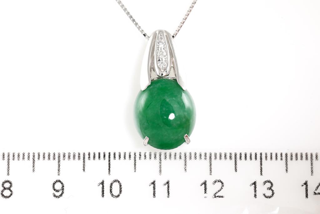 Jade and Diamond Pendant with an oval cabochon cut Natural Type A green Jadeite Jade of 9.12ct and Diamonds totalling 0.05cts. 18ct white gold with 44cm adjustable chain. Weigth: 7.3g (Pre-owned)