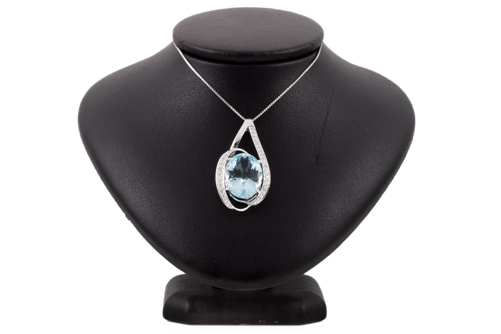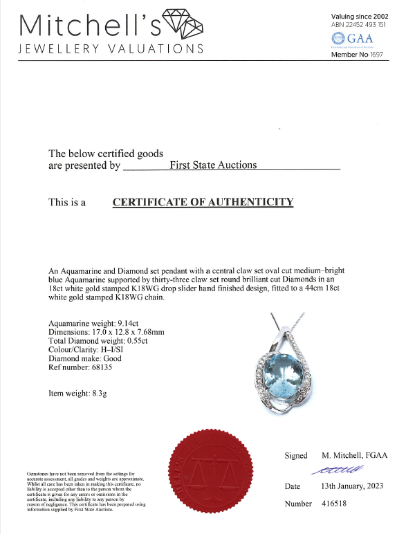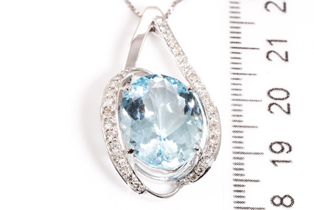 Aquamarine and Diamond pendant with oval Aquamarine of 9.14ct and round Diamonds totalling 0.55ct (Estimated grading: H-I SI). 18ct white gold with 44cm 18ct white gold adjustable chain. Weight: 8.3g. With Certificate 416518. (Pre-owned)