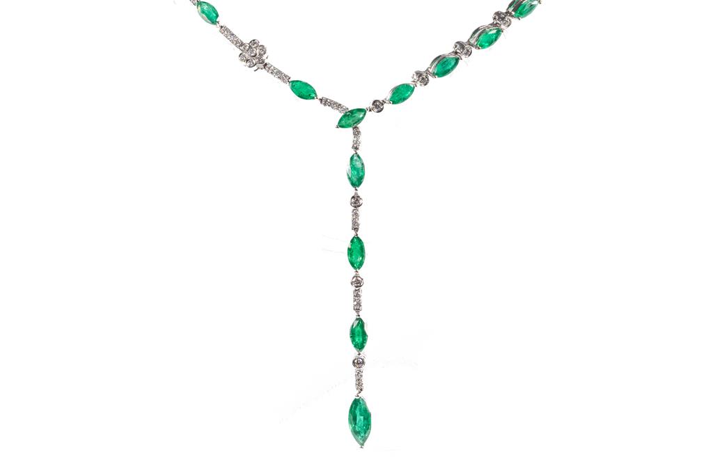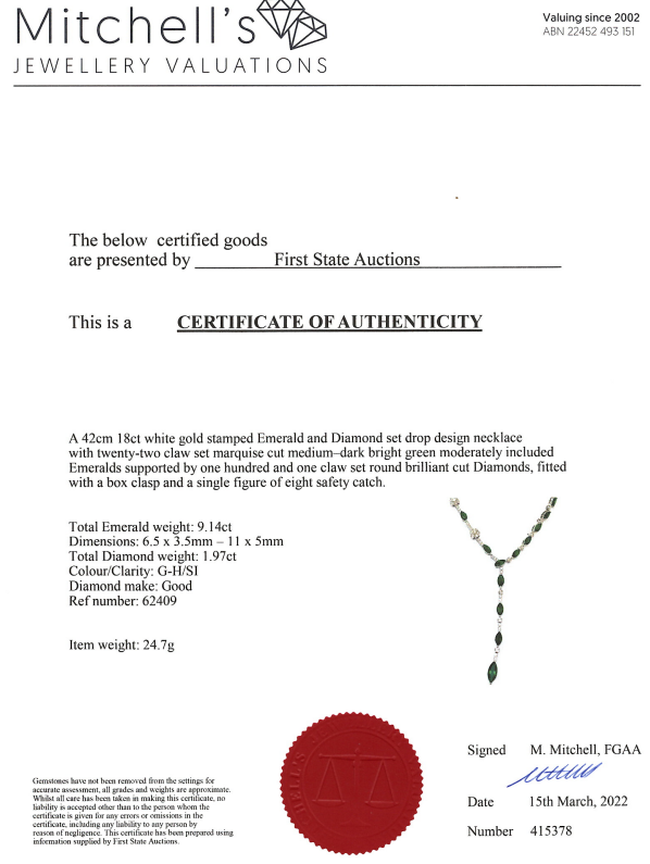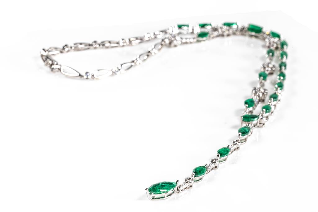 Emerald and Diamond necklace with marquise cut Emeralds totalling 9.14cts and round Diamonds totalling 1.97cts (Estimated grading: G-H SI). 18ct white gold. Length: 42cm. Weight: 24.7g. With certificate #415378. (Pre-owned)