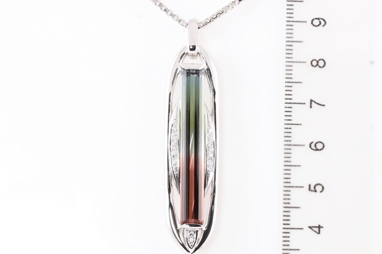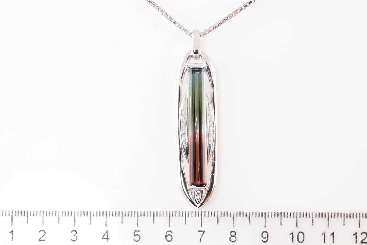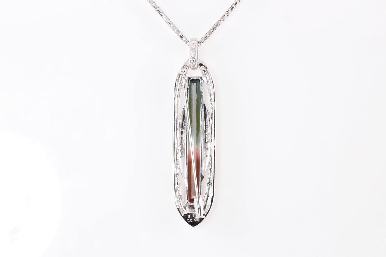 Tourmaline and Diamond pendant with watermelon Tourmaline of 9.17ct and Diamonds totalling 0.20cts. Platinum with platinum 43.5cm chain. Weight: 22.7g (Pre-owned)