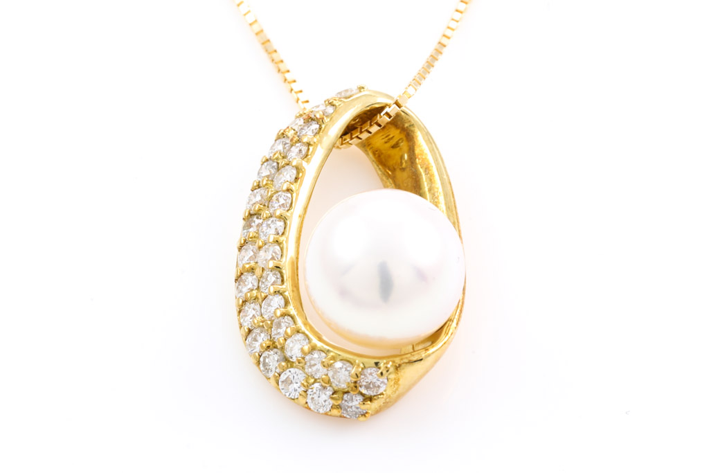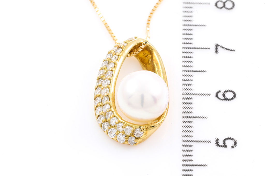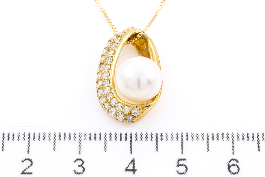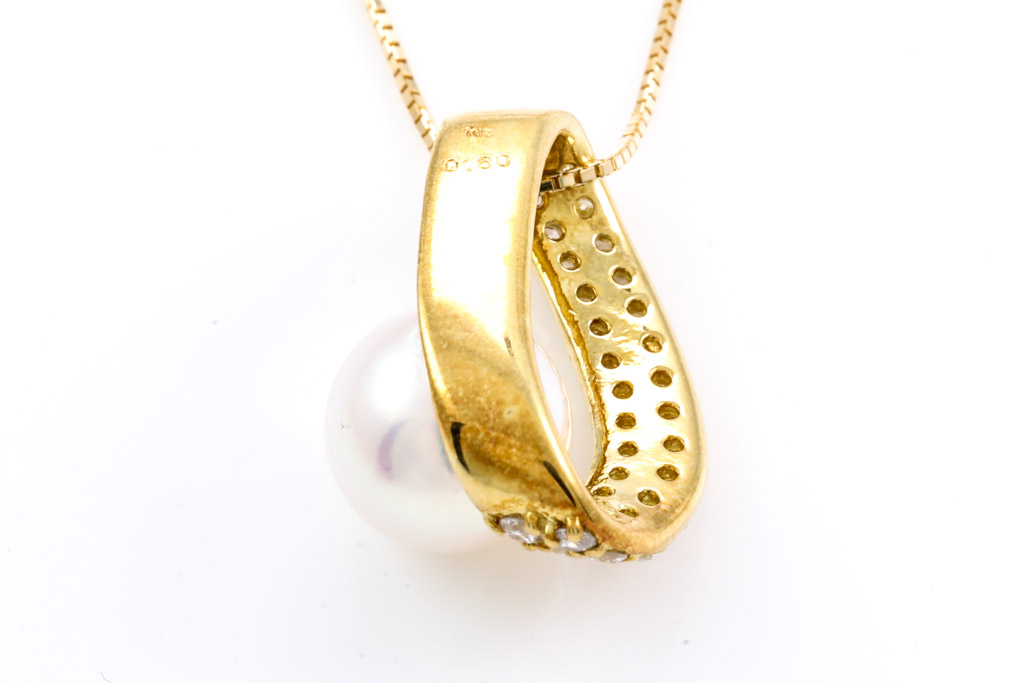 Pearl and Diamond Pendant with pinkish tone Akoya Pearl of 9.1mm and round Diamonds totalling 0.60cts (Estimated grading: J SI-P1). 18ct yellow gold with 18ct yellow gold 44cm adjustable chain. Weight: 6.4g. (Pre-owned)