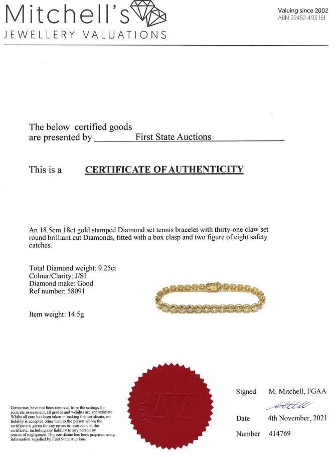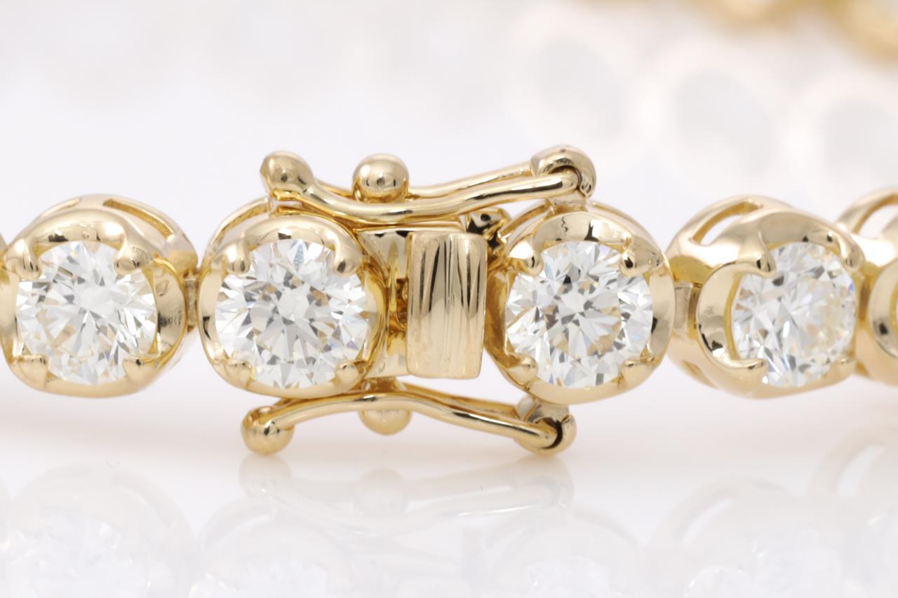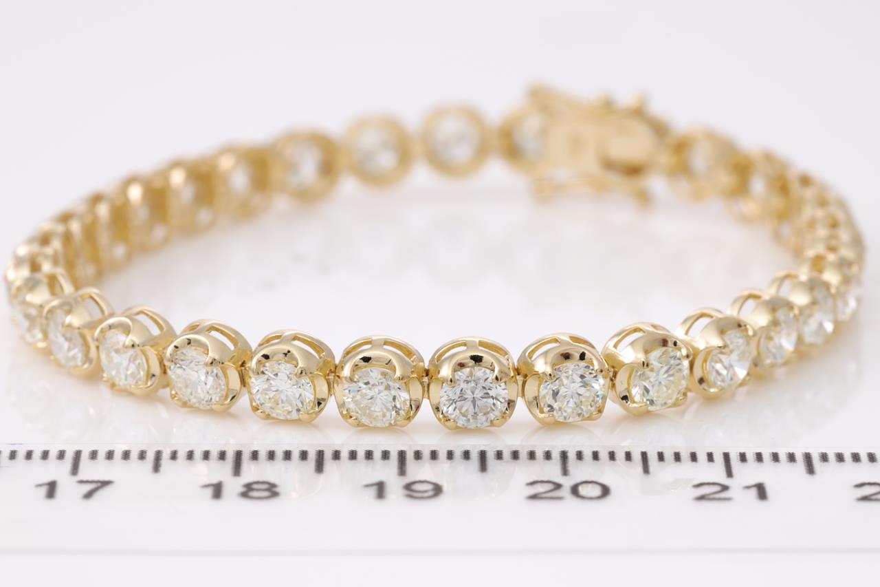 Diamond tennis bracelet with 31 round Diamonds totalling 9.25cts (Estimated grading: J SI). 18ct yellow gold. Length: 18.5cm. Weight: 14.5g. With certificate #414769. (New)