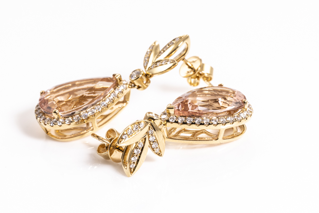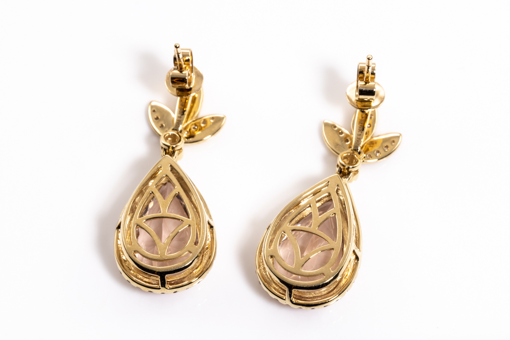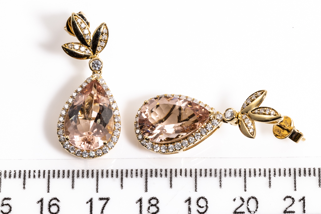 Morganite and Diamond earrings with2 pear shape Morganites totalling 9.27cts and round Diamonds totalling 0.84cts (Estimated grading: H-I SI-P1). 18ct rose gold. Weight: 8.6g. With Certificate #416315. (As new)
