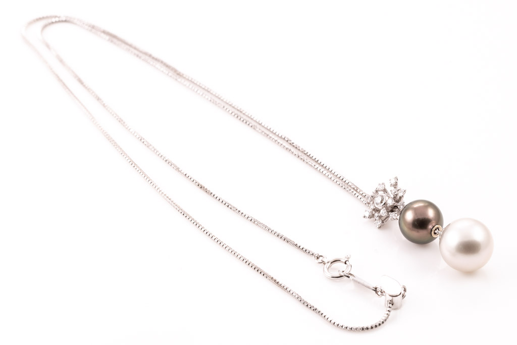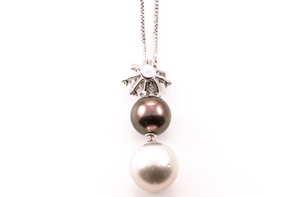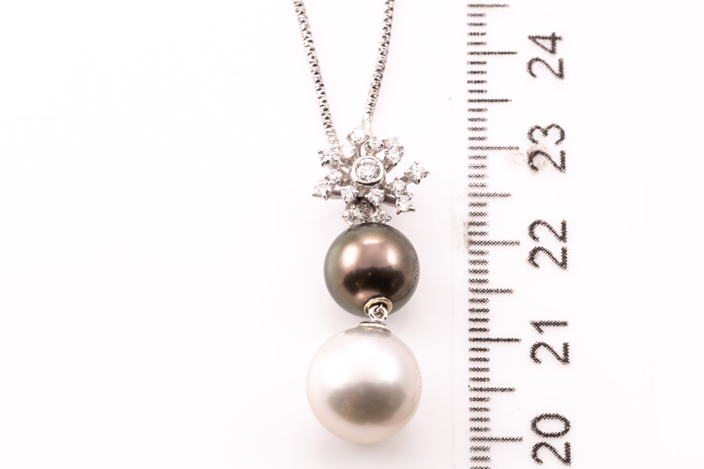 Pearl and Diamond pendant with South Sea Pearl of 11.0mm, Tahitian Pearl of 9.2mm and Diamonds totalling 0.24cts. 18ct white gold with 50cm 18ct white gold chain. Weight: 9.6g. (Pre-owned)