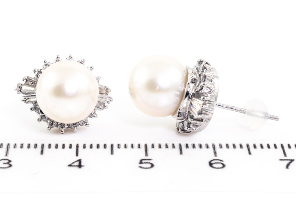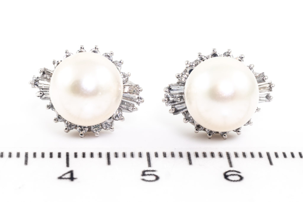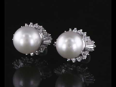 Pearl and Diamond earrings with Akoya Pearls of 9.2mm & 9.3mm with baguette cut & round Diamonds totalling 0.75cts (Estimated grading: H SI). Platinum with silicon backs. Weight: 9.3g. (Pre-owned)