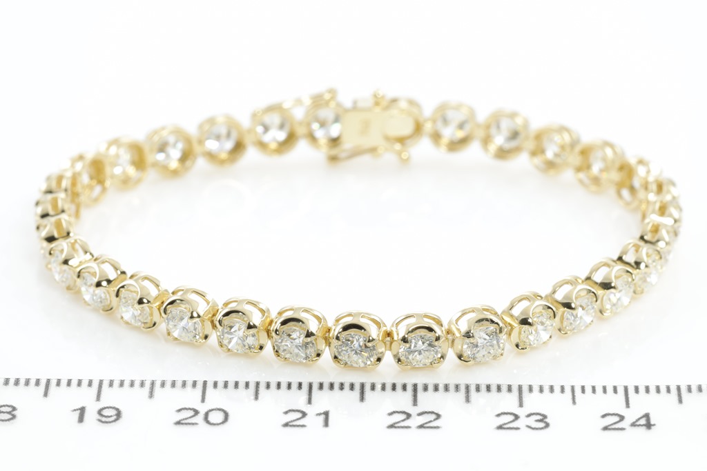 Diamond tennis bracelet with 31 round Diamonds totalling 9.30cts (Estimated grading: H-I SI). 18ct yellow gold. Length: 18cm. Weight: 14.4g. With certificate #415143. (New)
