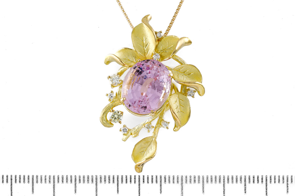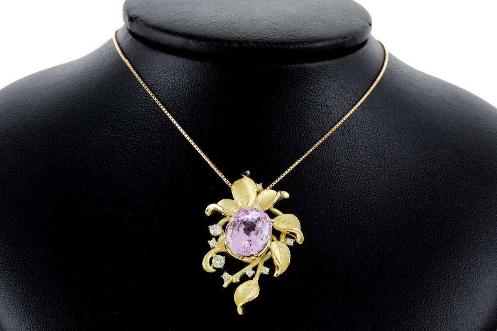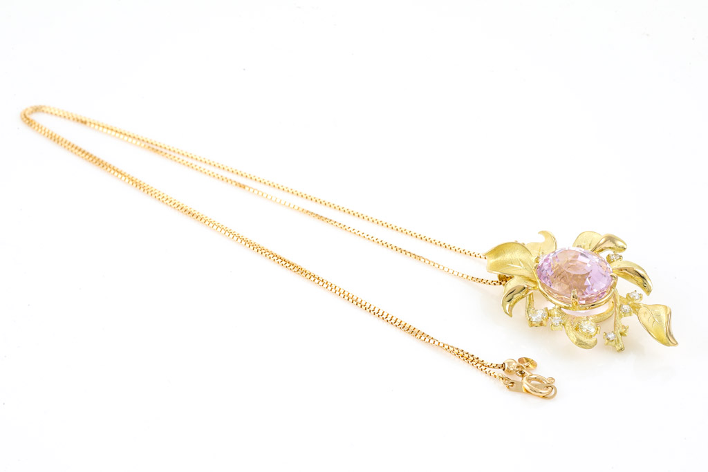 Kunzite and Diamond pendant with oval shape Kunzite of 9.37ct and round Diamonds totalling 0.33cts (Estimated grading: Light Yellow & G SI). 18ct yellow gold with 44cm 18ct yellow gold adjustable chain. Weight: 10.6g. (Pre-owned)