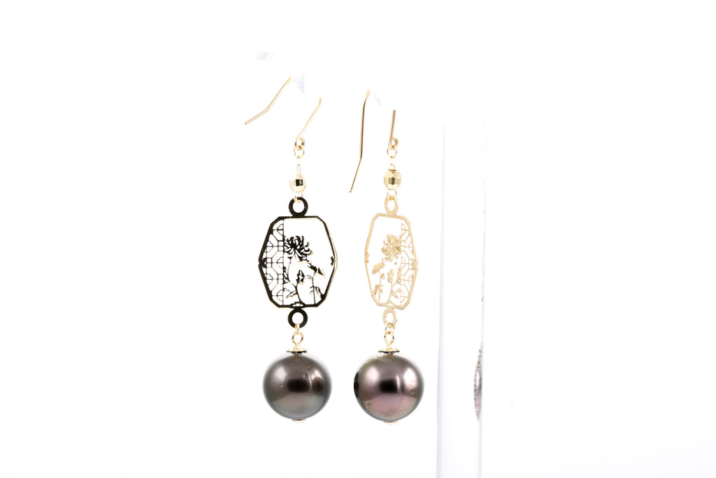 Tahitian Pearl shepherd earrings with Tahitian Pearls of 9.35mm and 9.38mm. 18ct yellow gold. Weight: 3.1g. (Pre-owned)