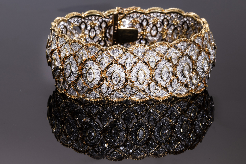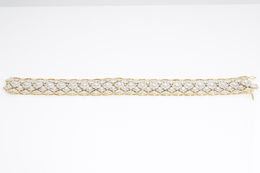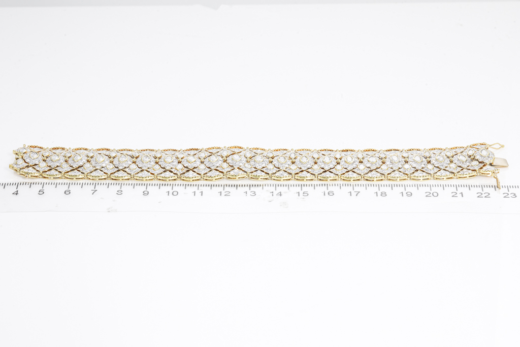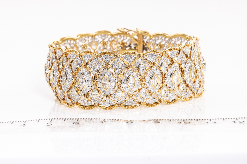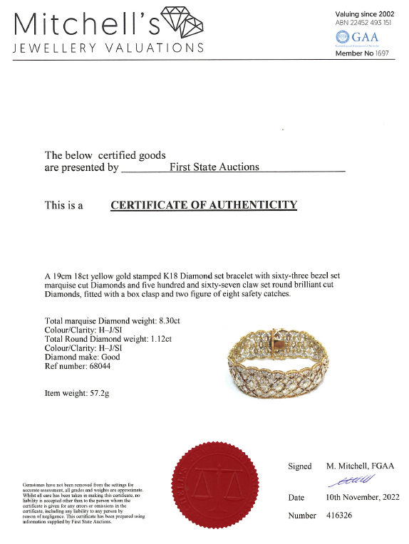 Diamond bracelet with marquise cut Diamonds totalling 8.30cts and round Diamonds totalling 1.12cts (Estimated grading: H-J SI). 18ct yellow gold. Length: 19cm. Weight: 57.0g. With Certificate #416326. (Pre-owned)