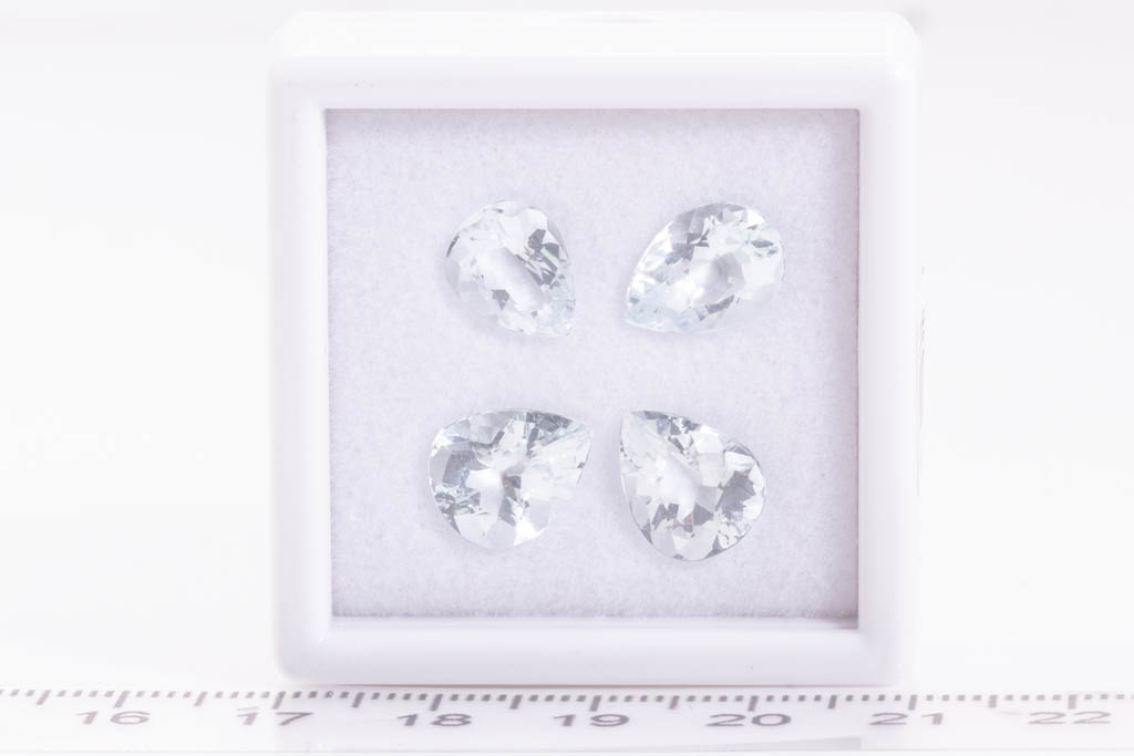 Loose parcel of 4 pear shape Aquamarines totalling 9.50cts. Approximate dimensions: 2 stones approx. 11.0 x 9.0mm x 5.65mm; 10.4 x 8.93 x 5.74mm: 9.70 x 7.71 x 5.10mm. (As New)