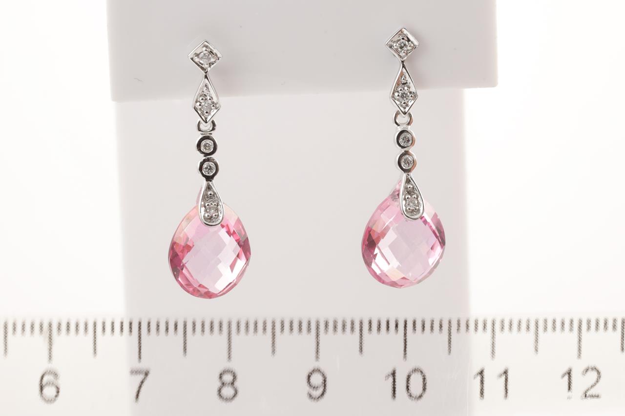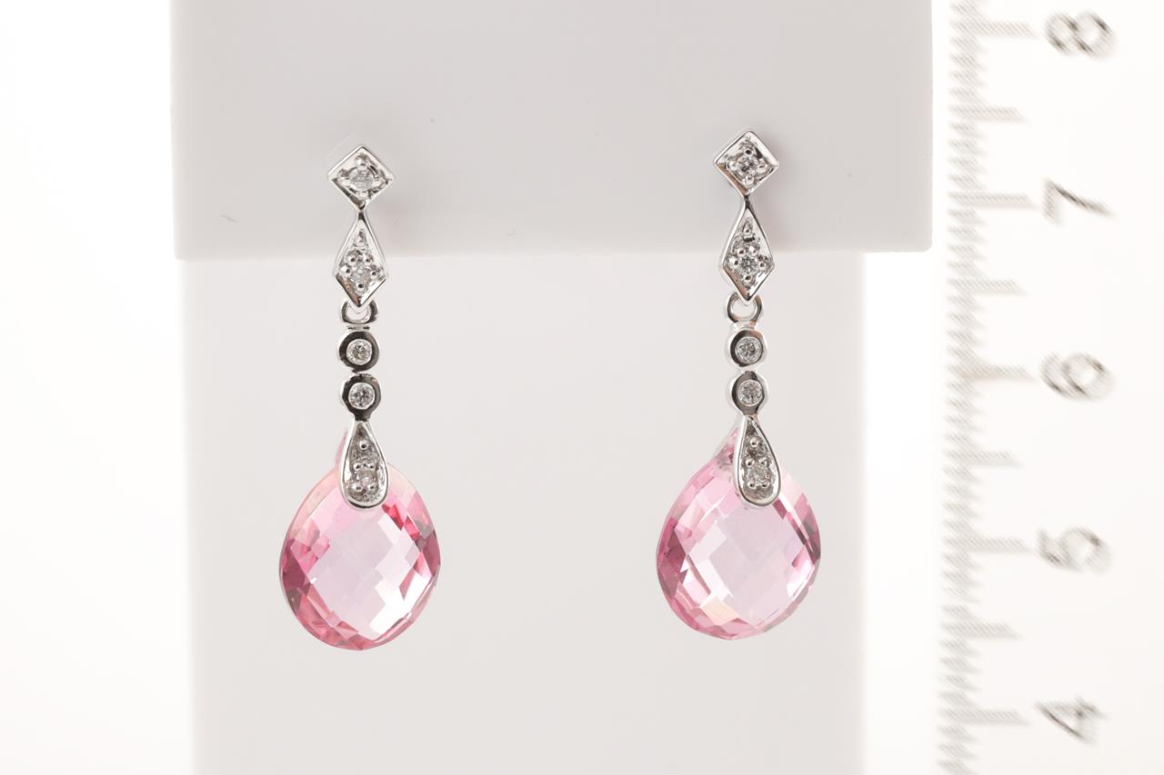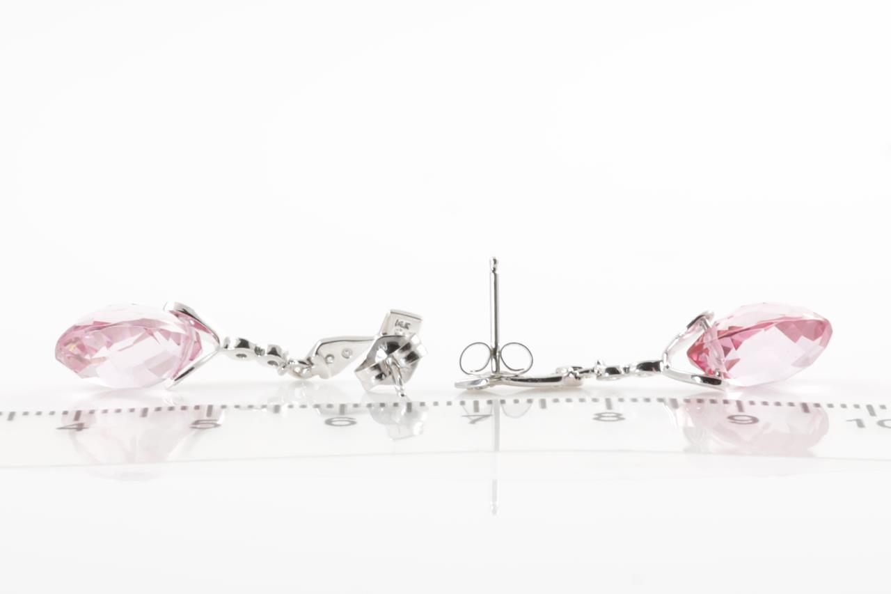 Topaz and Diamond Earrings with fancy cut pink Topaz totalling approximately 9.50cts and round Diamond totalling approximately 0.10cts. 14ct white gold. Weight 3.5g. (Pre-owned)