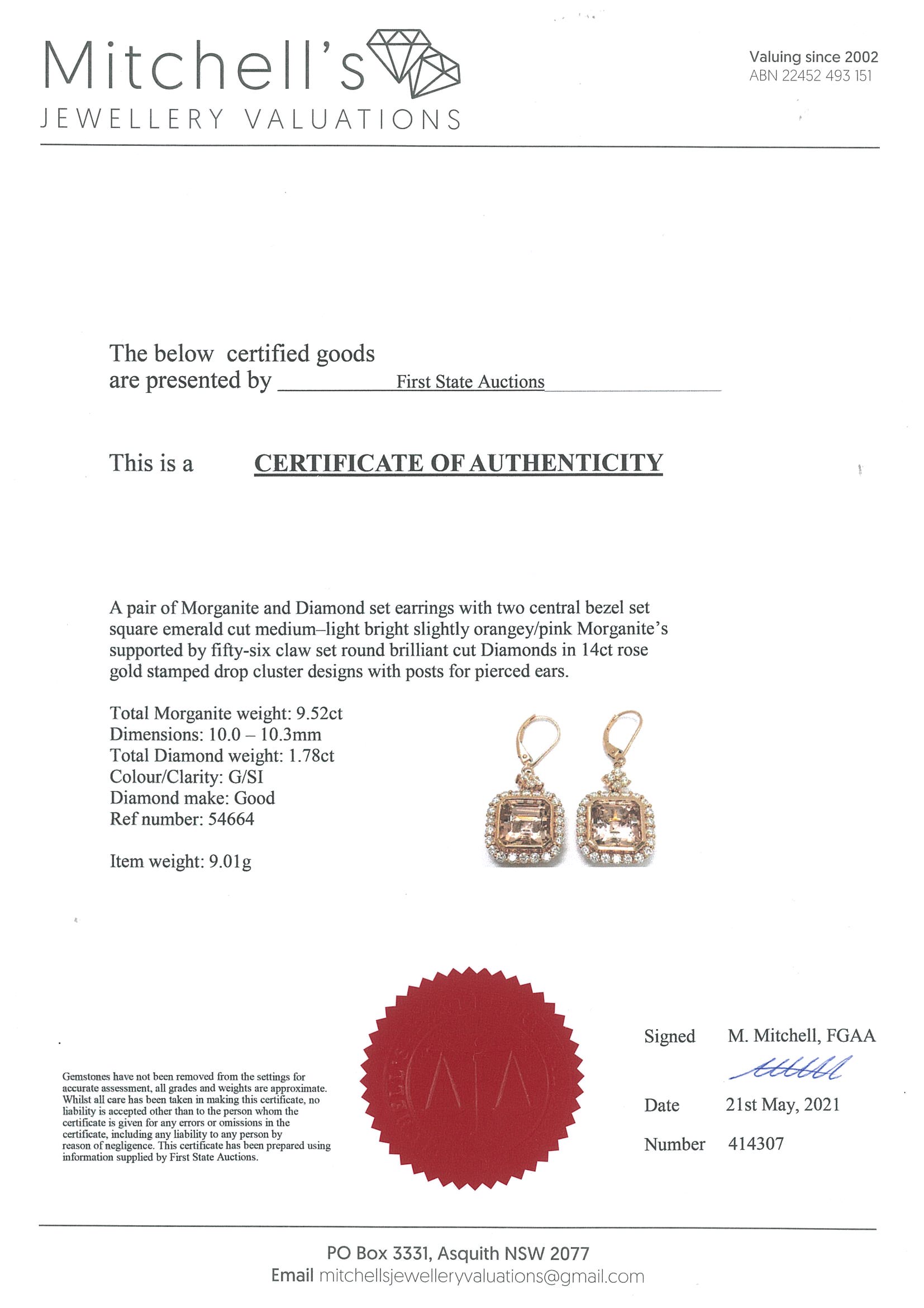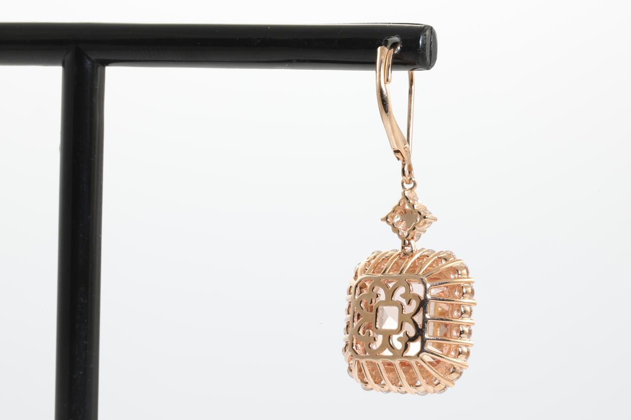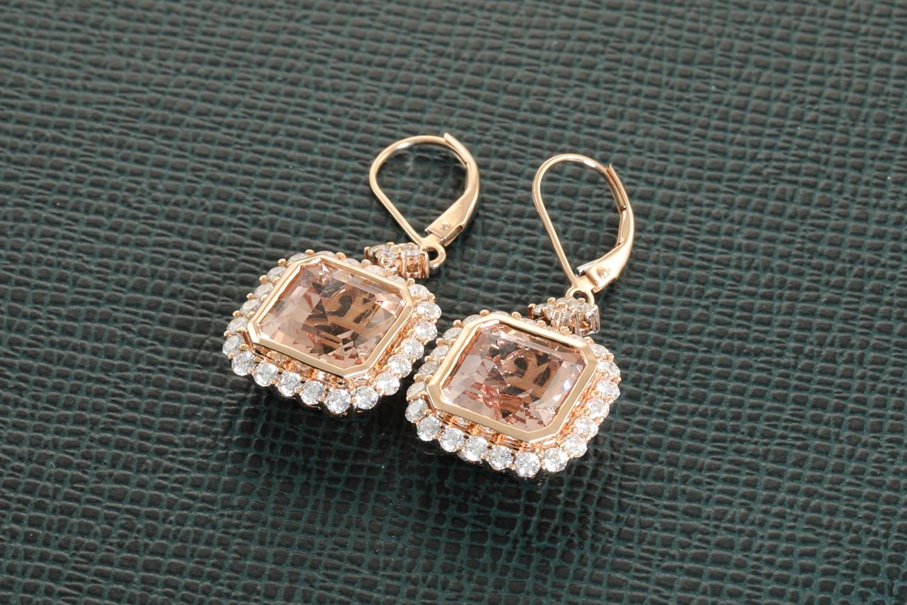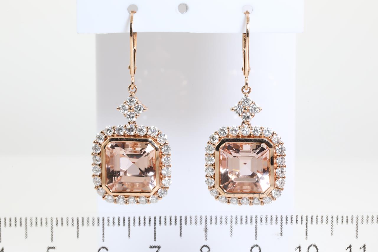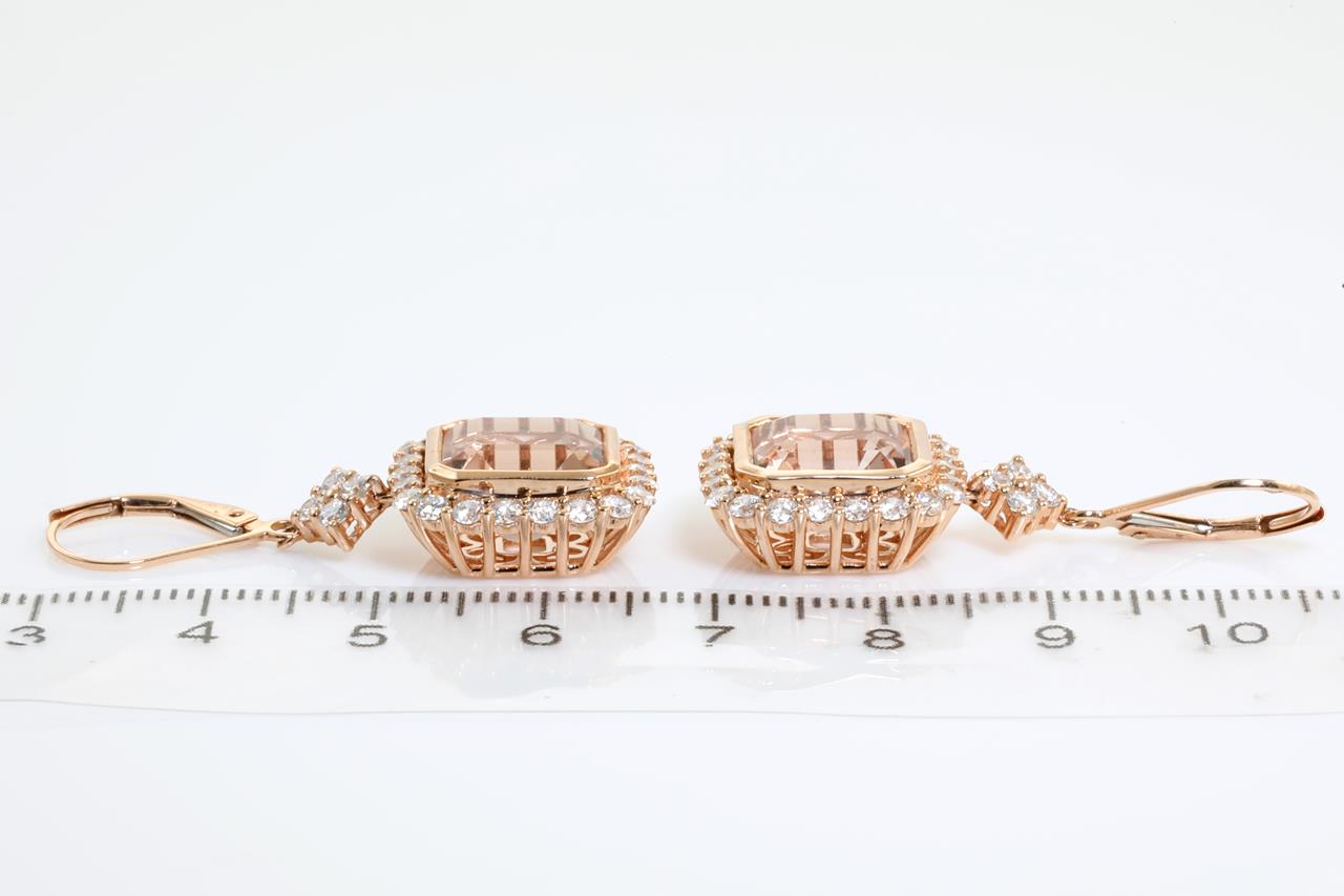 Morganite and Diamond earrings with emerald cut Morganites totalling 9.52cts and Diamonds totalling 1.78cts (Estimated grading: G SI). 14ct rose gold. With certificate #414307. Weight: 9g. (New)