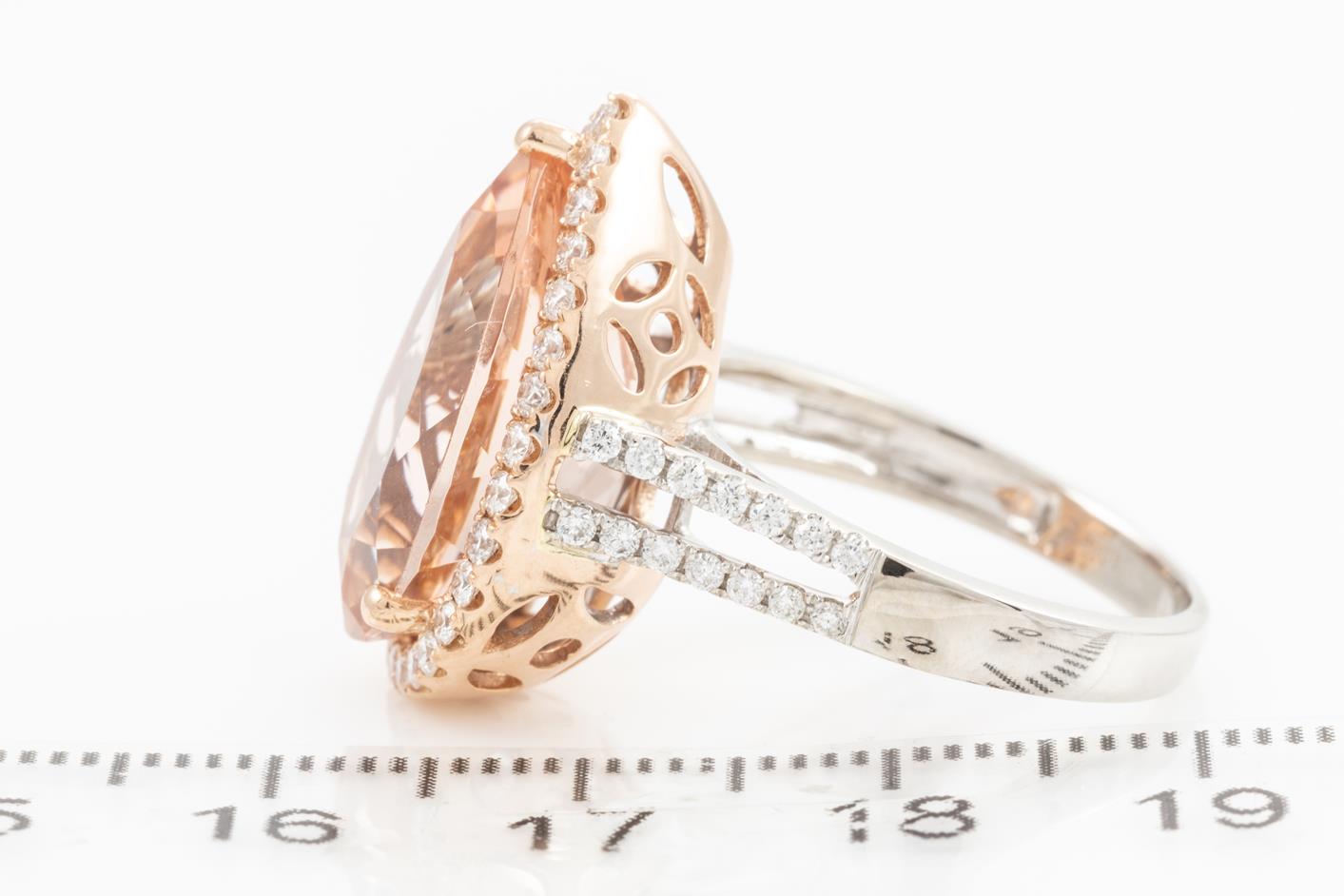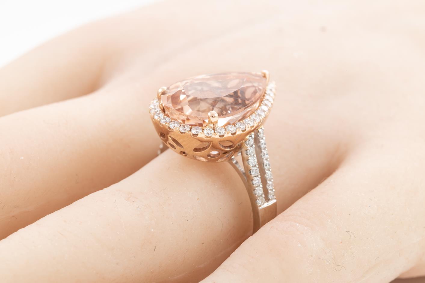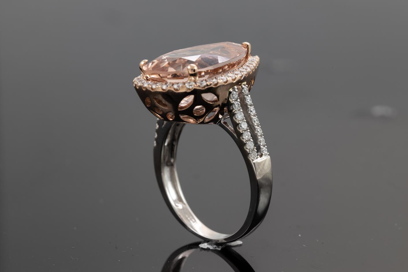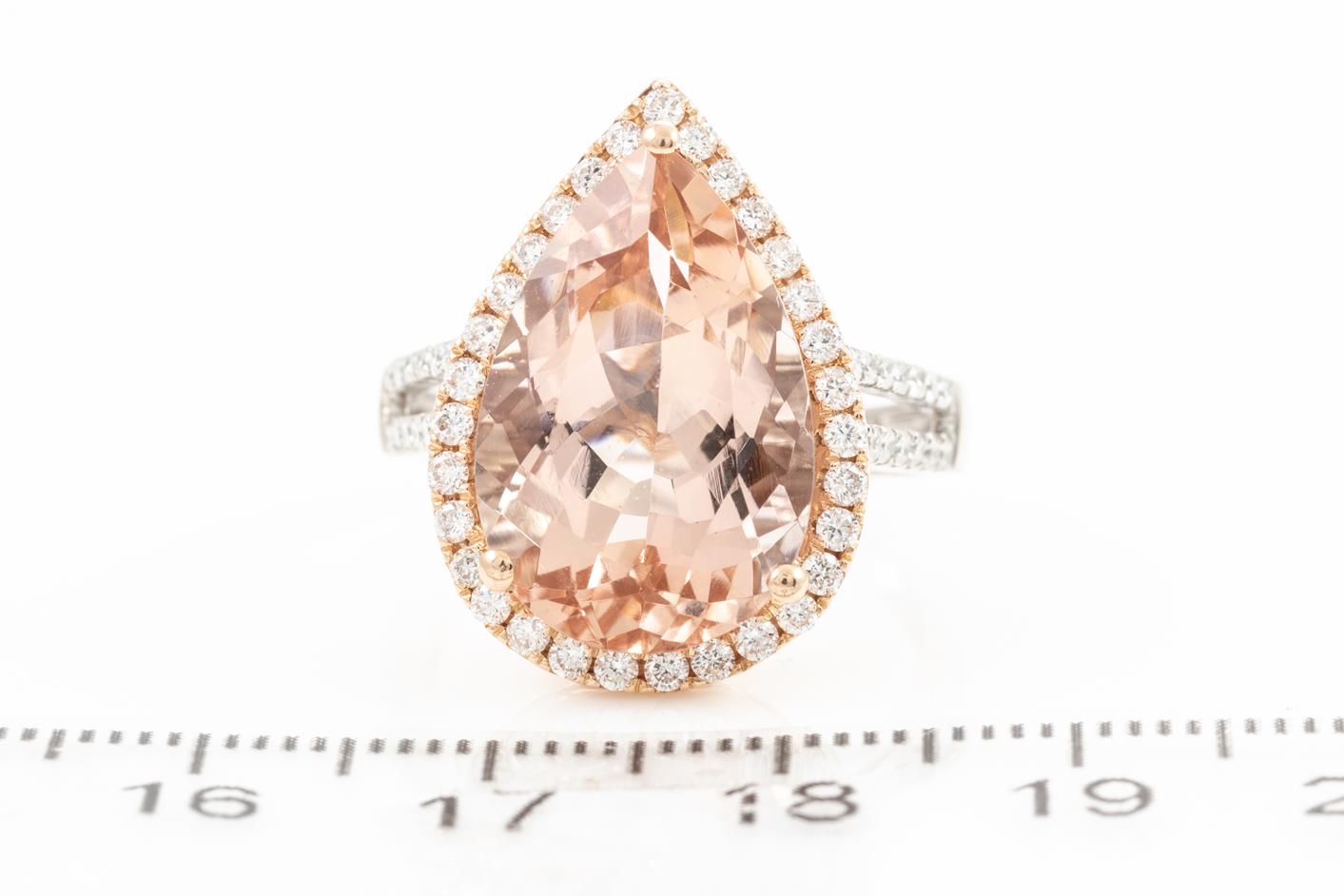 Morganite and Diamond ring with pear shape Morganite of 9.58ct and round Diamodns totalling 0.70cts (Estimated grading: H SI). 14ct rose gold and white gold. Ring size P, note: ring resizing is not recommended. Weight: 7.6g. (As new)