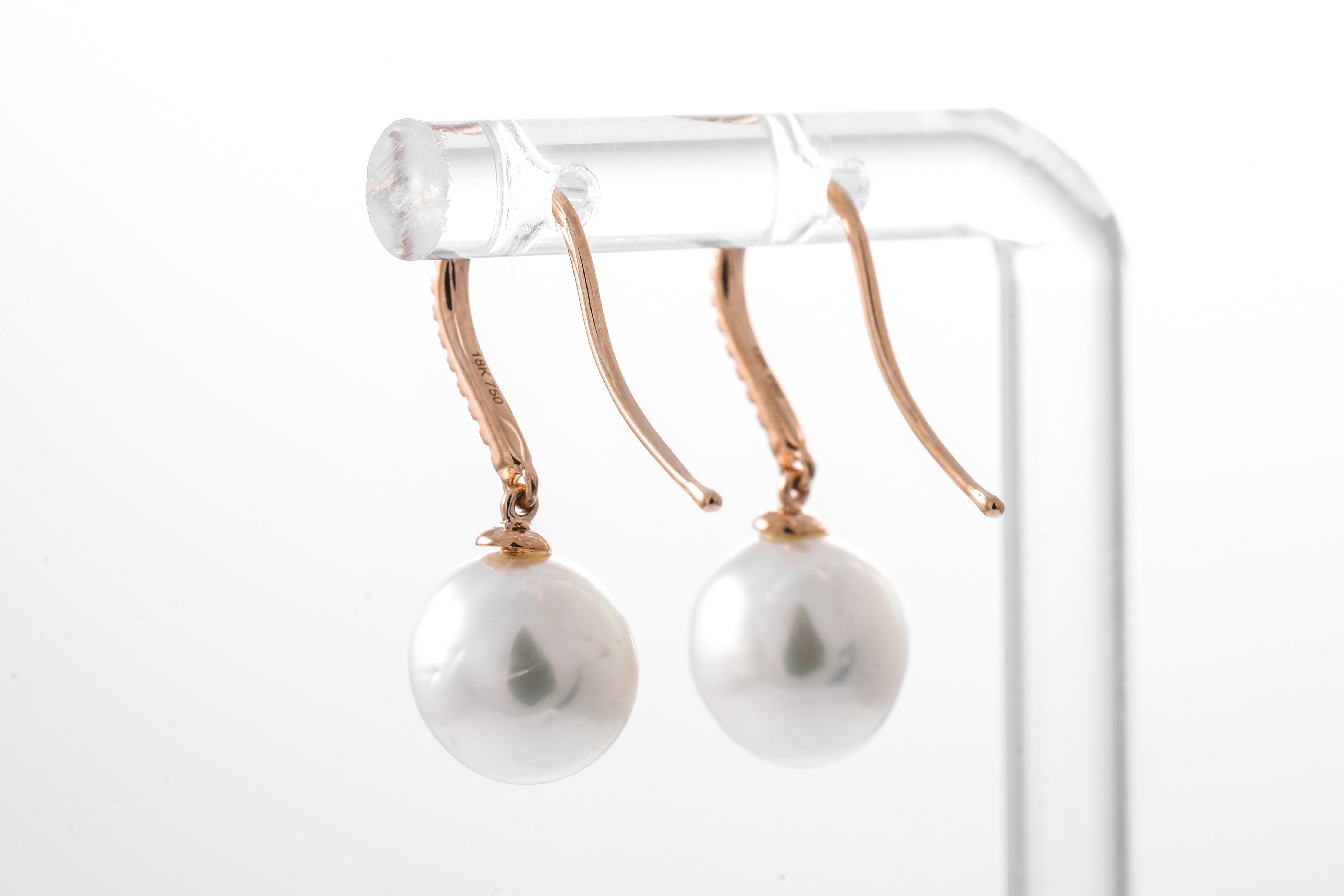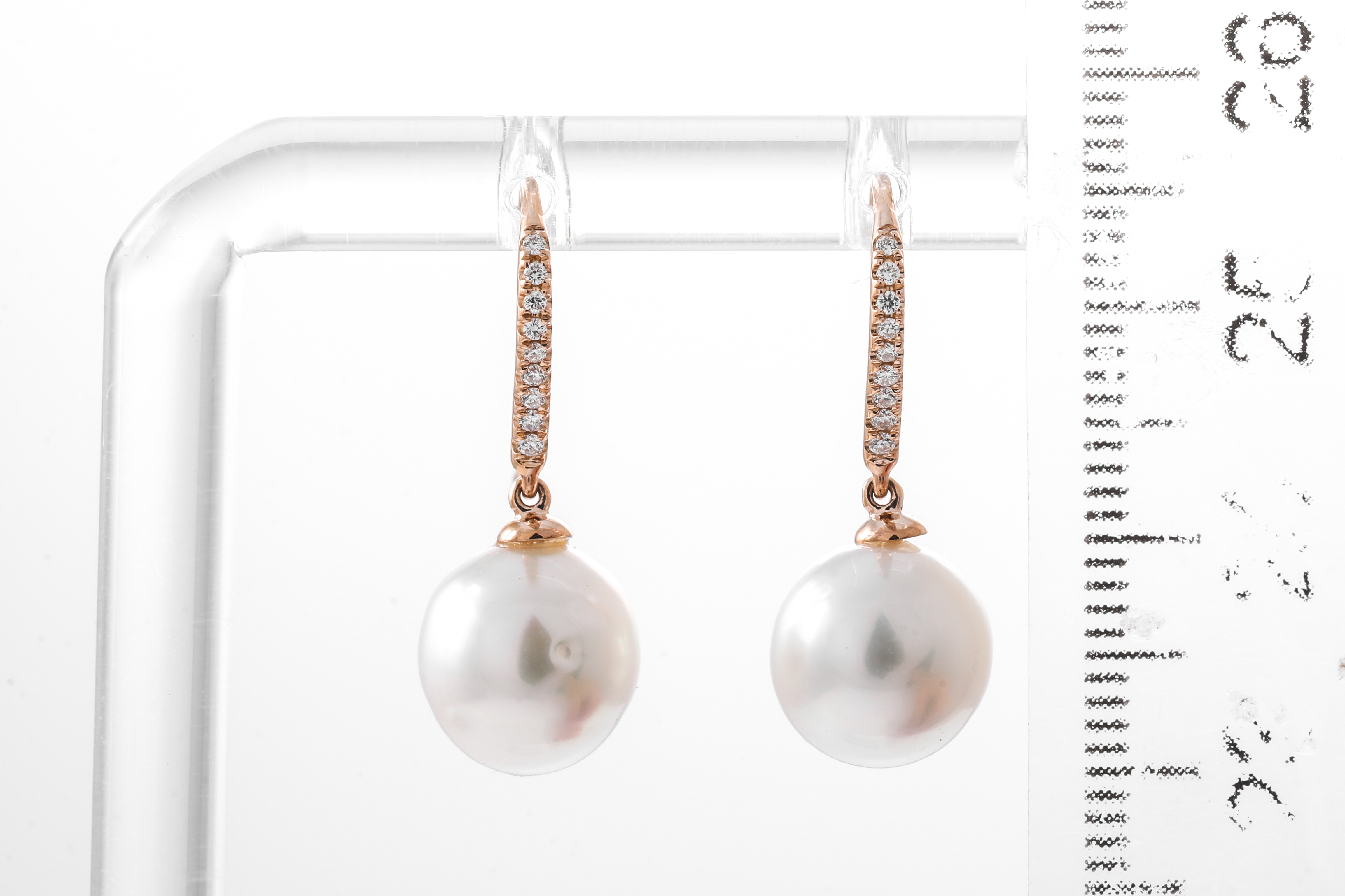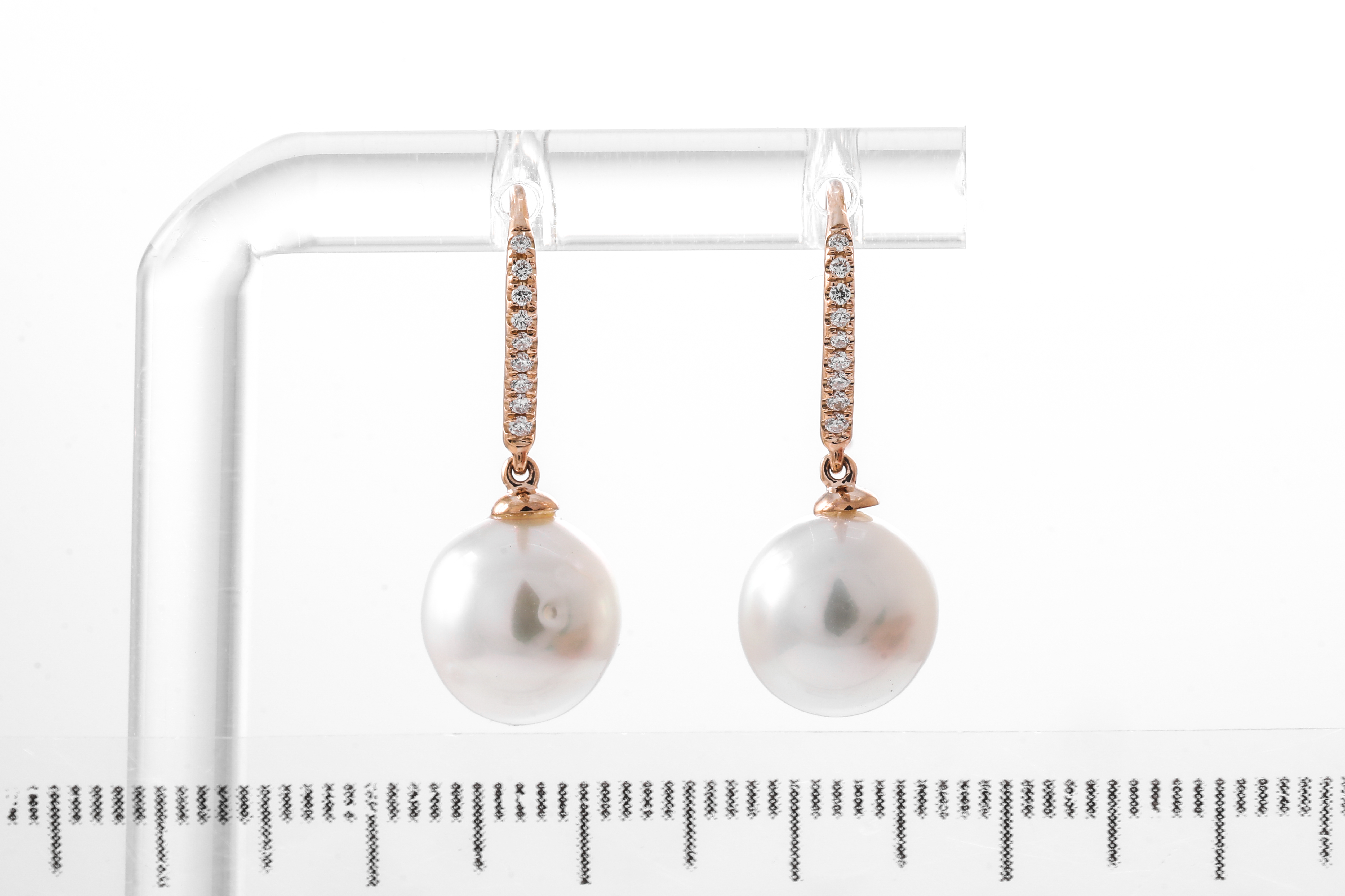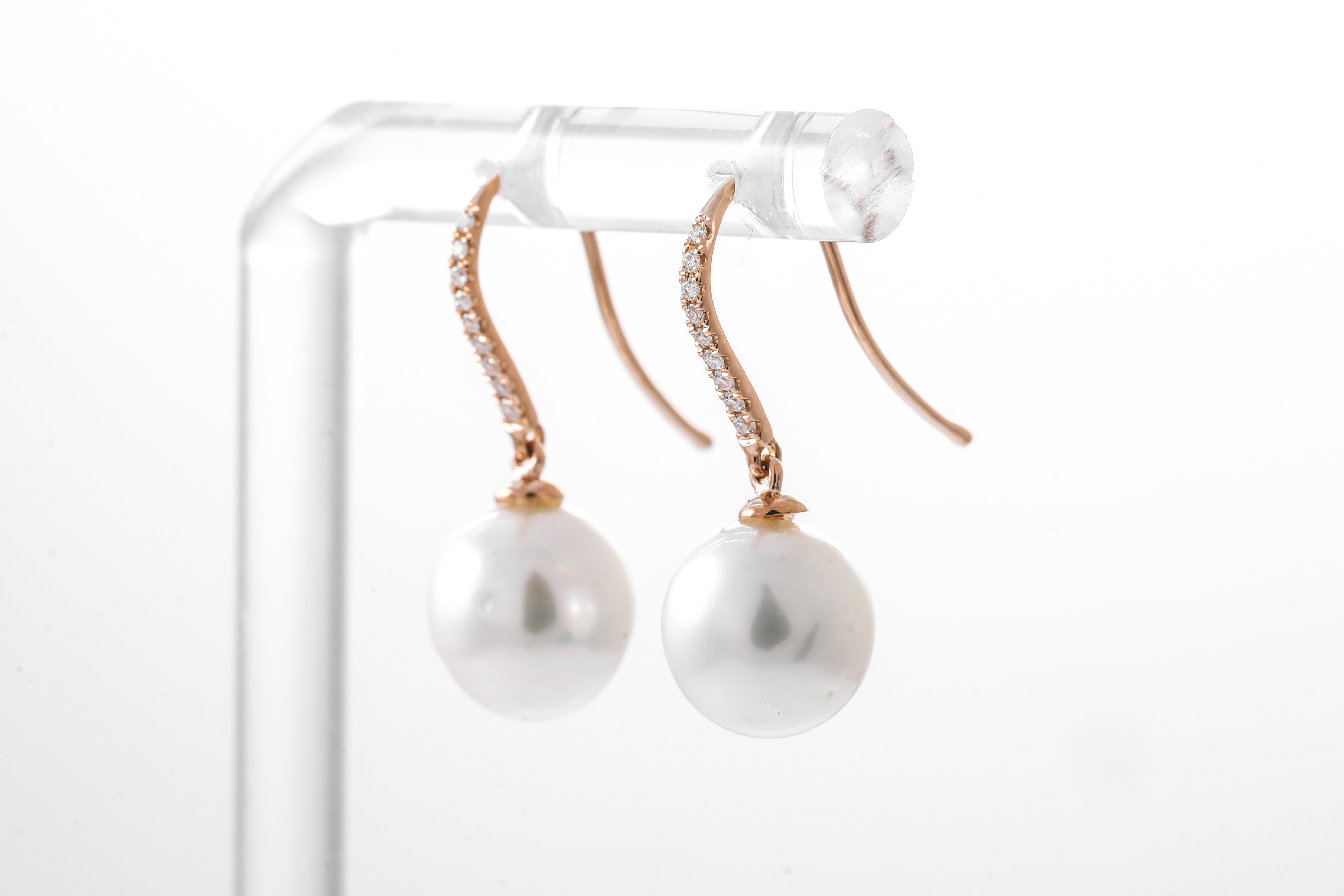 Pearl shepherds hook earrings with South Sea pearls of 9.5mm and diamonds totalling 0.20cts. 18ct rose gold. Weight: 3.6g. (New)