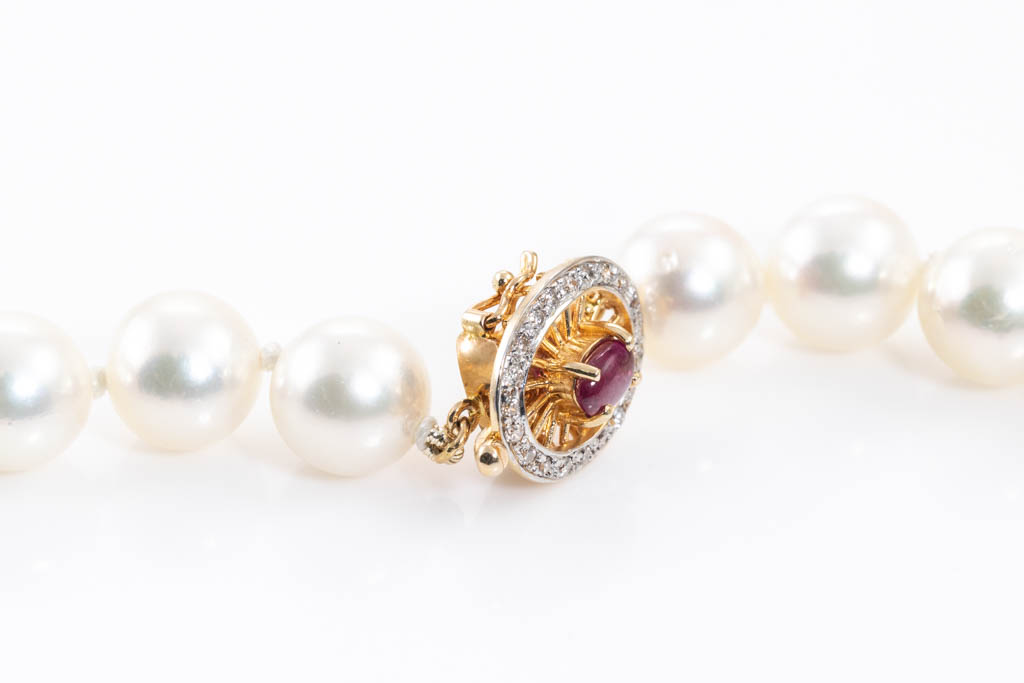 Pearl and Diamond necklace with 44 South Sea Pearls of 9.0mm - 9.5mm. 14ct yellow gold clasp set with oval shape Ruby of 0.41ct and round Diamonds totalling 0.17cts. Length: 45cm. Weight: 52.7g. (Pre-owned)