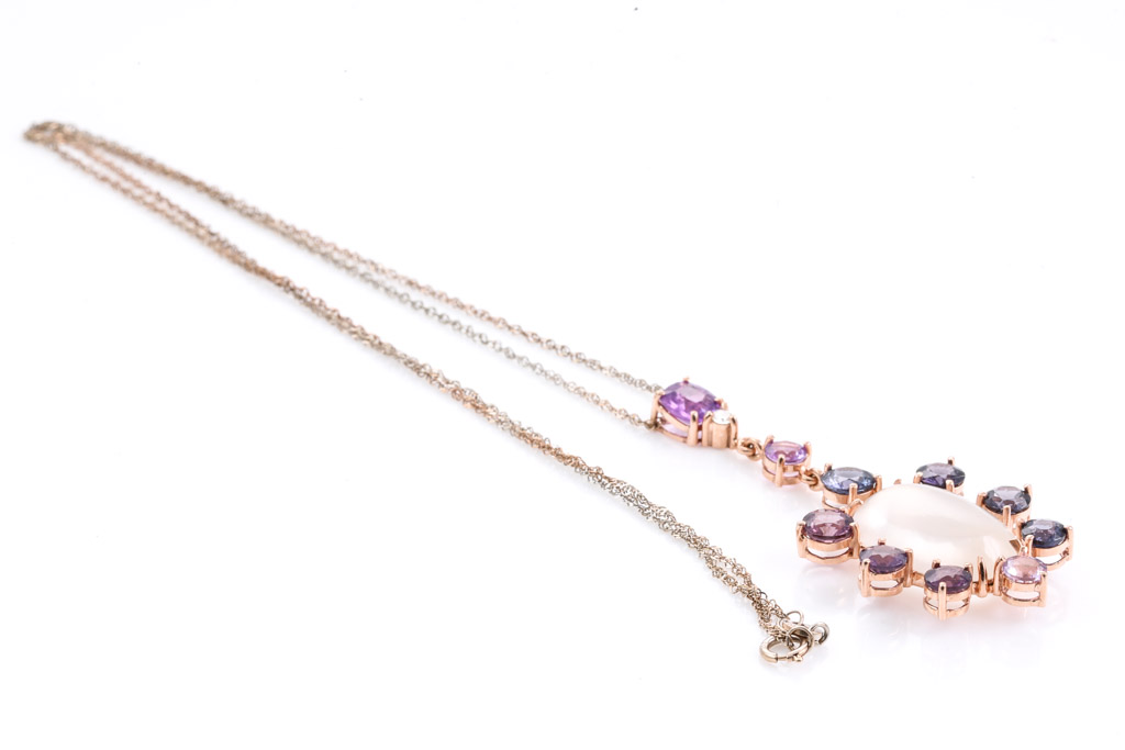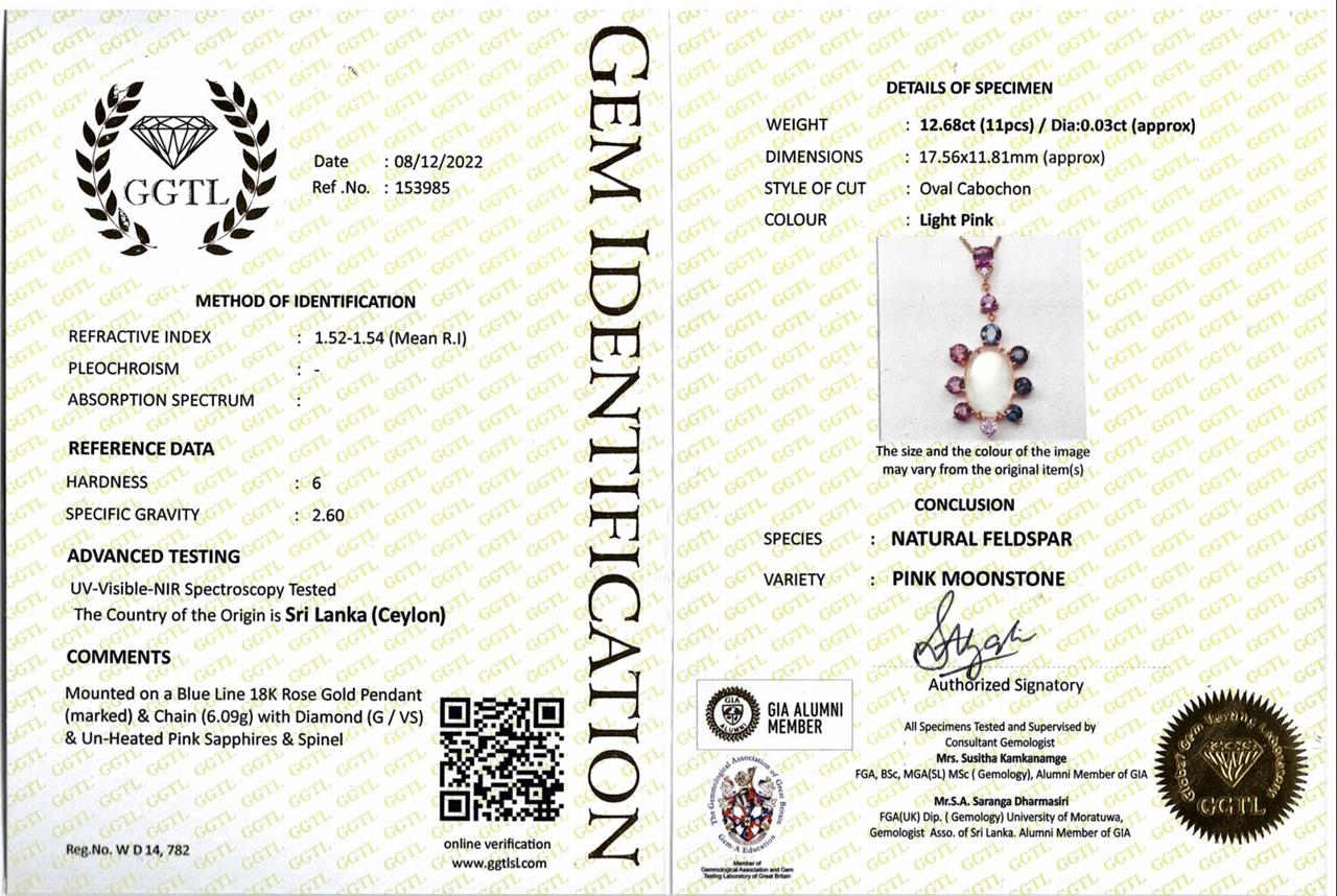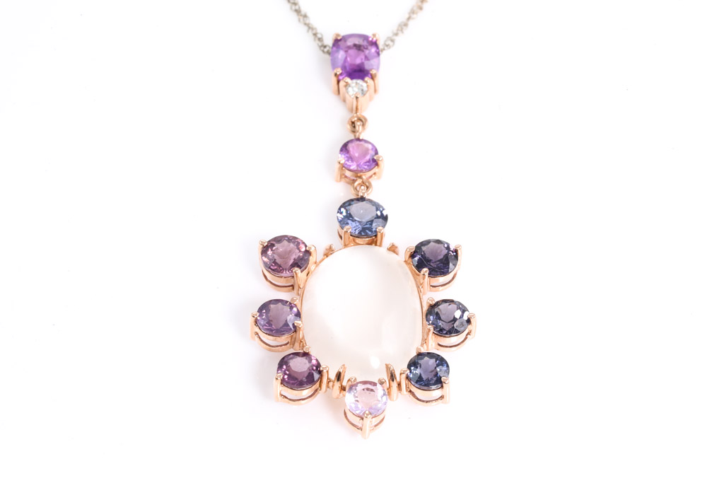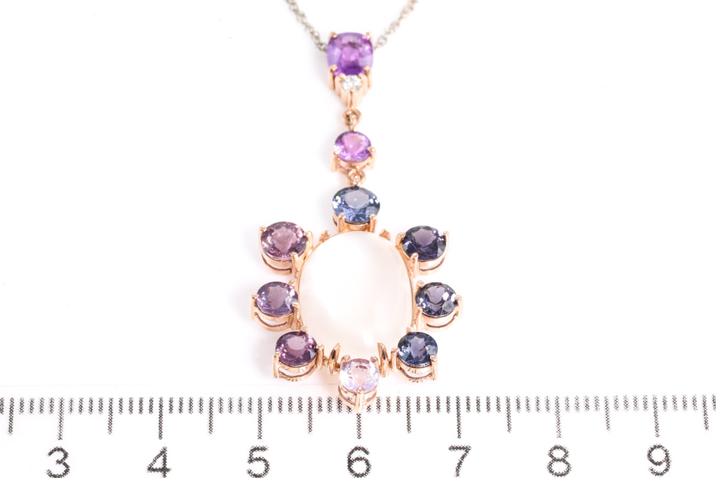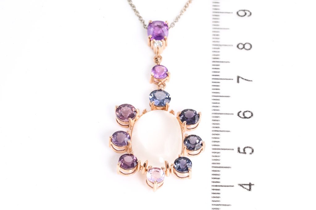 Moonstone and Sapphire pendant with cabochon oval cut Moonstone of approximately 9.64cts, cushion cut un-heated purple Sapphire of approximately 0.66ct, round blue & purple-pink unheated Spinels totalling approximately 2.38cts and a round Diamond of approximately 0.03ct. 18ct rose gold. Pendant weight 5.2g. With 18ct white and yellow gold chain. Chain weight 0.85g. Total weight 6.1g. With gem report 153985. (As New)