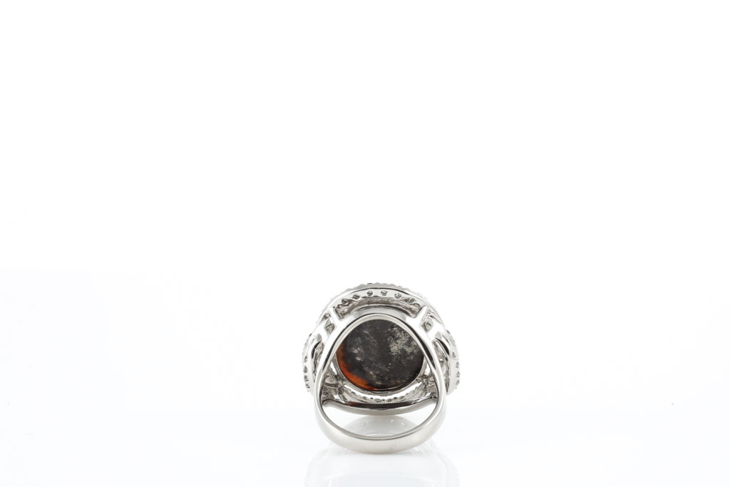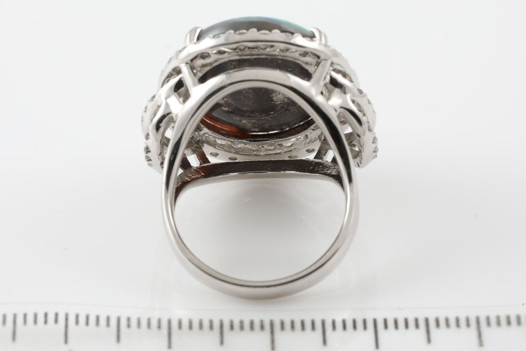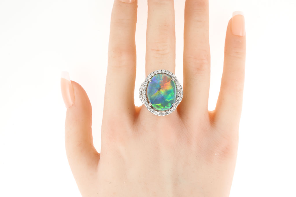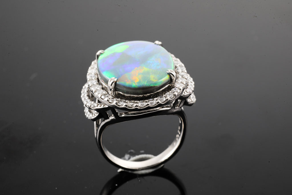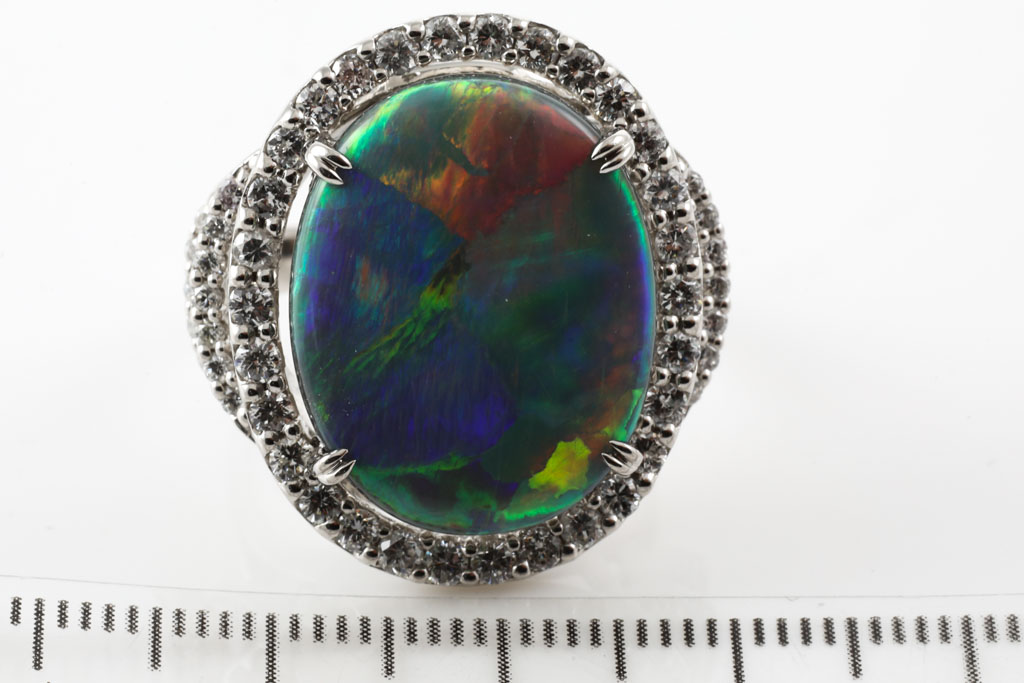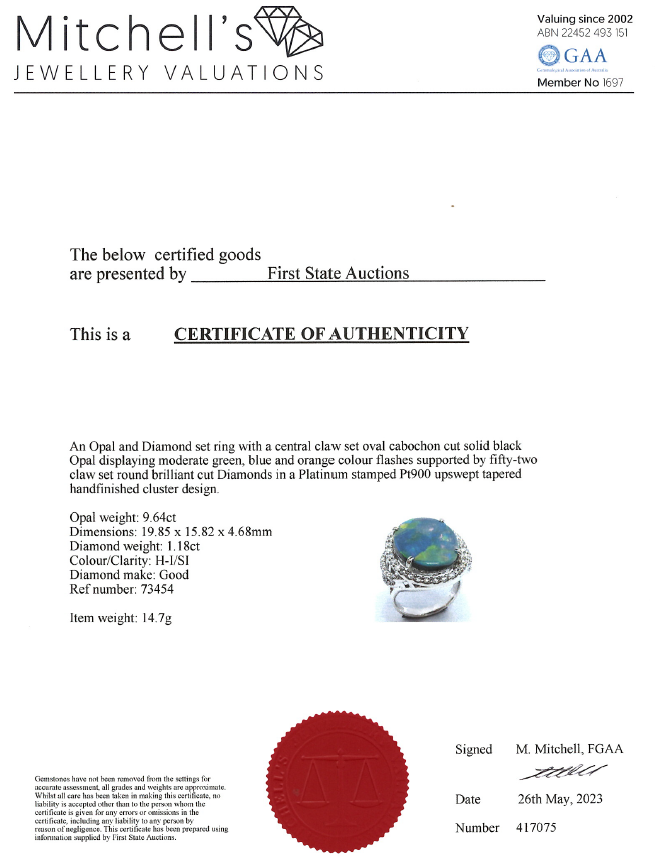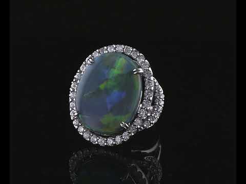 Opal and Diamond ring with cabochon cut oval shape solid Black Opal of 9.64ct and round Diamonds totalling 1.18cts (Estimated grading: H-I SI). Platinum - 900. Ring size M. Weight: 14.7g. With Certificate #417075. (Pre-owned)
