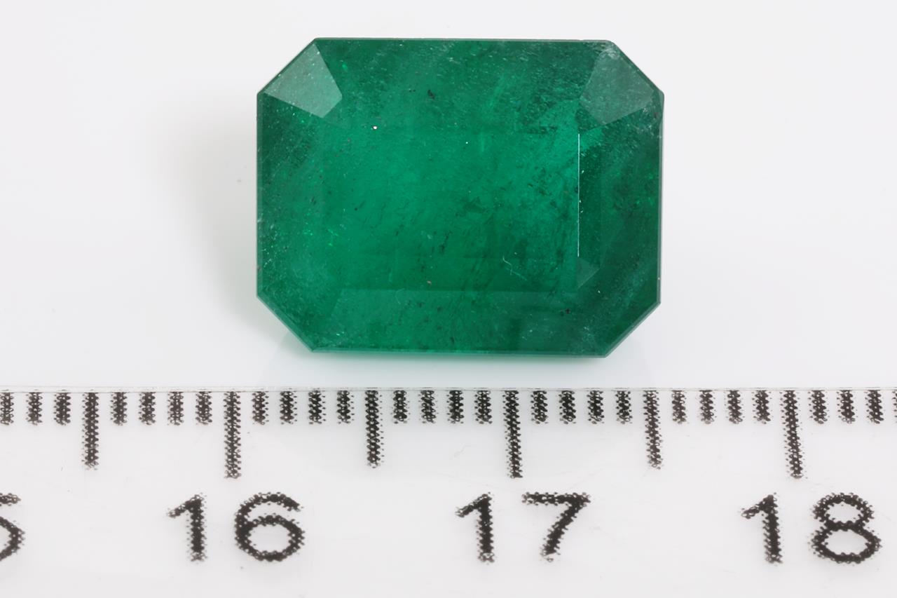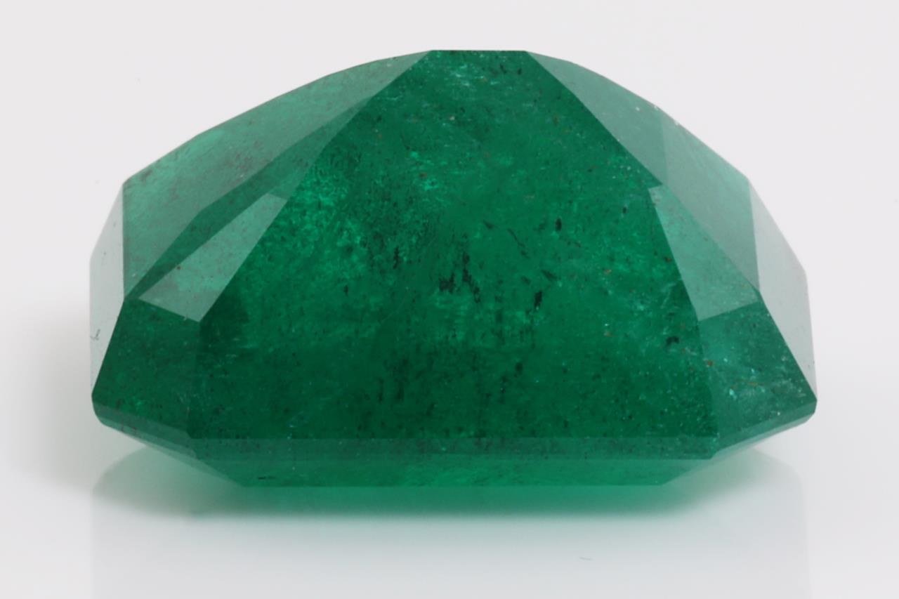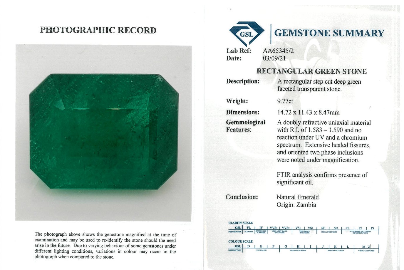 A loose Zambian emerald cut Emerald of 9.77ct (with GSL Gemstone summary report #AA65345/2). Dimensions: 14.72 x 11.43 x 8.47mm. (New)