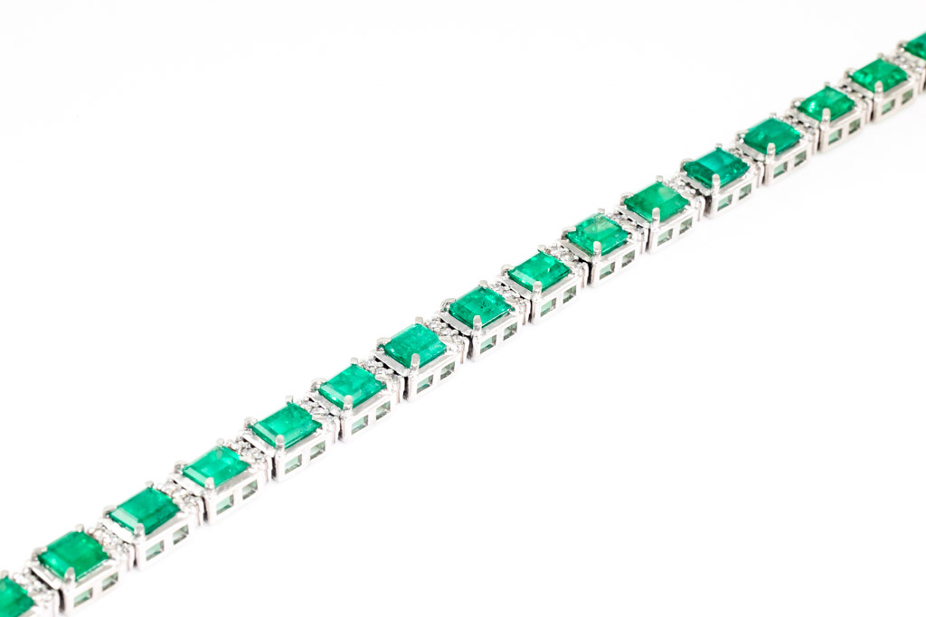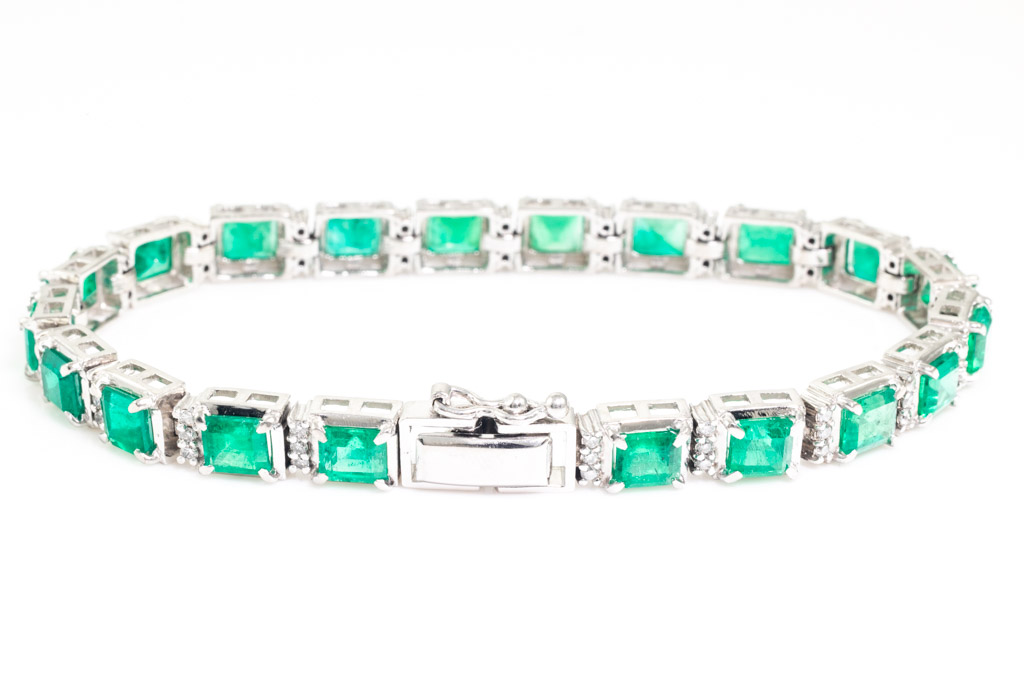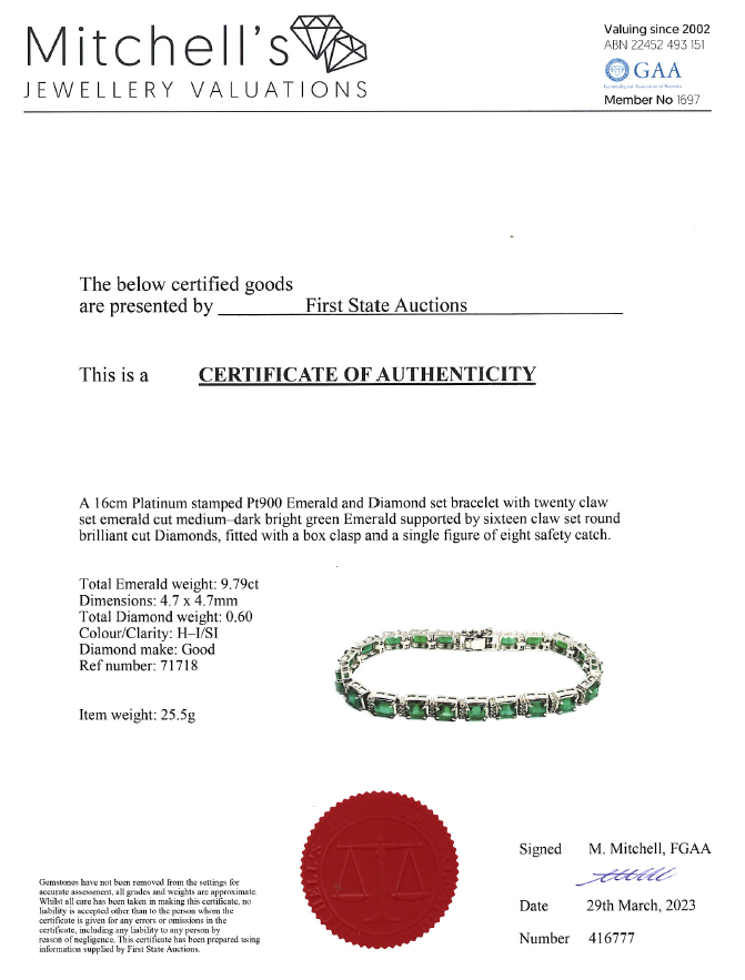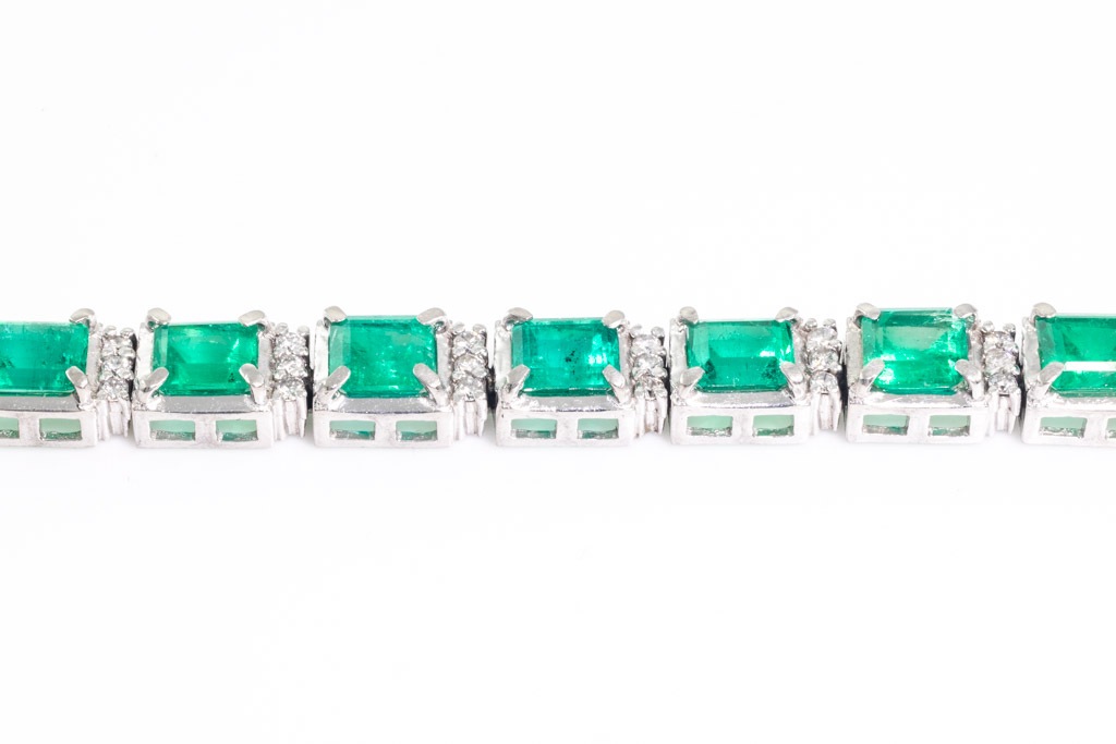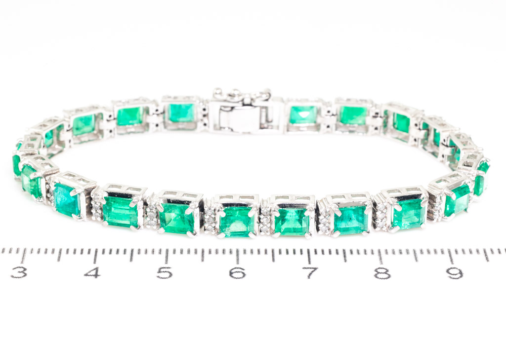 Emerald and Diamond bracelet with emerald cut Emeralds totalling 9.79cts and round Diamonds totalling 0.60cts (Estimated grading: H-I SI). Platinum. Length: 16cm. Weight: 25.5g. With Certificate #416777. (Pre-owned)