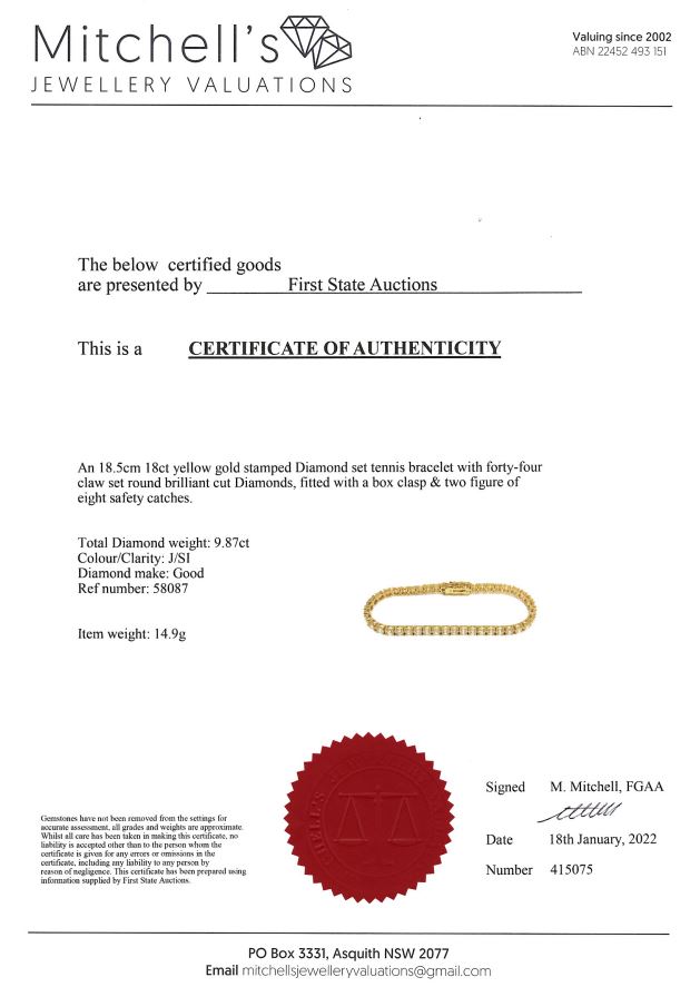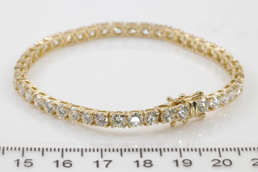Diamond tennis bracelet with 44 round Diamonds totalling 9.87cts (Estimated grading: J SI). 18ct yellow gold. Length: 18.5cm. Weight: 14.9g. With certificate #415075. (New)
