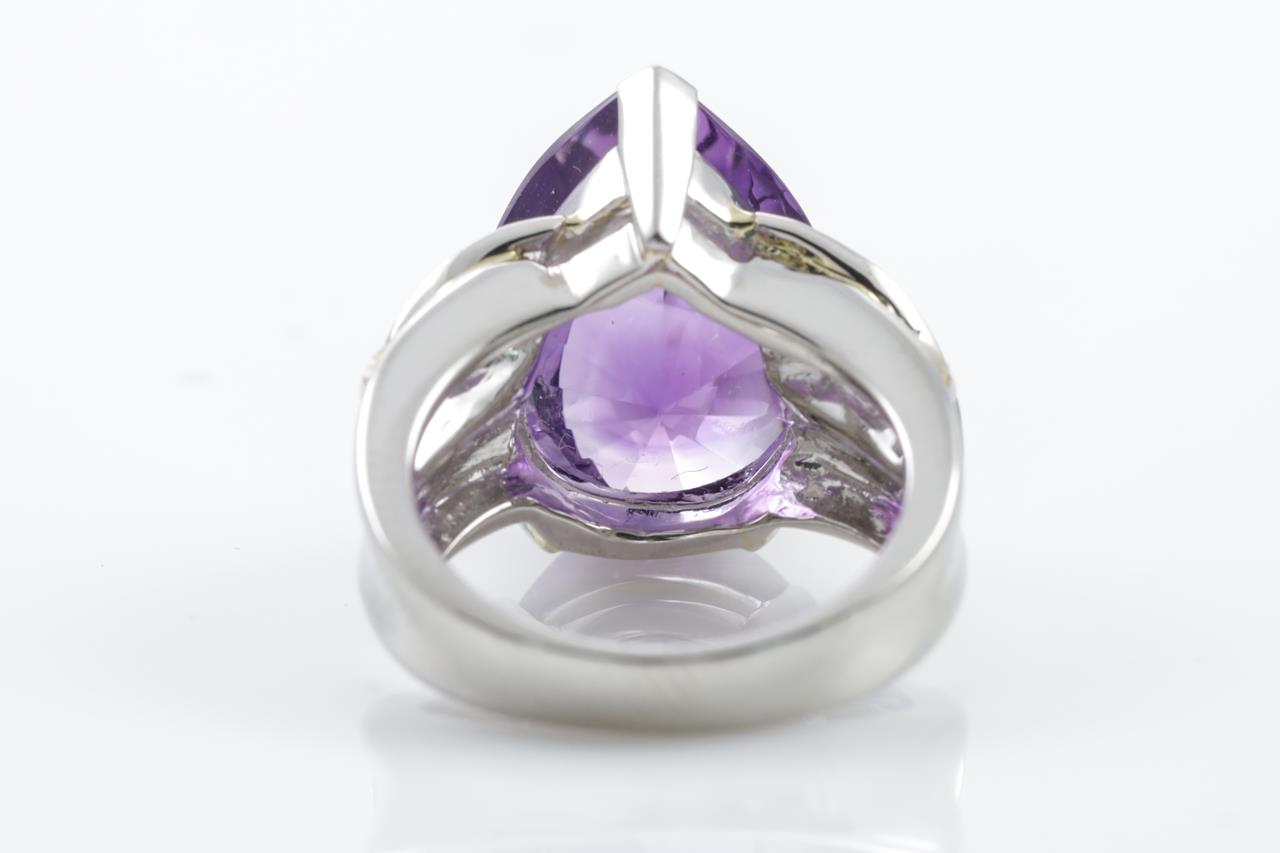 Amethyst and Diamond ring with centre fancy pear shape Amethyst of 9.89ct and round Diamonds totalling 0.28cts. Platinum. Ring size: K1/2 - ring resizing is not recommended. Weight: 15.8g. (Pre-owned)