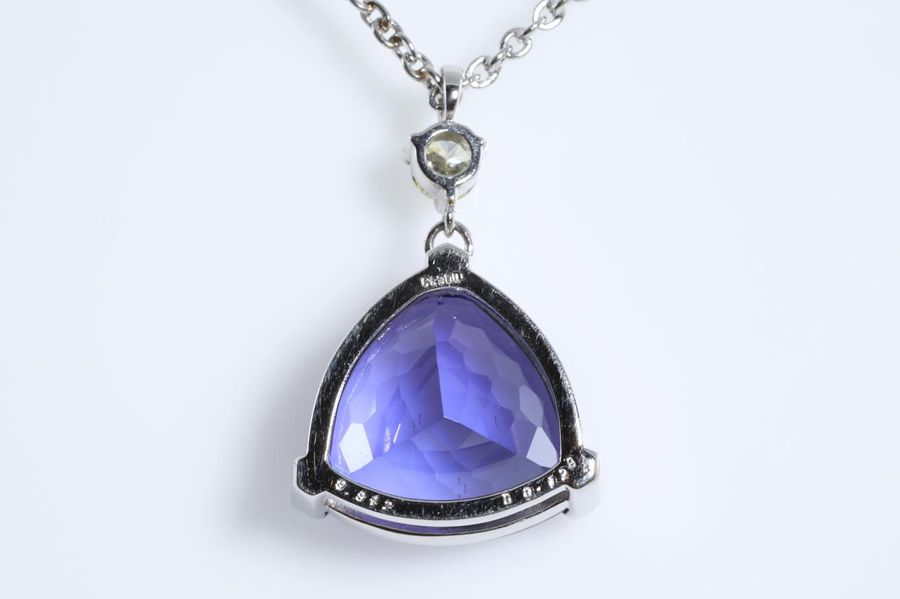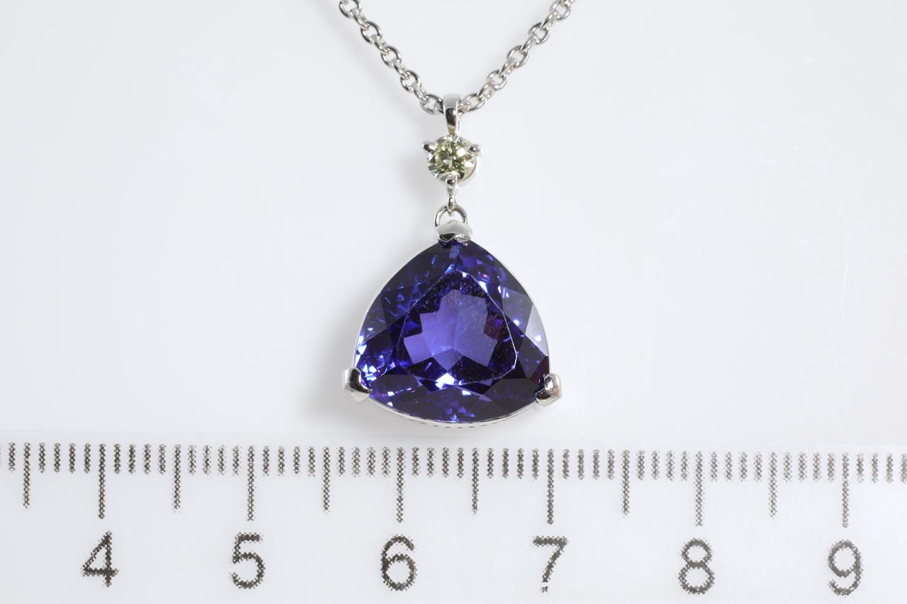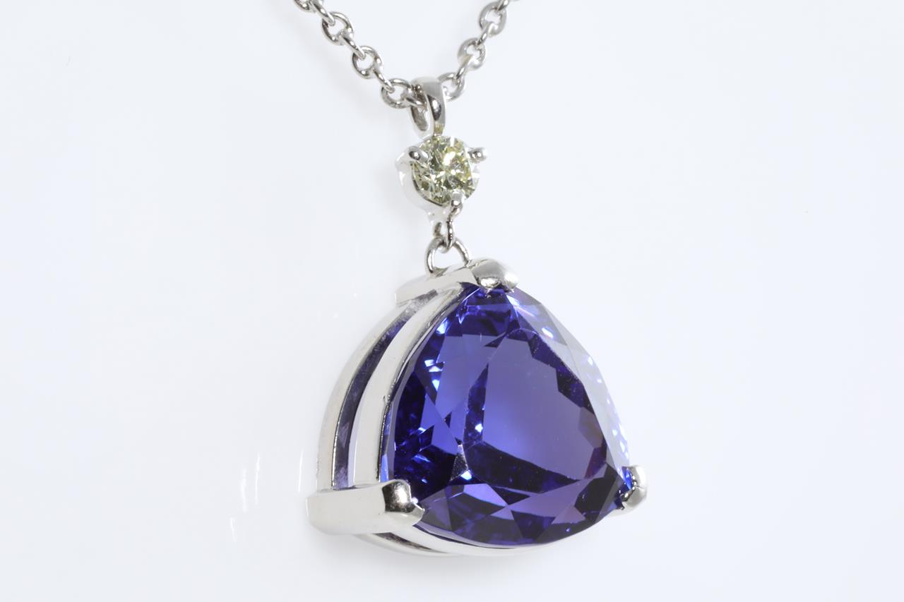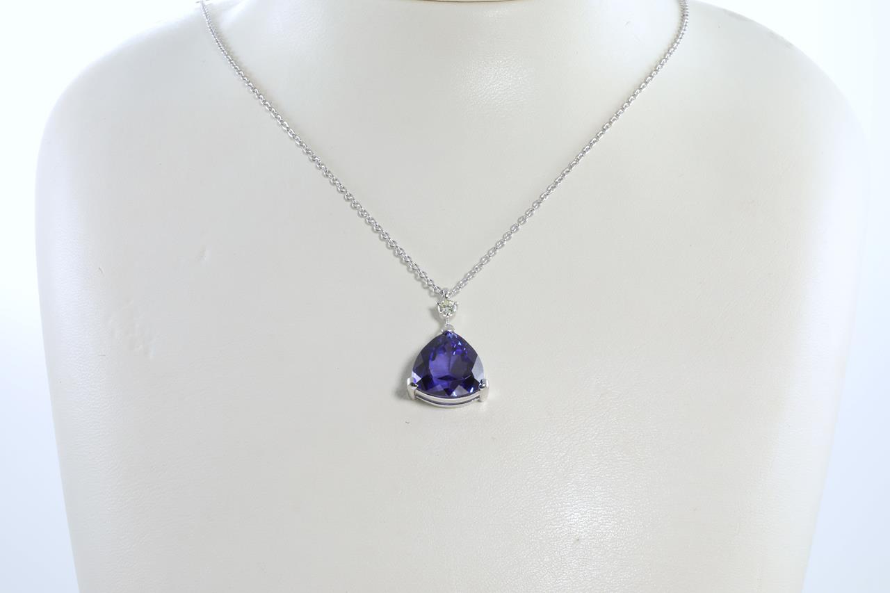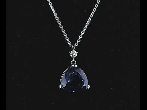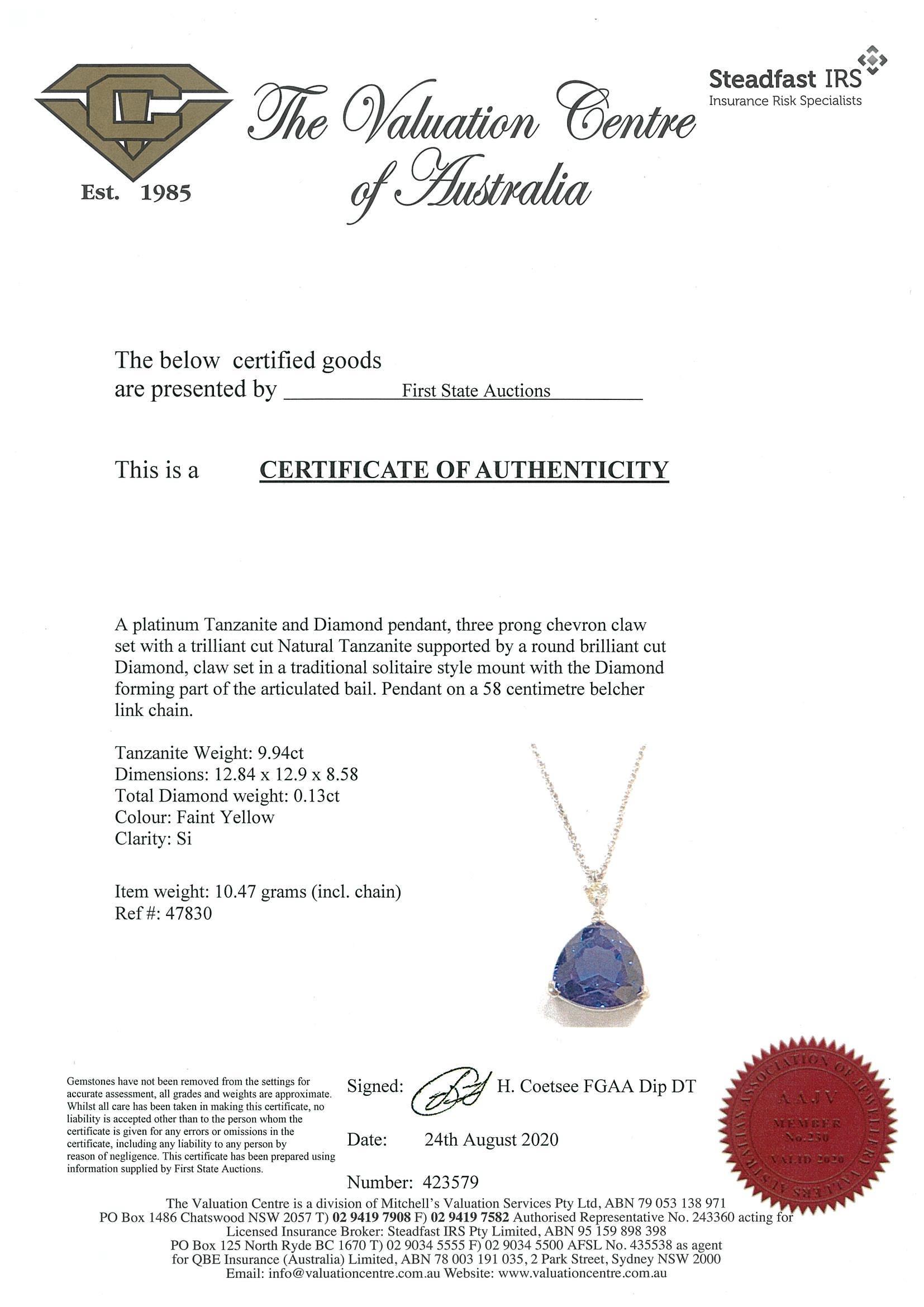 Tanzanite and Diamond pendant with trilliant cut Tanzanite of 9.94ct and a round Diamond of 0.13ct. Platinum with platinum 58cm chain. With Certificate #423579. Weight: 10.47g. (Pre-owned)