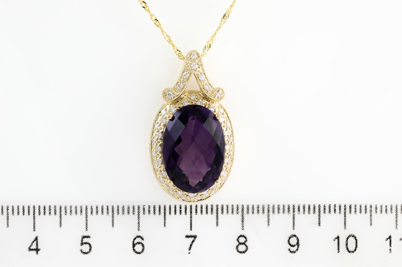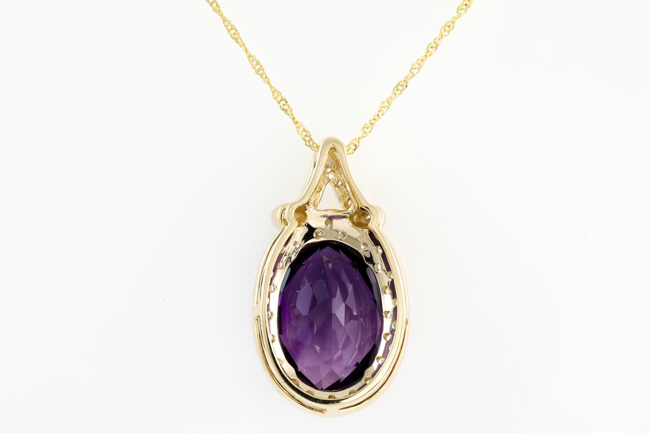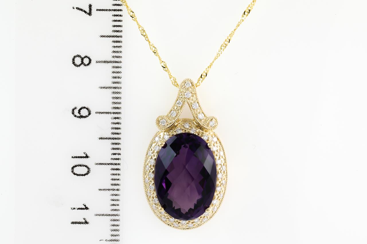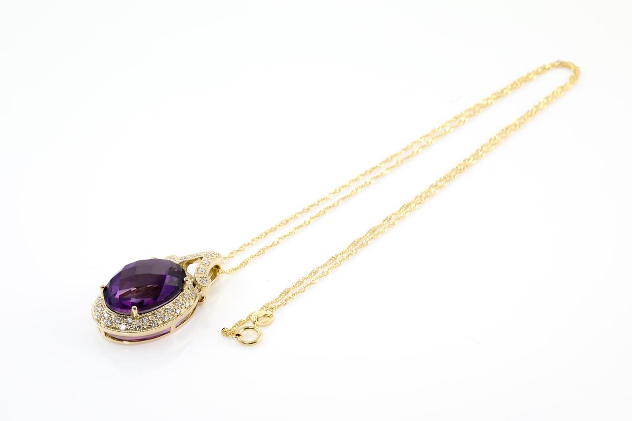 Amethyst and Diamond pendant with oval shape Amethyst of 9.96ct and Diamonds totalling 0.34cts (Estimated grading: G-H SI). 14ct Yellow gold with 18ct gold 45cm chain. Weight: 6.7g (New)