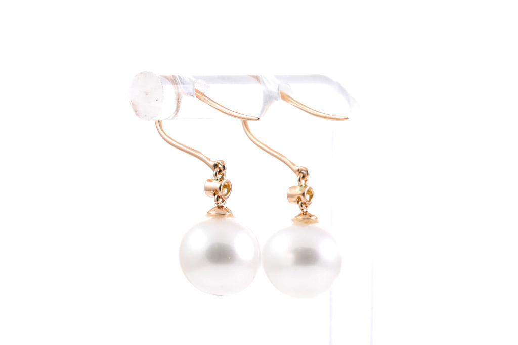 Pearl shepherds hook earrings with off round South Sea pearls of 9.9mm and round Diamonds totalling 0.04cts. 18ct rose gold. Weight: 3.9g. (New)