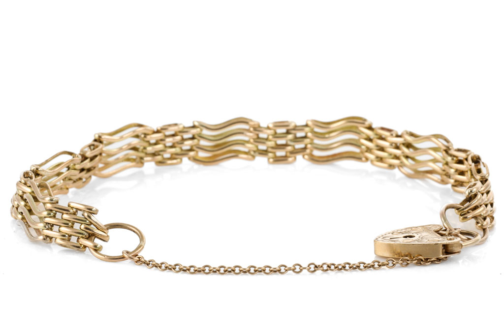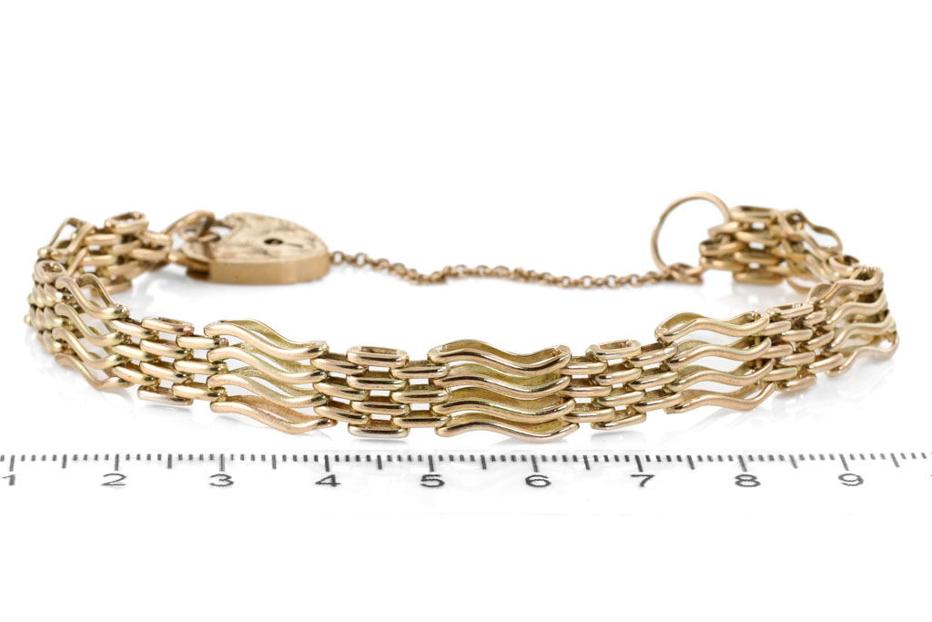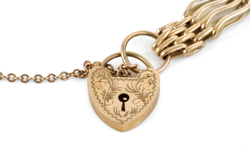 9ct yellow gold fancy link bracelet with heart padlock clasp. Length: 18.5cm. Weight: 17.7g. (Pre-owned)