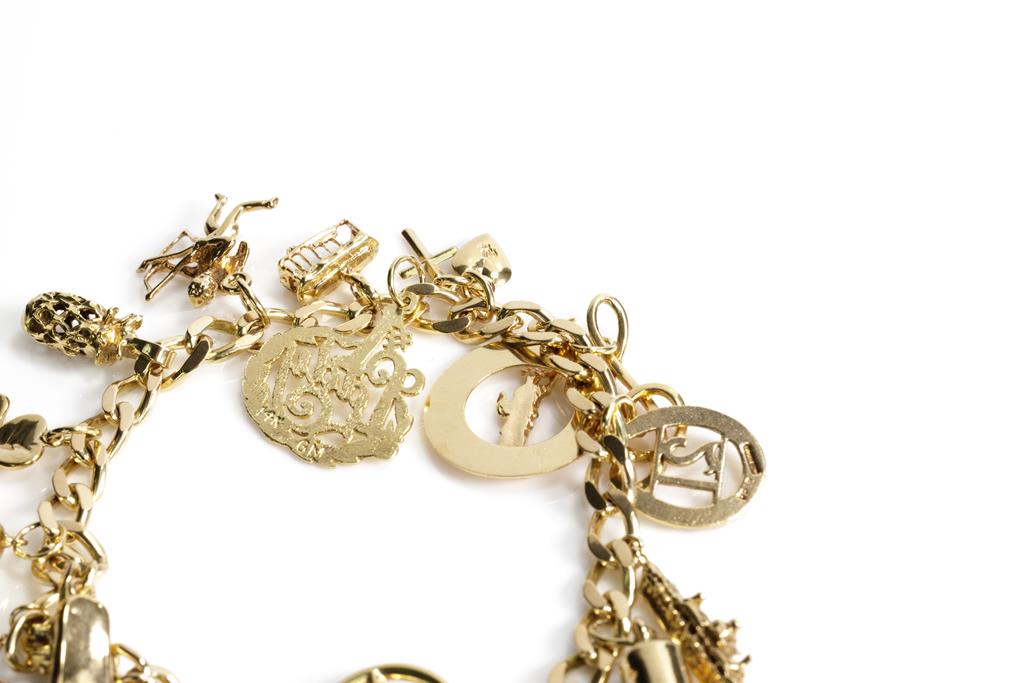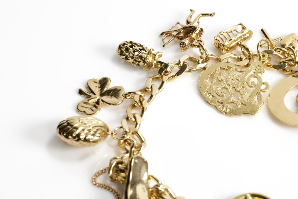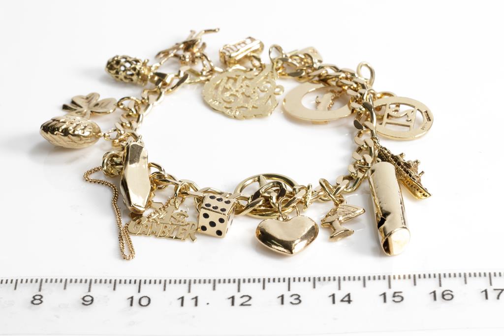 Gold charm bracelet with 9ct curb links chain and various gold charms. 9ct and 14ct yellow gold. Length: 17cm. Weight 29.5g. (Pre-owned)