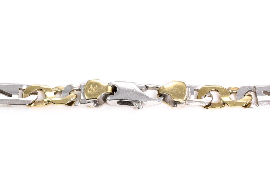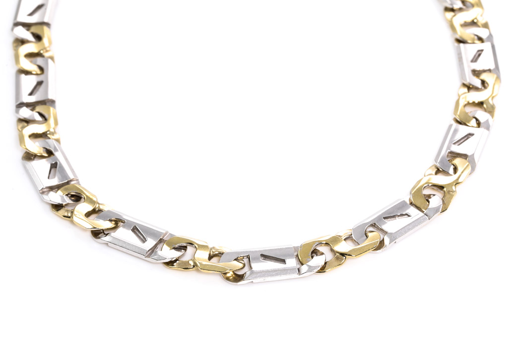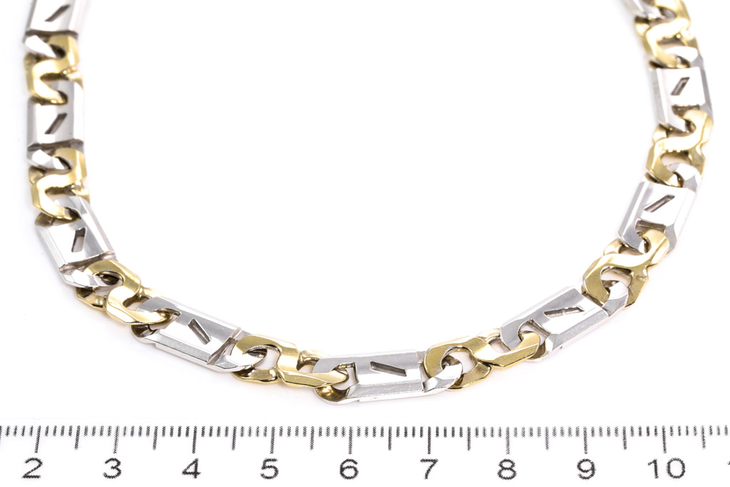 Mens gold chain. 9ct white gold and yellow gold. Length 56cm. Weight 60.7g. (Pre-owned)